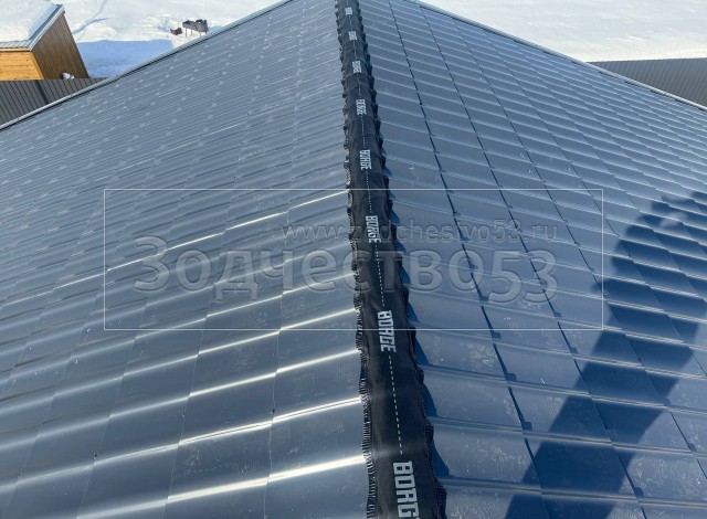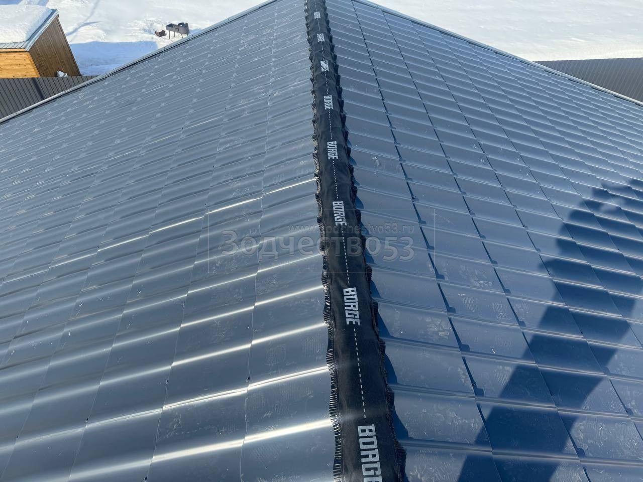 • Фронтоны по 4.0 метрам : Каркасно-щитовые (Камерной сушки), снаружи обшиваются Имитацией бруса ( Заводская покраска . Цвет 7021 ) крепится на пневмо инструмент ) и внутри обшивается Вагонкой ( крепится на пневмо инструмент )