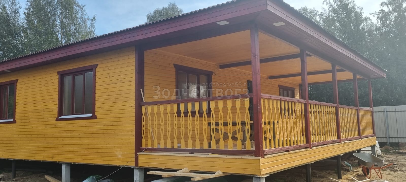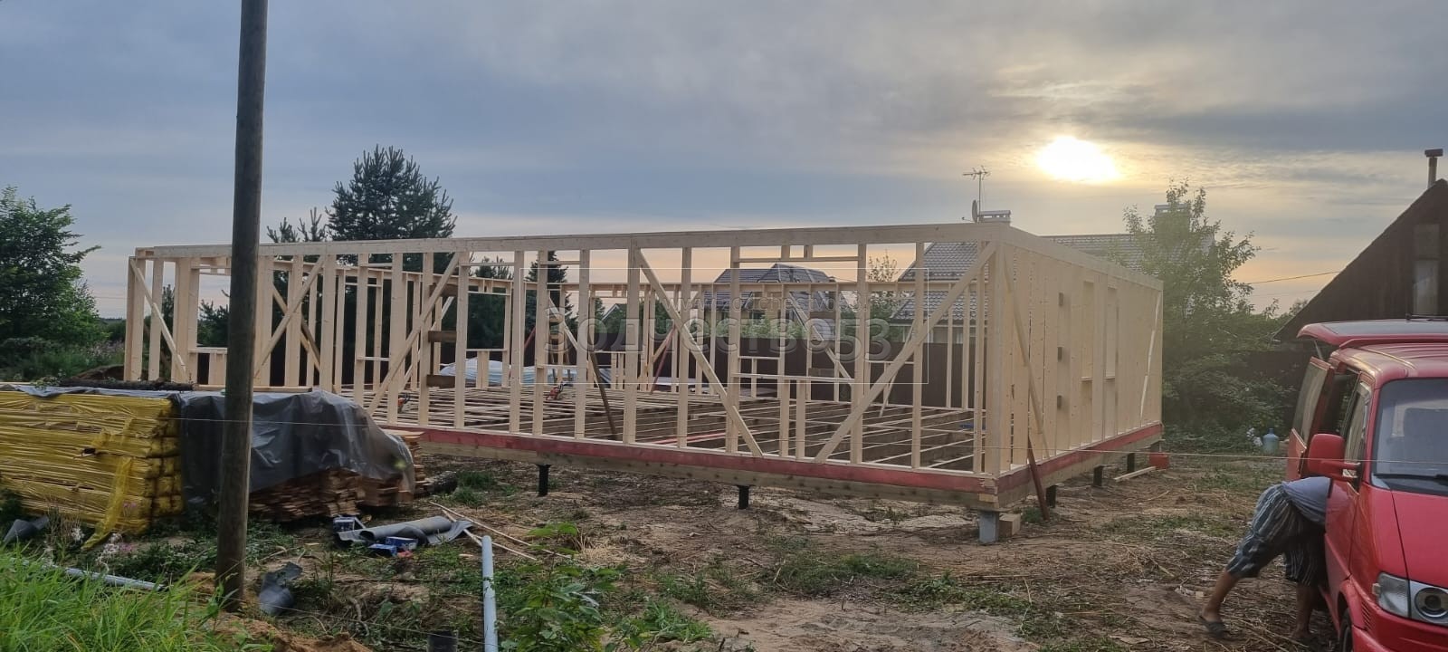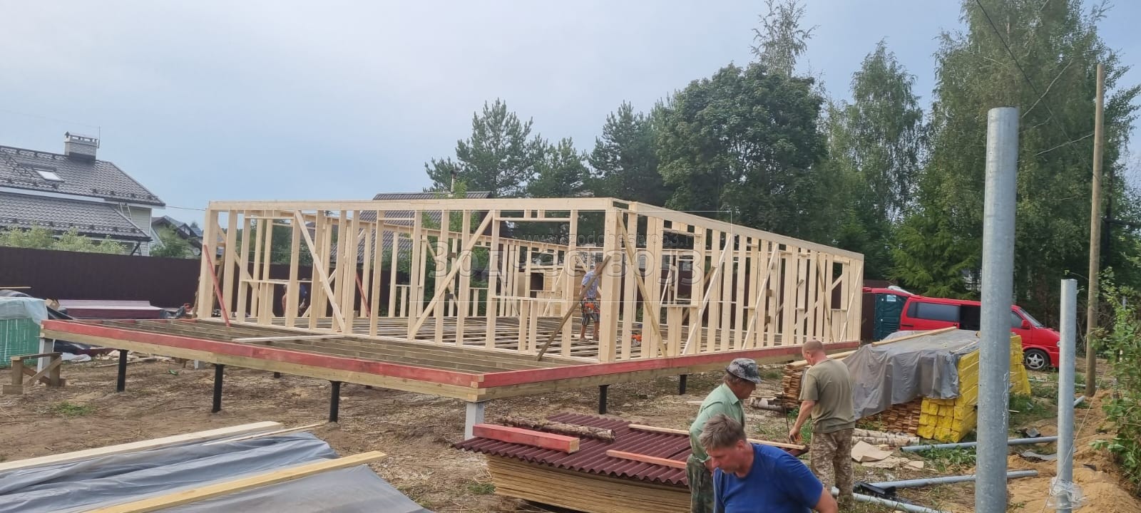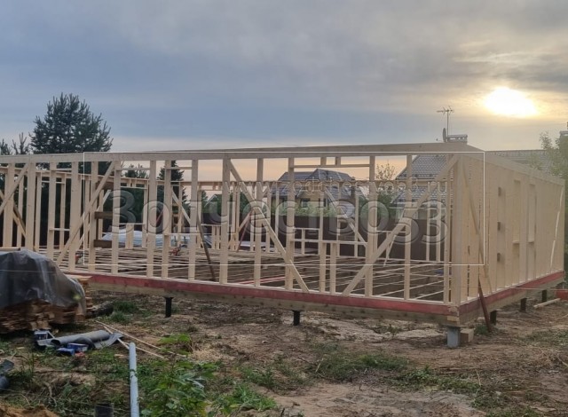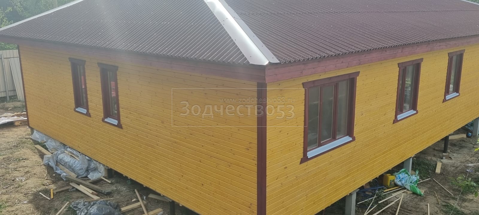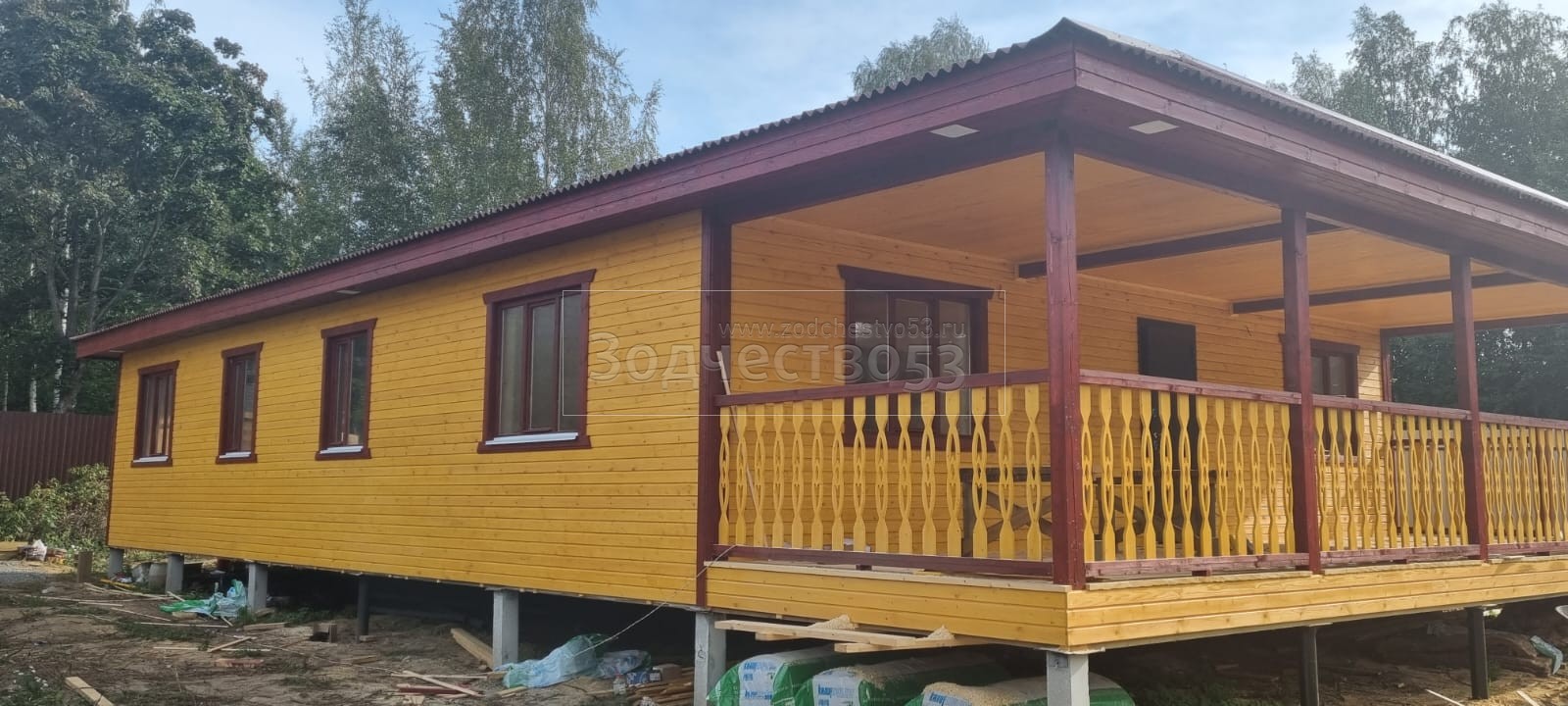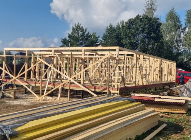 Постройка одноэтажного дома общими размерами 17.0×10.0 ( 14.0×10.0 каркасный Камерной сушки с утеплением в 150мм (стены) и открытая терраса 10.0×3.0 под общей четырехскатной крышей (тип конверта)