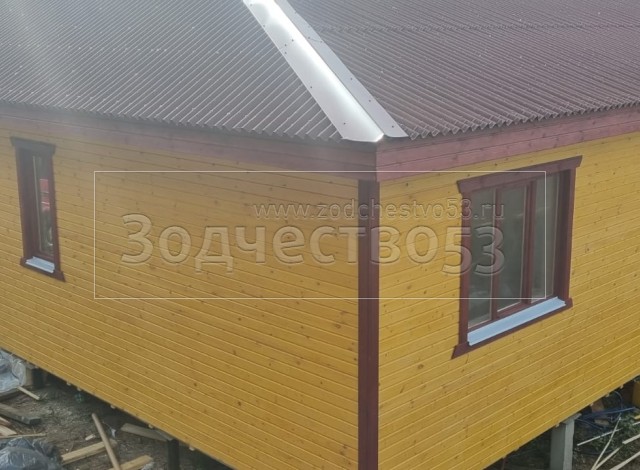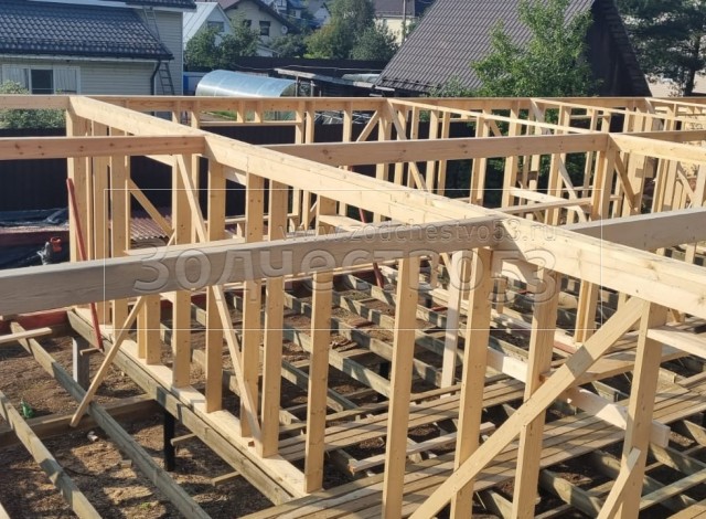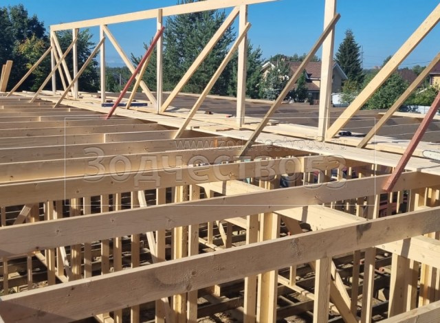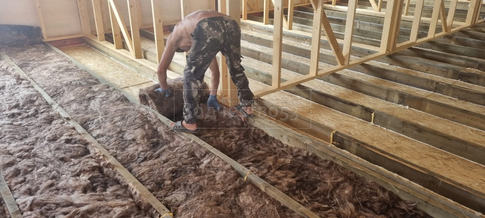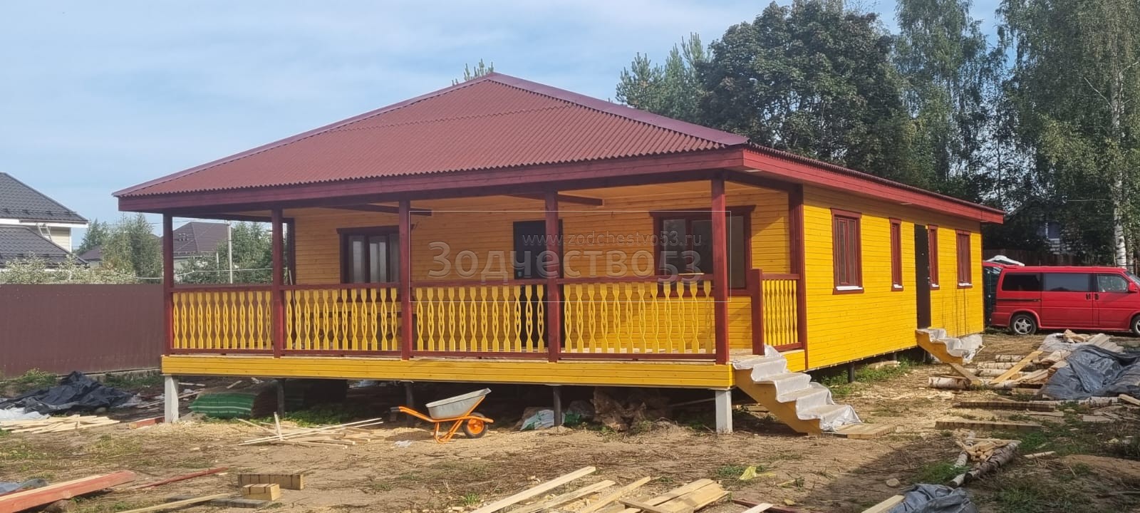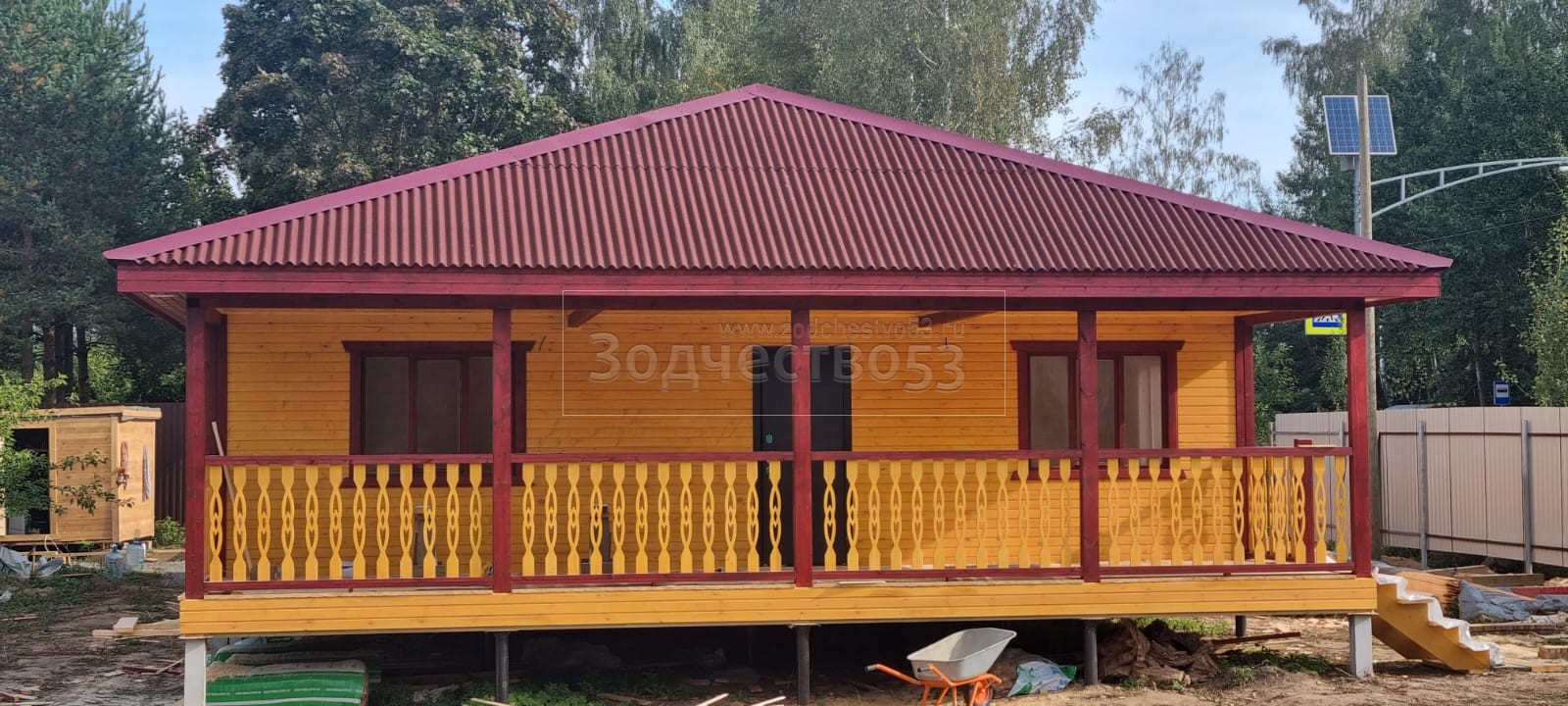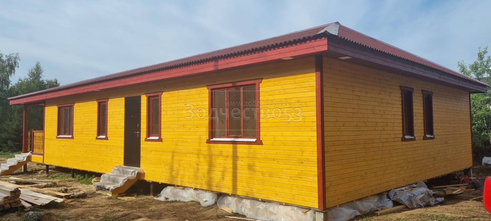 Постройка одноэтажного дома общими размерами 17.0×10.0 ( 14.0×10.0 каркасный Камерной сушки с утеплением в 150мм (стены) и открытая терраса 10.0×3.0 под общей четырехскатной крышей (тип конверта)
