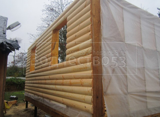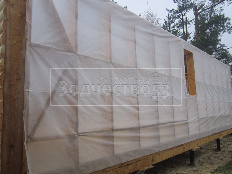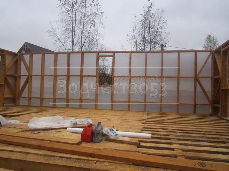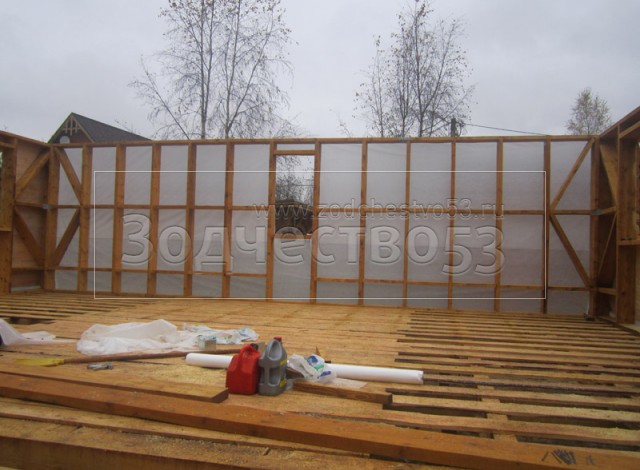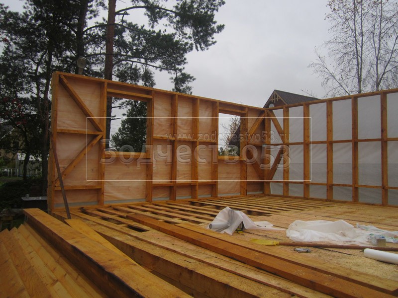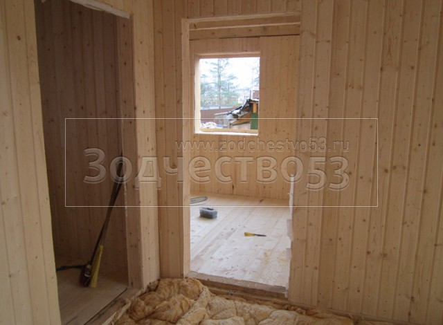 - Стены дома — каркасно-щитовые 40×200, с обшивкой с наружи блок-хаусом, изнутри — вагонкой класса «В» с двойной проложкой парогидроизоляции и утеплением 200 мм. (Роквул).