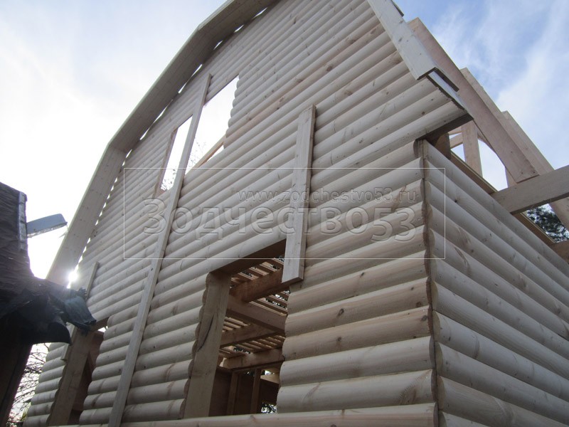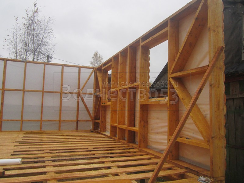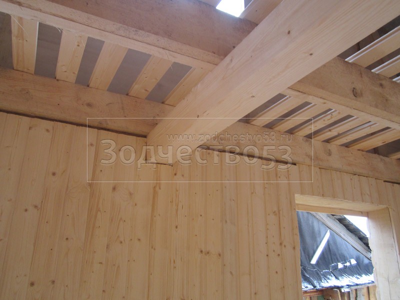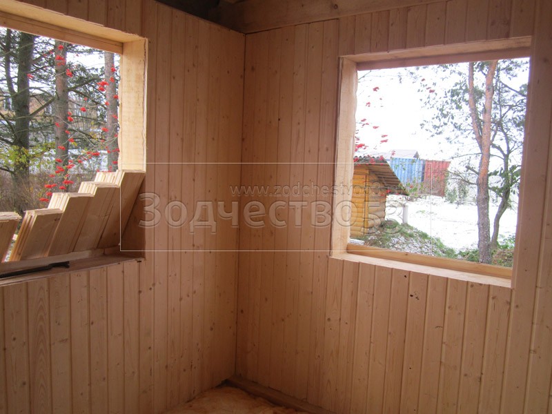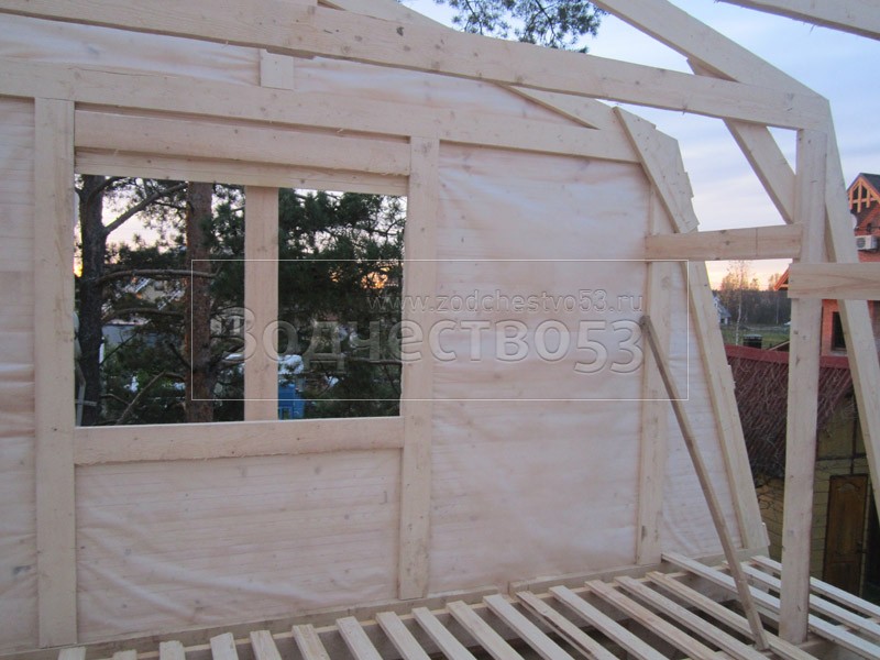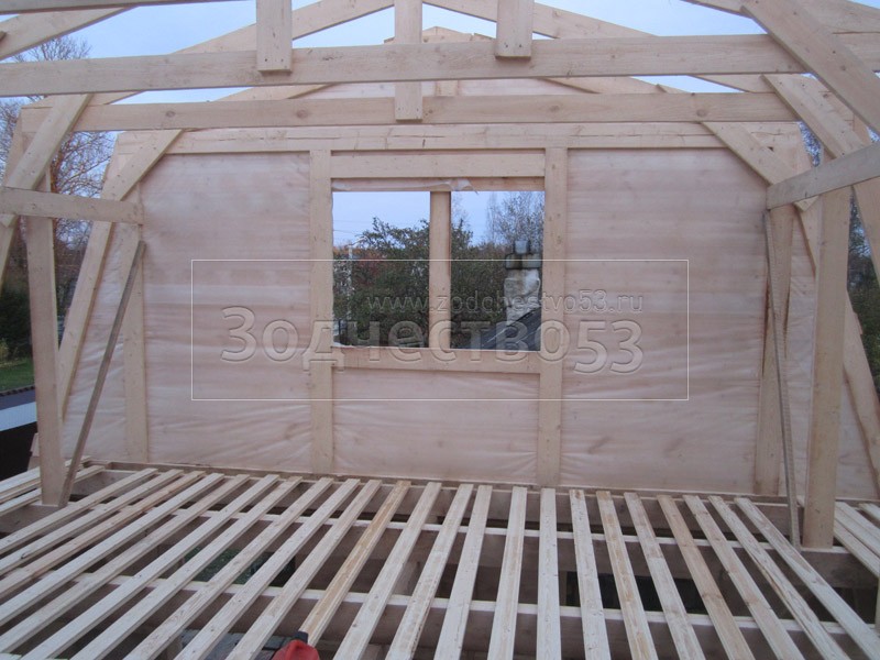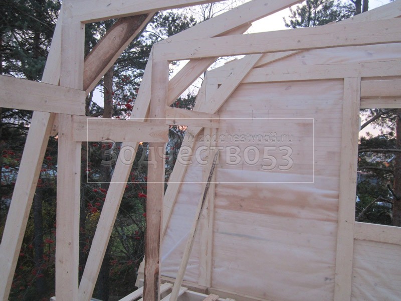 - Фронтоны — каркасно-щитовые, обшиты блок-хаусом, с проложкой парогидроизоляции.