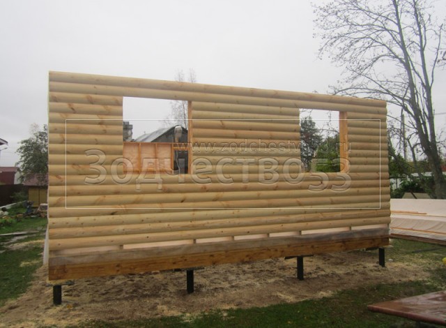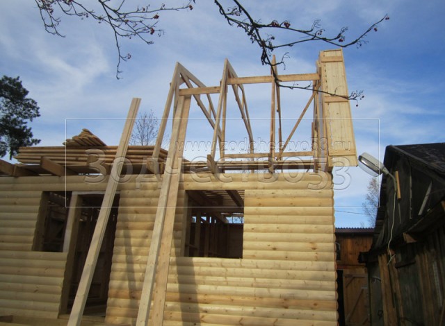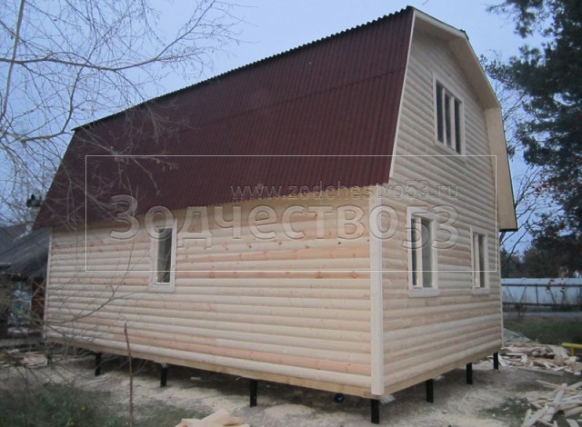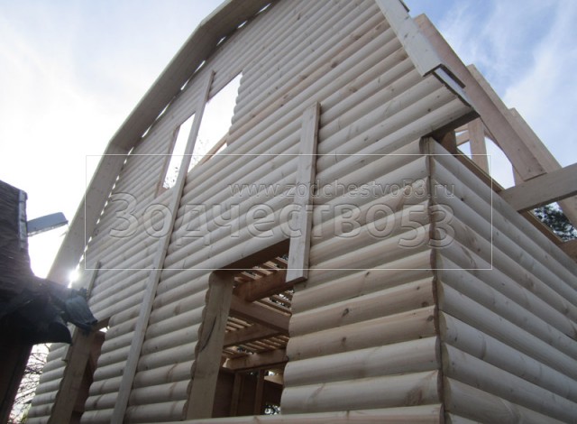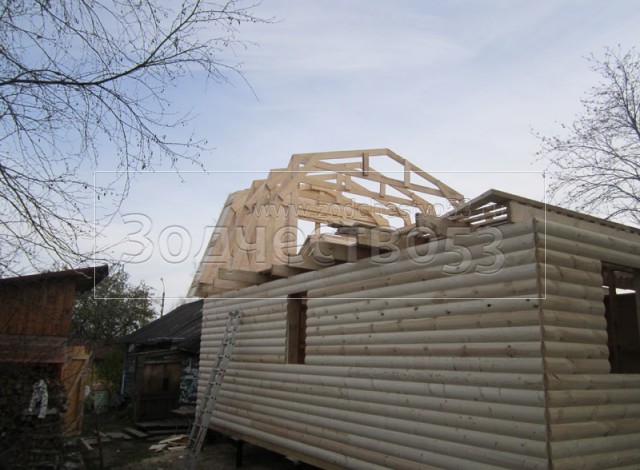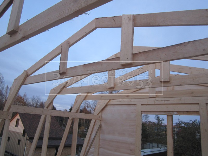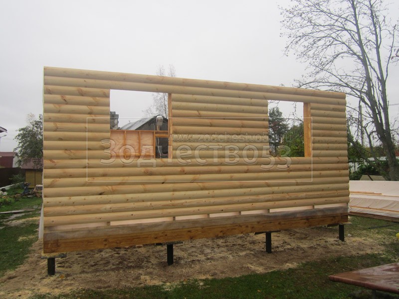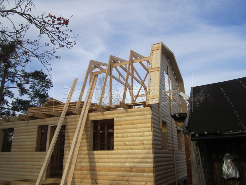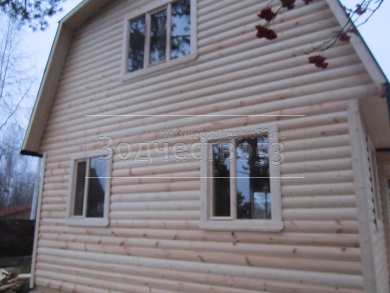 - Фронтоны — каркасно-щитовые, обшиты блок-хаусом, с проложкой парогидроизоляции.