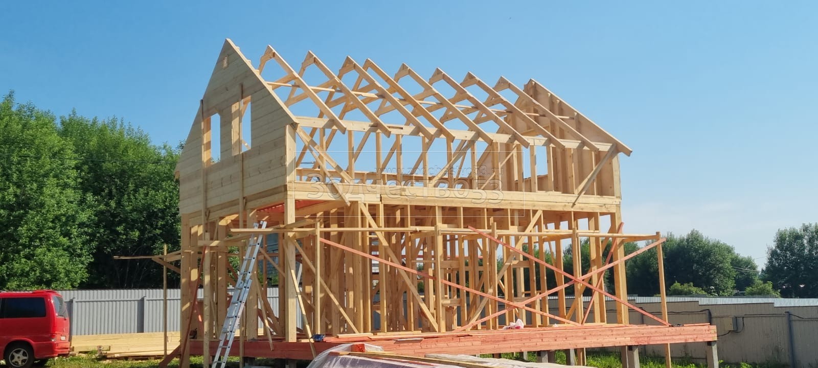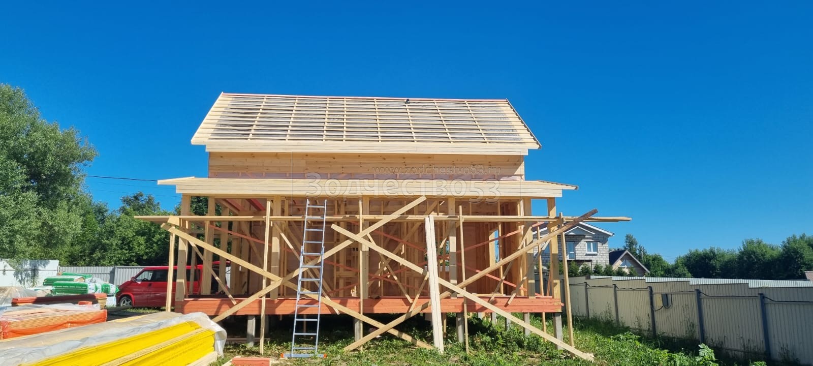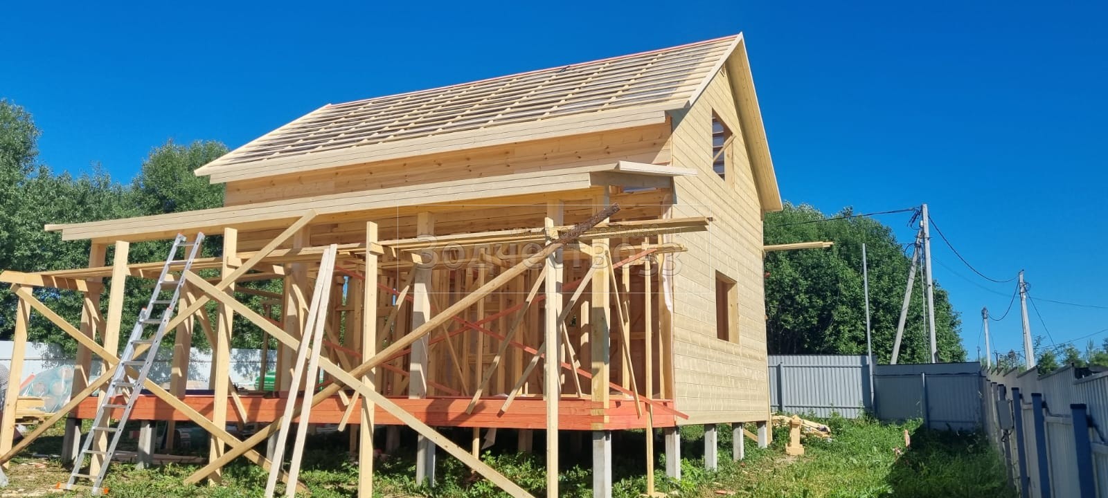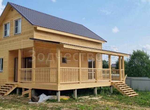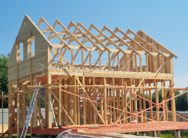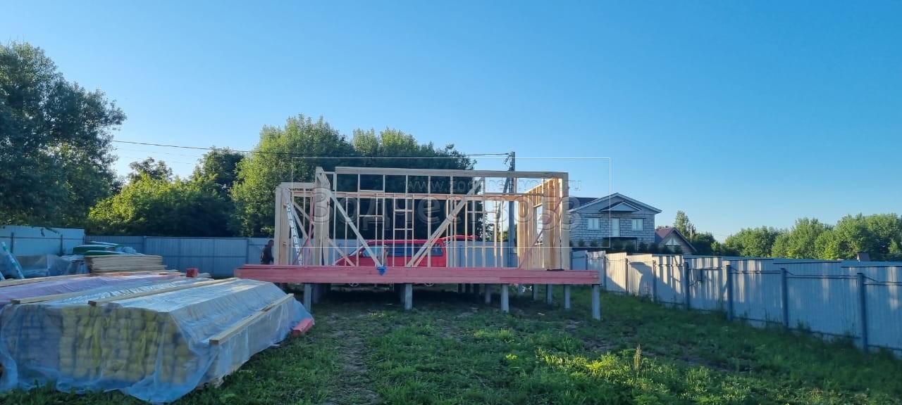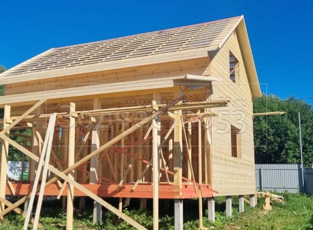 Постройка полутораэтажного дома общими размерами 8.50×8.50 ( Дом 8.50×6.0 ) каркасно—щитовой Камерной сушки с утеплением в 150 мм (стены) под двухскатной крышей и ( Терраса 8.50×2.50 ) под отдельно односкатной крышей. Построен: Московская область Одинцовский р-он с.Андреевское 18А