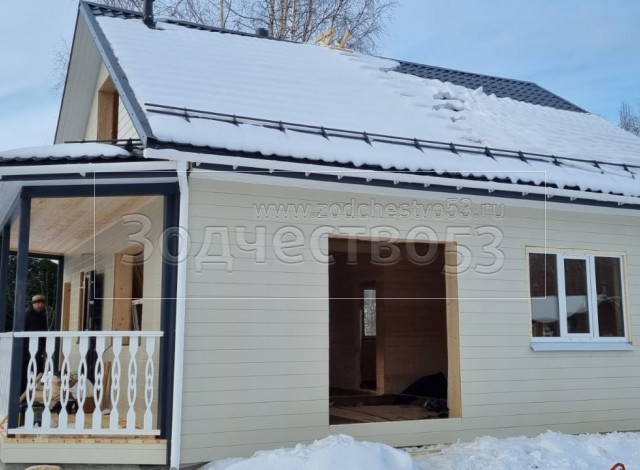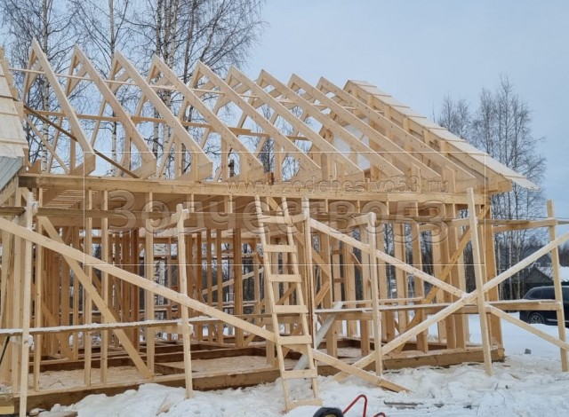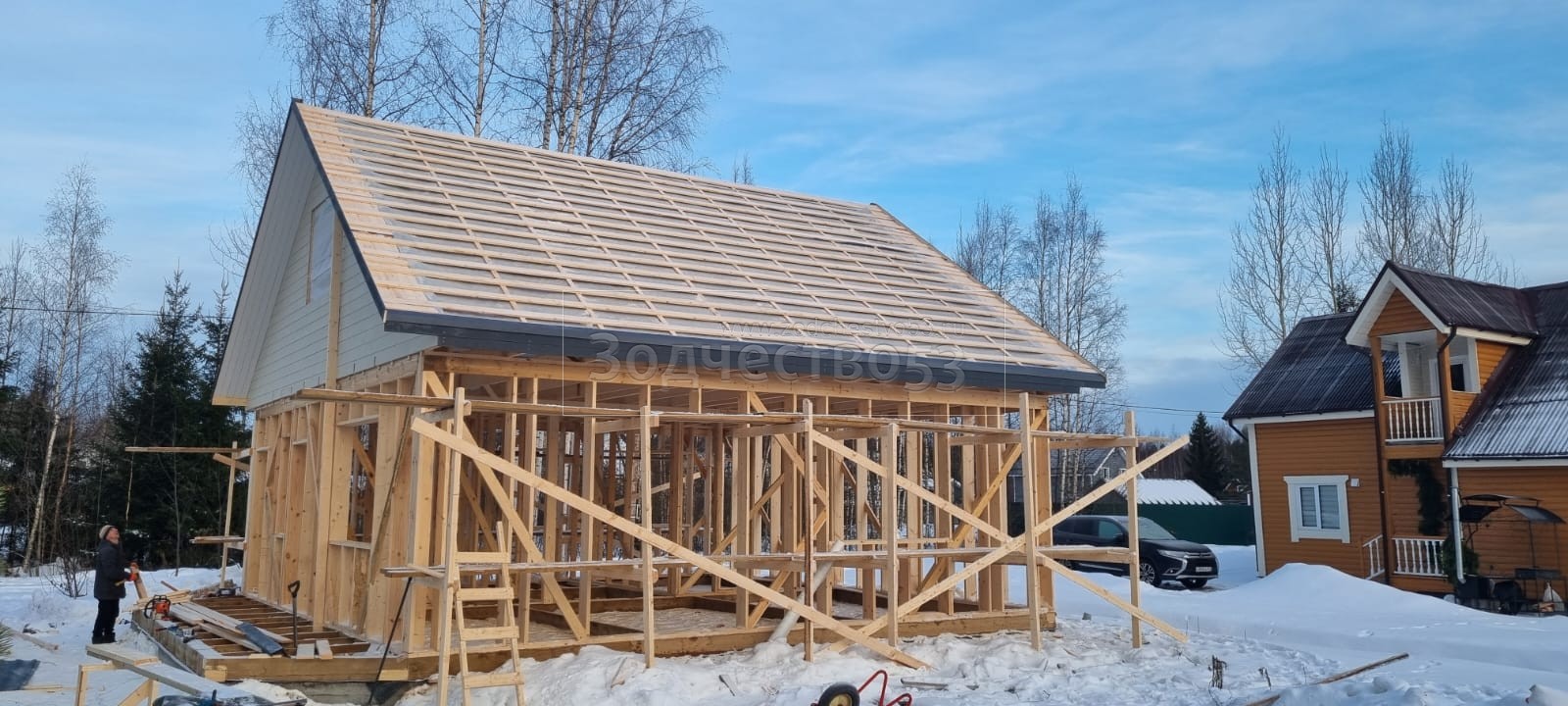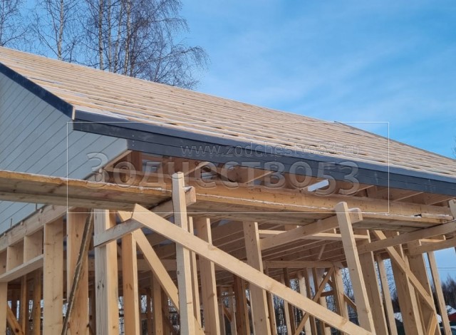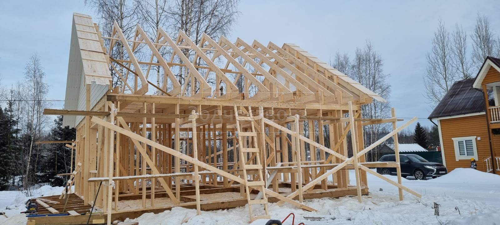 Постройка двухэтажного дома с открытой террасой, общими размерами 8.60х9.70 (8.60х8.20 дом) каркасно-щитовой Камерной сушки  с утеплением в 200 мм (стены) под двухскатной крышей и ( 6.60х1.50 открытая терраса ) под отдельной односкатной крышей ( вальмовая крыша с  лучами).