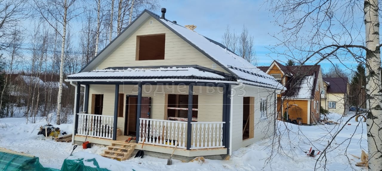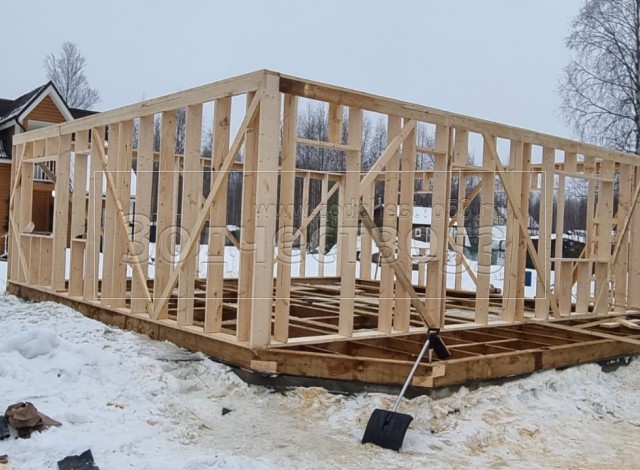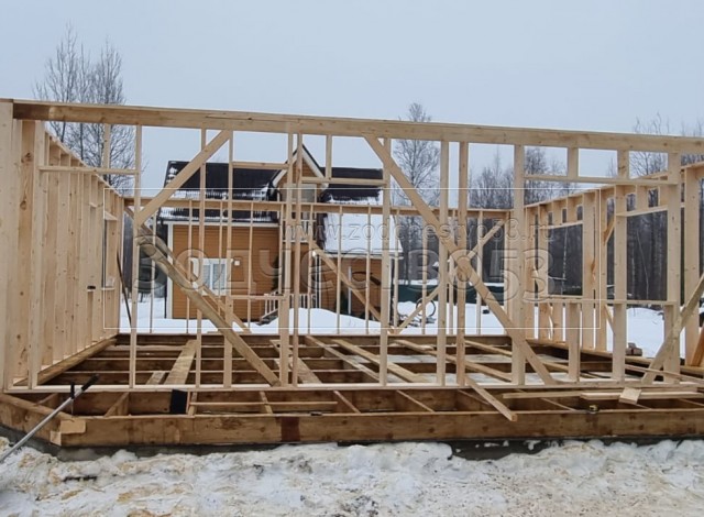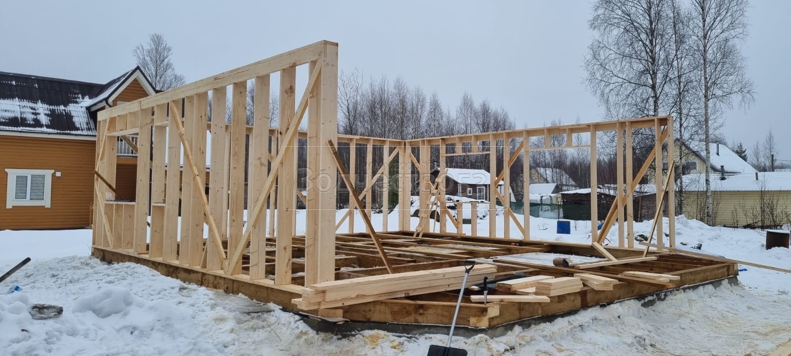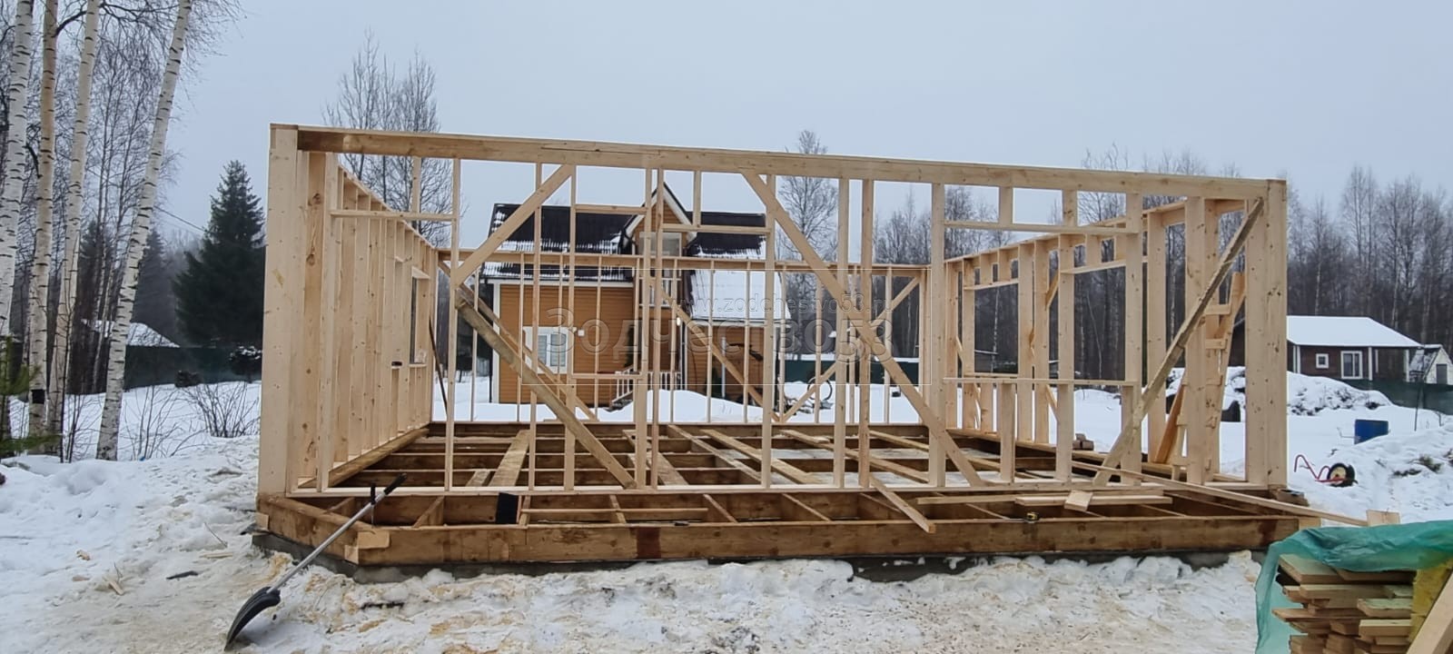 Постройка двухэтажного дома с открытой террасой, общими размерами 8.60х9.70 (8.60х8.20 дом) каркасно-щитовой Камерной сушки  с утеплением в 200 мм (стены) под двухскатной крышей и ( 6.60х1.50 открытая терраса ) под отдельной односкатной крышей ( вальмовая крыша с  лучами).