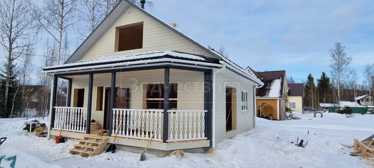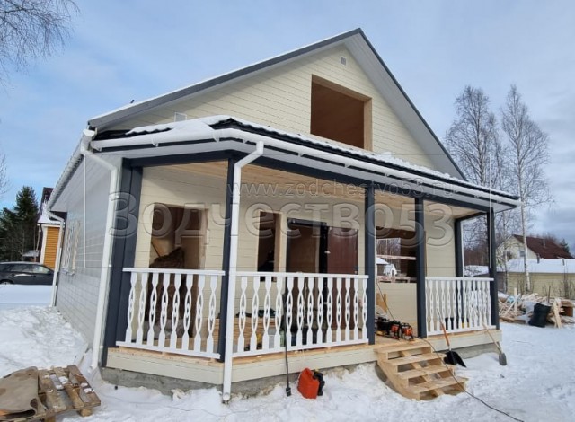 • Терраса эркером: открытая срезными балясинами и перилами из строганной доски(Заводская покраска . Цвет белый )