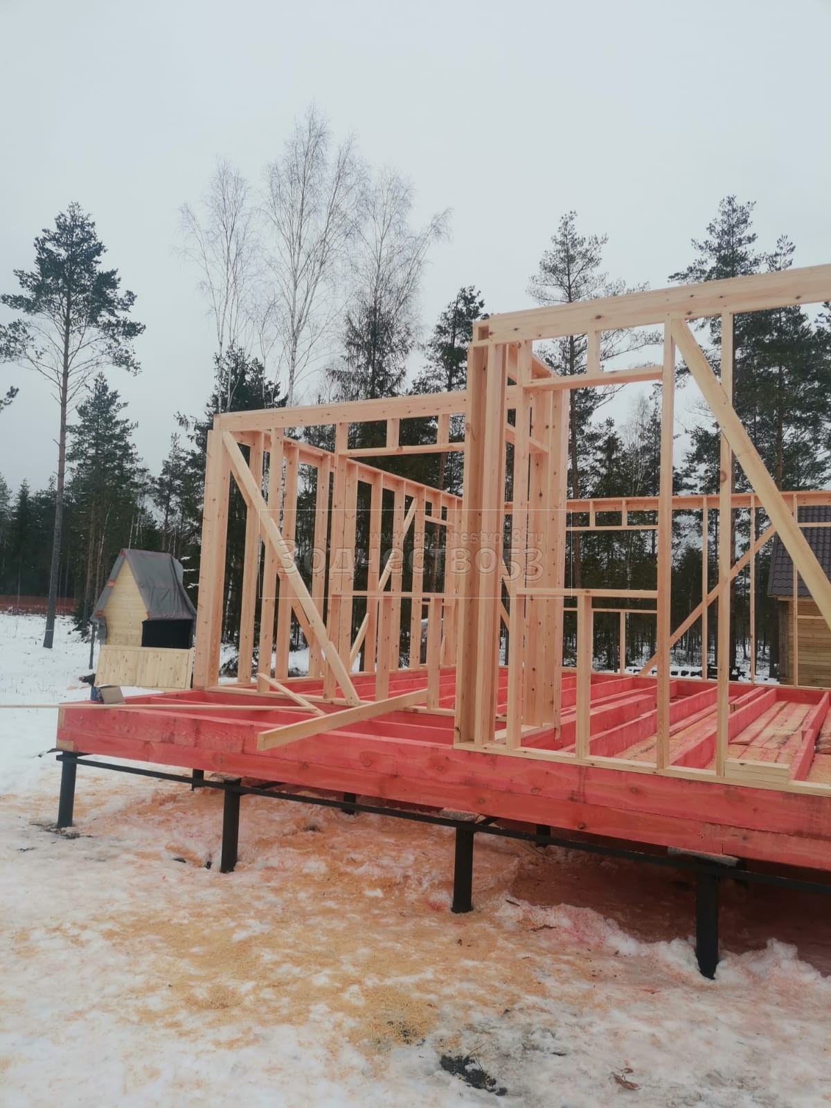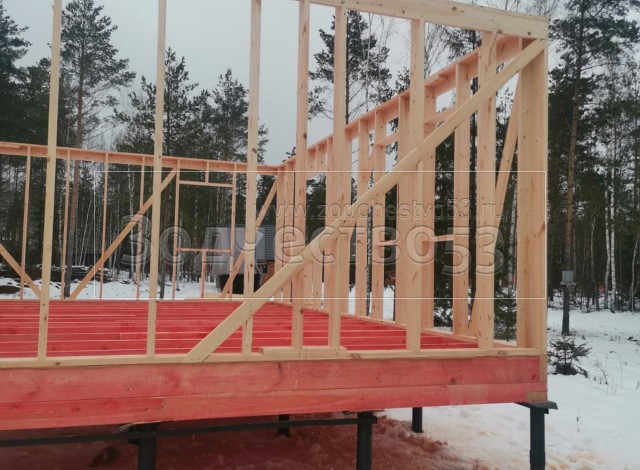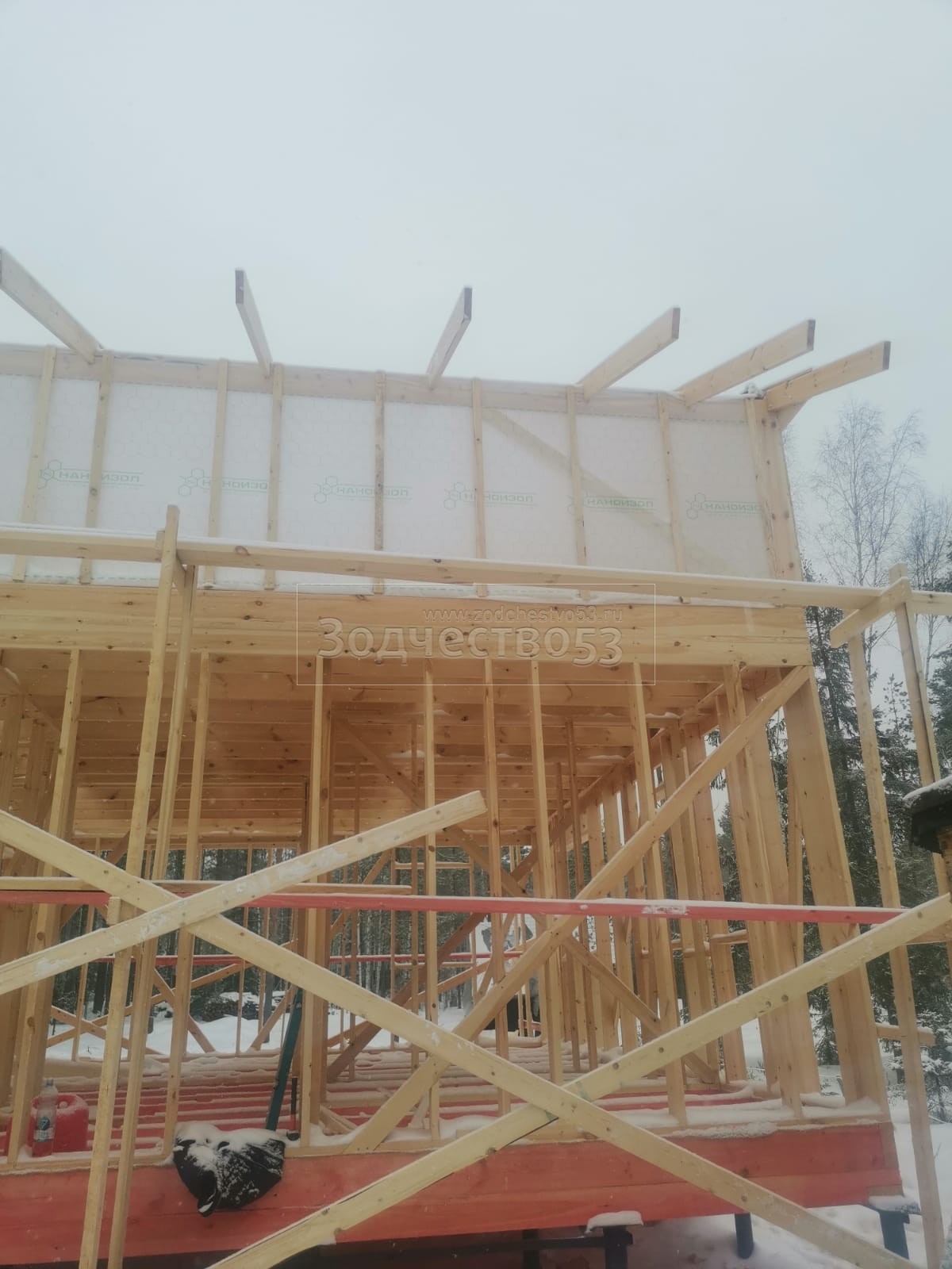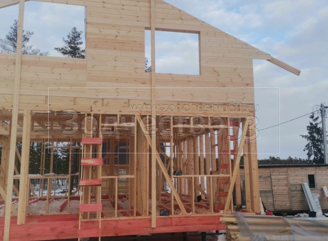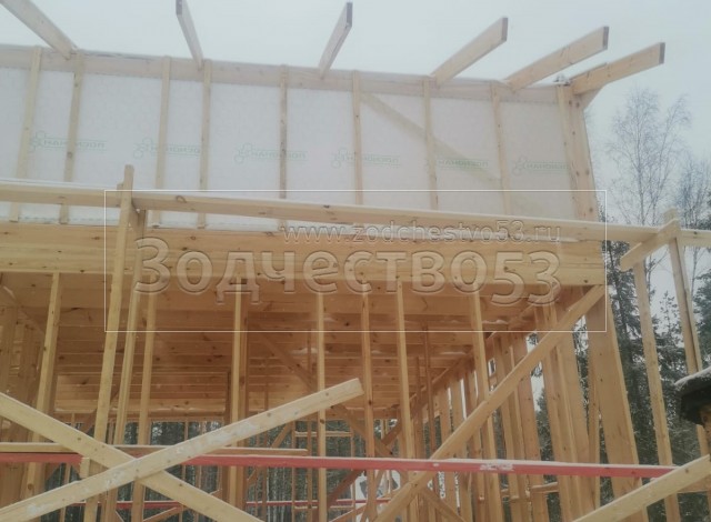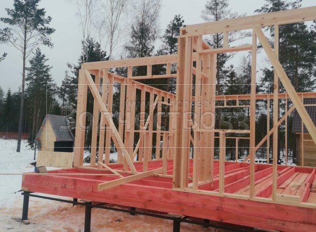 Постройка полутораэтажного дома по проекту Диля, общими размерами 8.0×8.0 каркасно-щитовой (Камерной сушки) с утеплением в 150 мм (стены) под двухскатной крышей