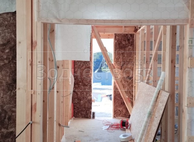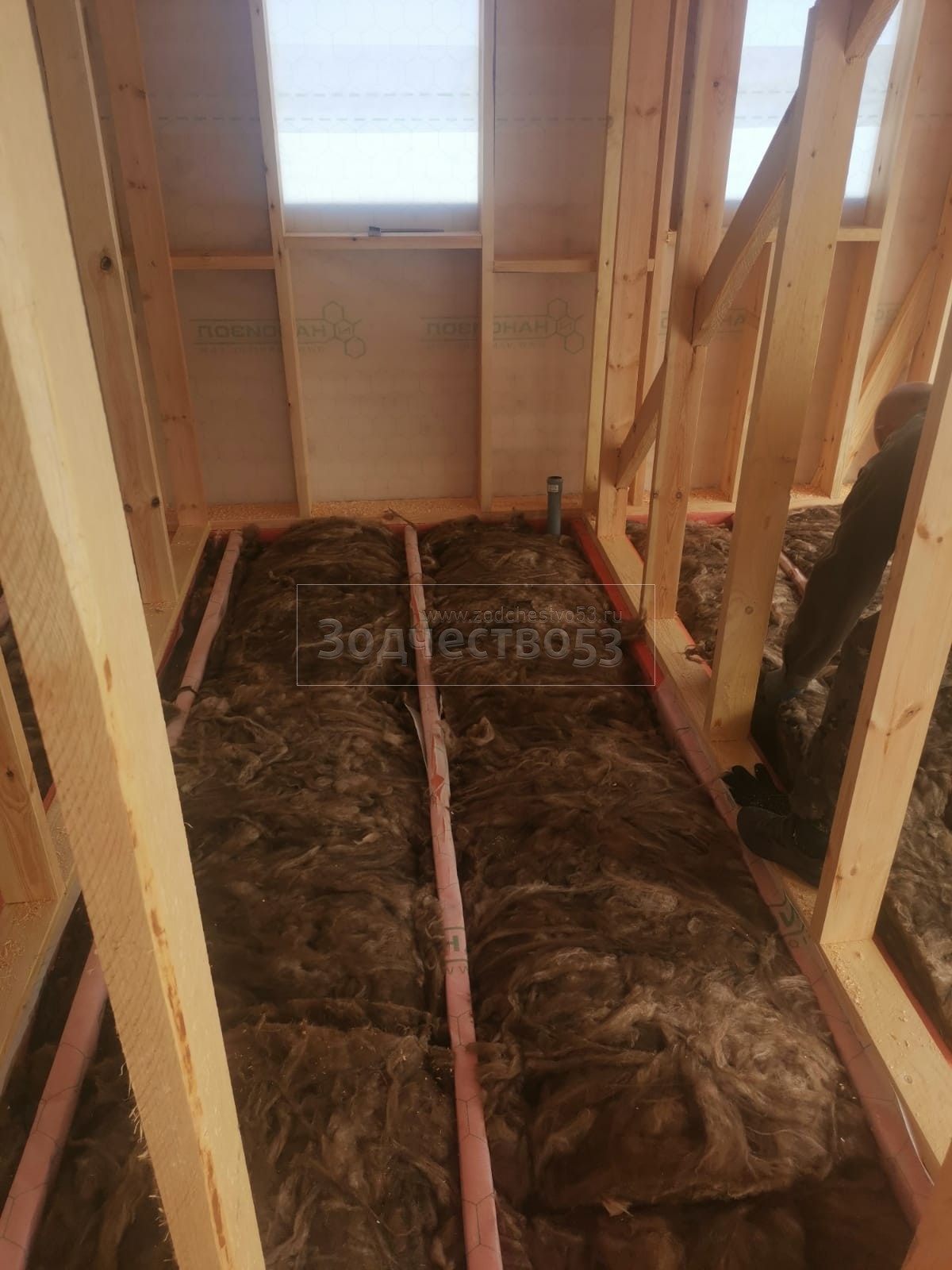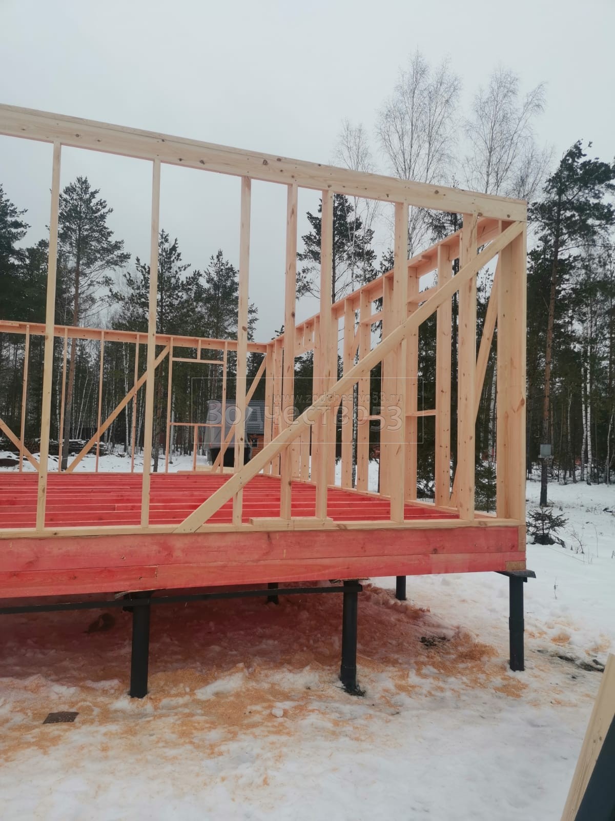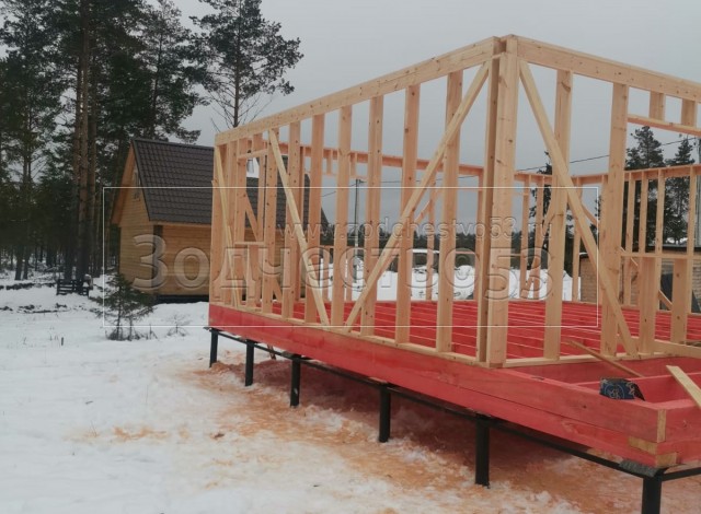 Постройка полутораэтажного дома по проекту Диля, общими размерами 8.0×8.0 каркасно-щитовой (Камерной сушки) с утеплением в 150 мм (стены) под двухскатной крышей
