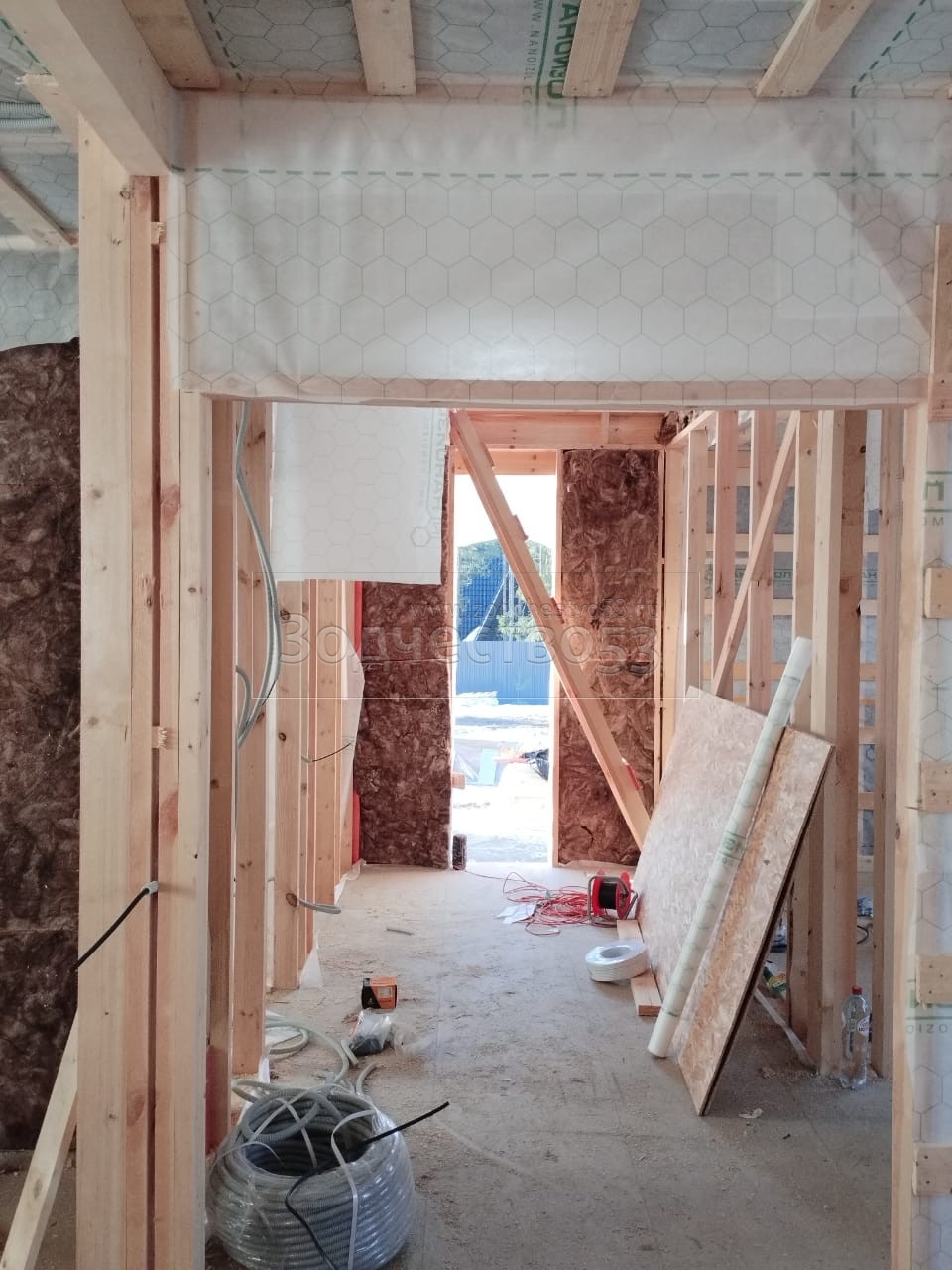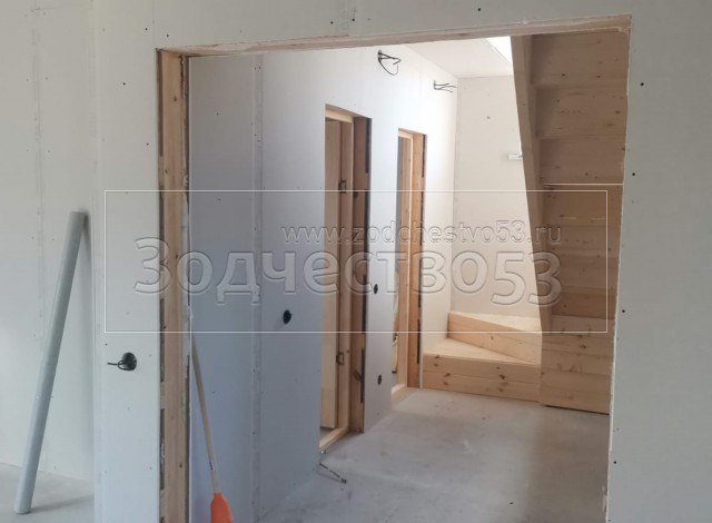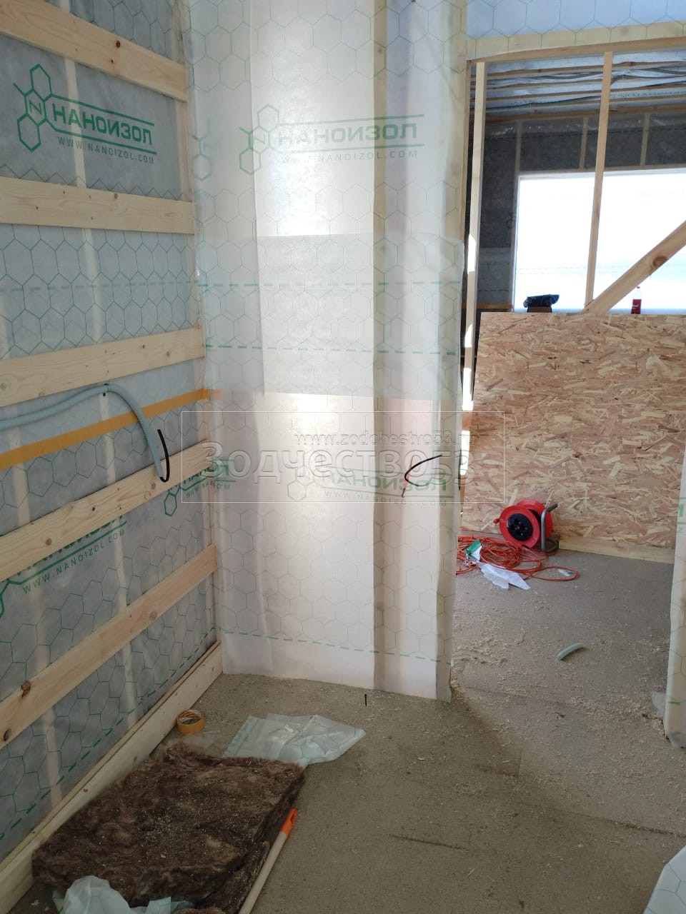 - Перегородки 1 и 2 этажей : каркасно-щитовые (Камерной сушки ) , , обшиваются с двух сторон обрезной доской 20×100 ( Камерной сушки ) плюс первый слой Влагостойкая фанера ОСБ и второй слой Гипсокартон