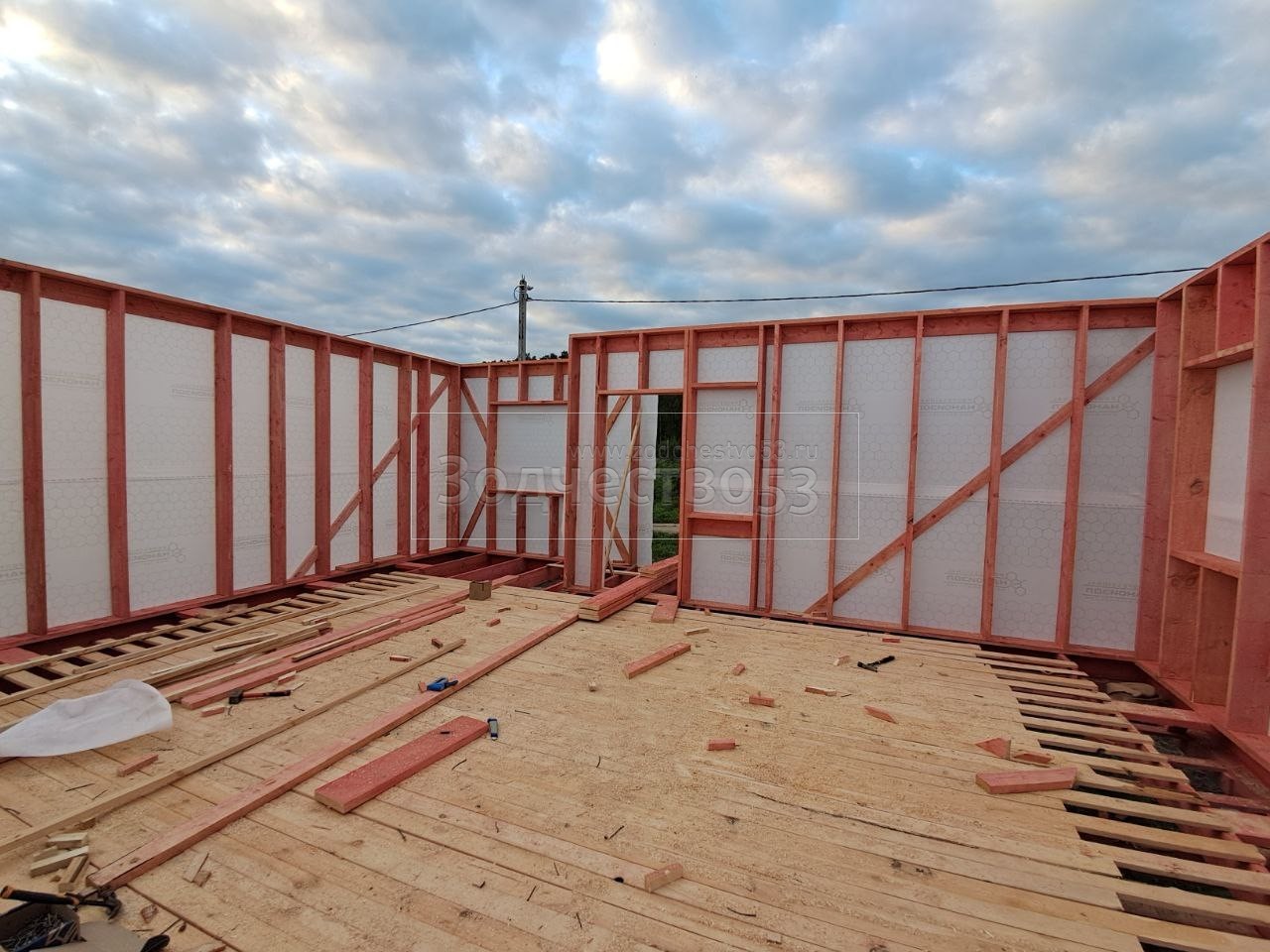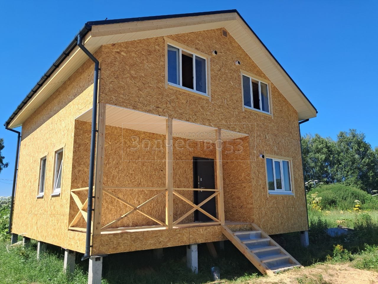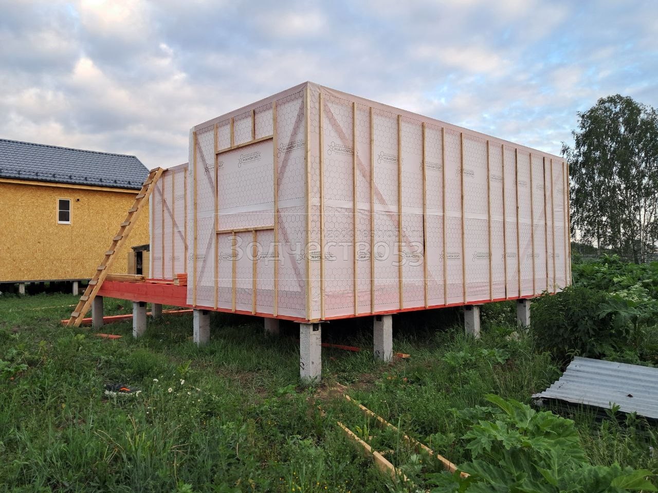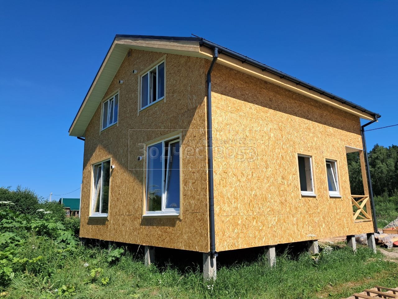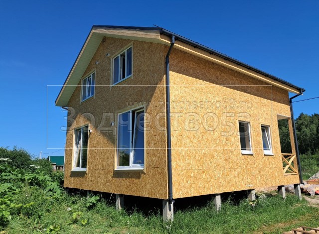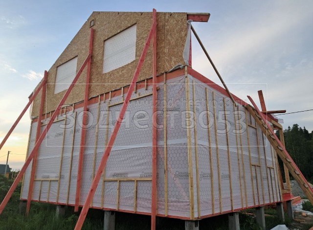 Постройка полутораэтажного дома общими размерами 8.0×8.0 каркасно-щитовой (Камерной сушки) с утеплением в 200 мм (стены) под двухскатной крышей по проекту: https://zodchestvo53.ru/elizaveta