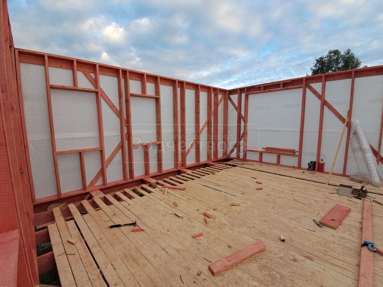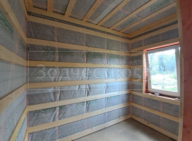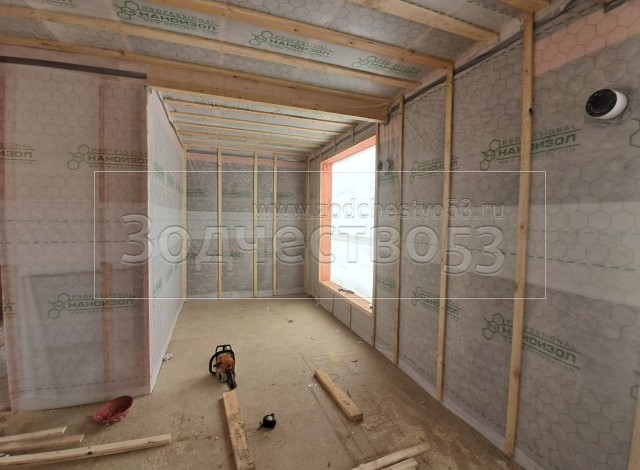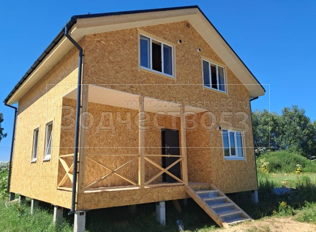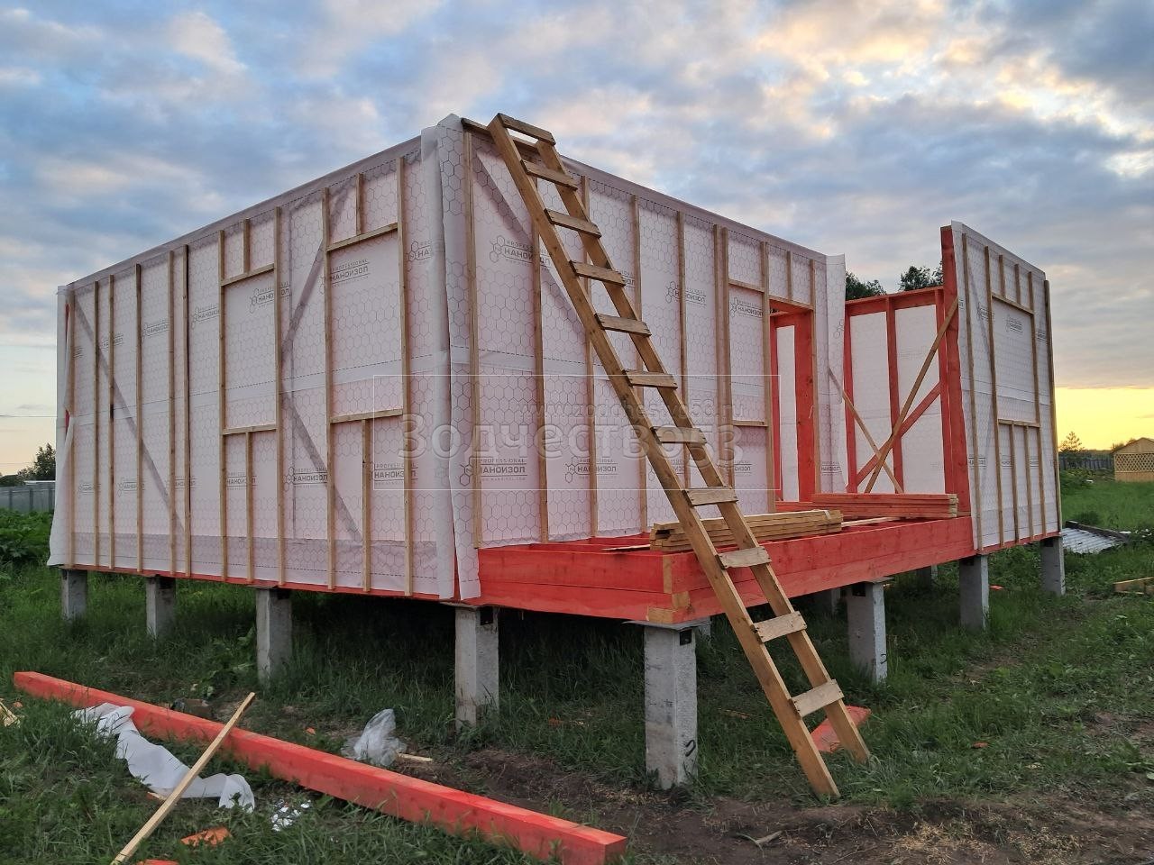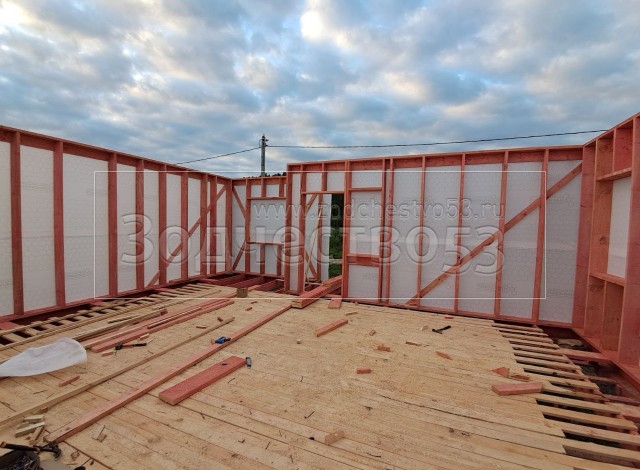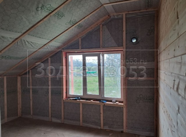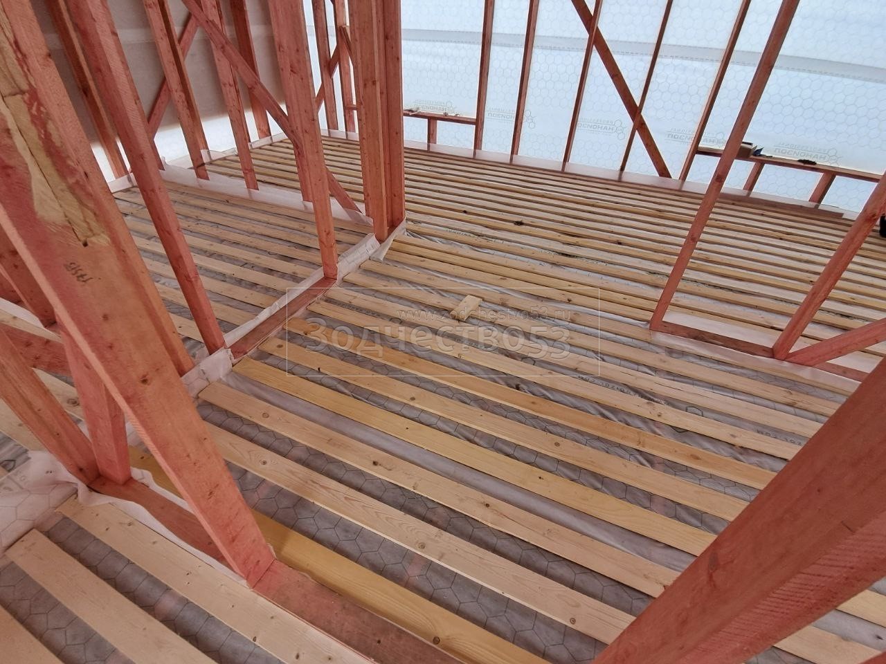 Постройка полутораэтажного дома общими размерами 8.0×8.0 каркасно-щитовой (Камерной сушки) с утеплением в 200 мм (стены) под двухскатной крышей по проекту: https://zodchestvo53.ru/elizaveta