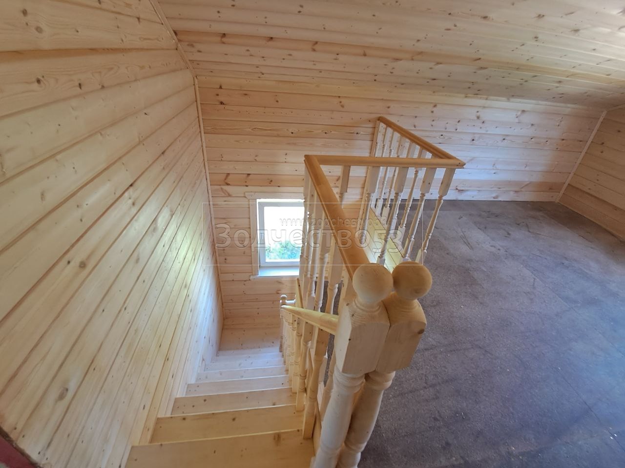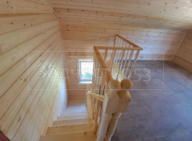 - Лестница : двухмаршевая с площадкой ( 0.90-1.0×2.0 ) и точеными балясинами , стартовыми столбами и перилами .