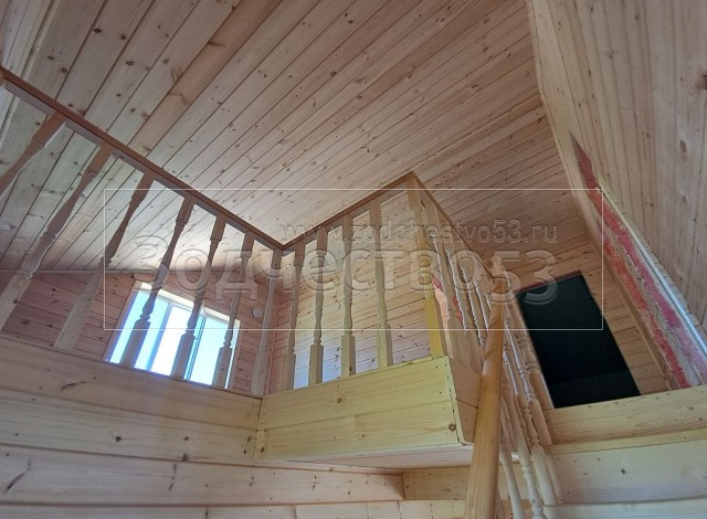 - Терраса : открытая, с перилами и балясинами крестом ( согласно проекта ) Потолки подшиваются сухой обрезной доской и белыми перфорированными софитами .