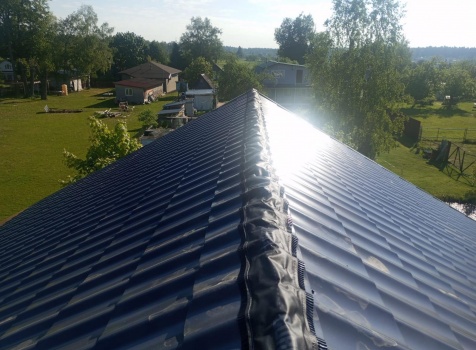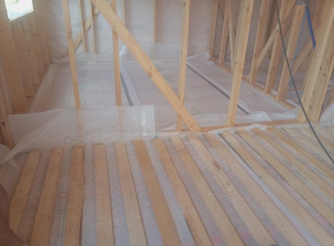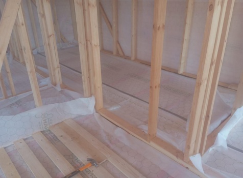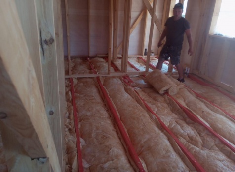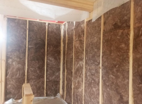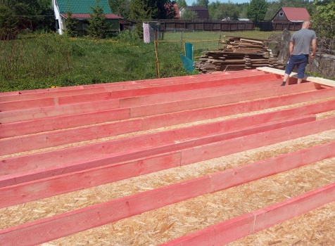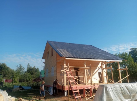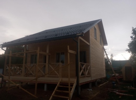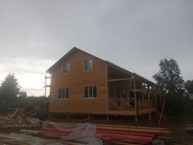 Постройка полутораэтажного дома с открытой террасой общими размерами 9.50×7.0 ( 7.0×7.0 дом полутораэтажный ) каркасно—щитовой (Камерной сушки) с утеплением в 150 мм (стены) и ( 2.50×7.0 открытая терраса ) под общей двухскатной крышей ( один скат длиннее )