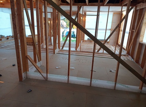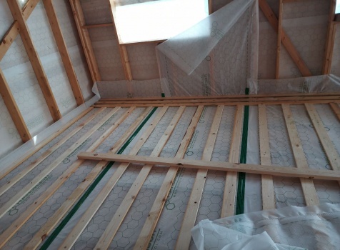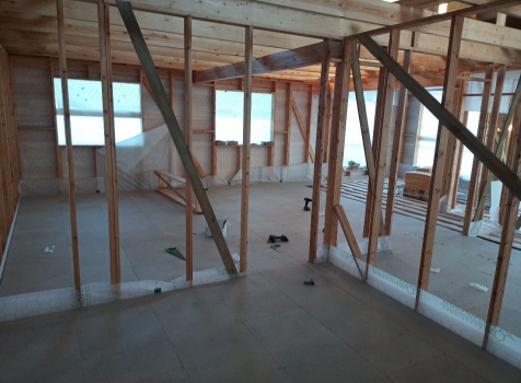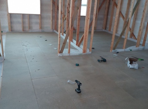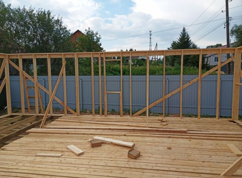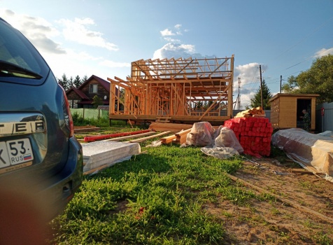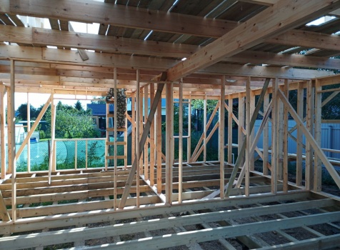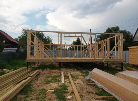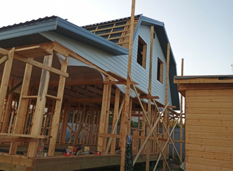 Постройка двухэтажного дома общими размерами 9.0×10.0 ( 9.0×7.0 под ломанной крышей )и ( 3.0×9.0 под отдельной односкатной крышей ) каркасно-щитовой Камерной сушки с утеплением в 150 мм ( стены )