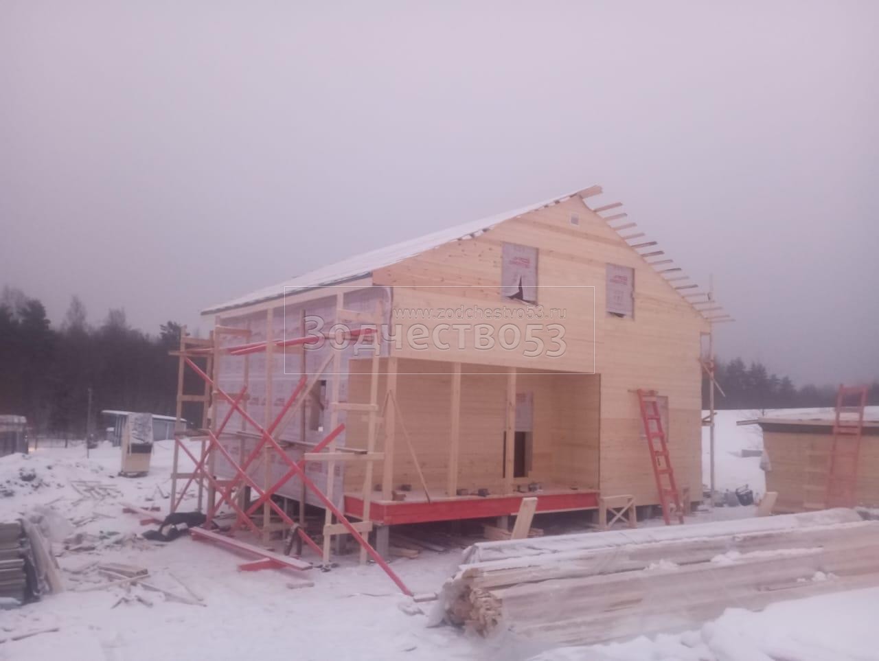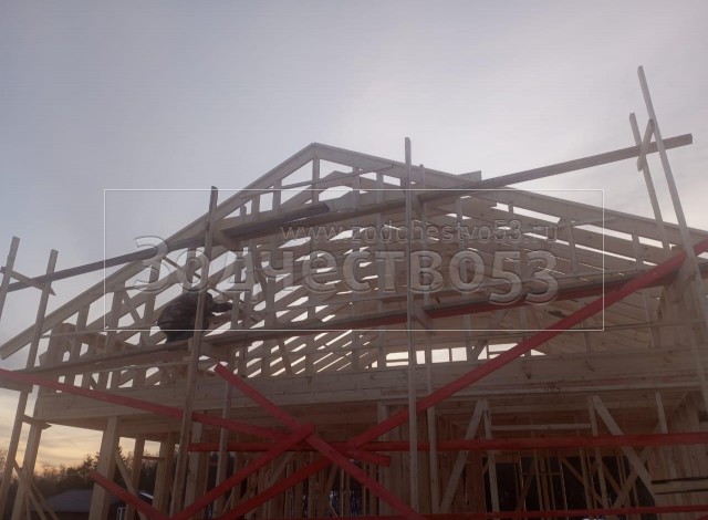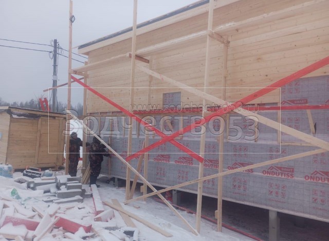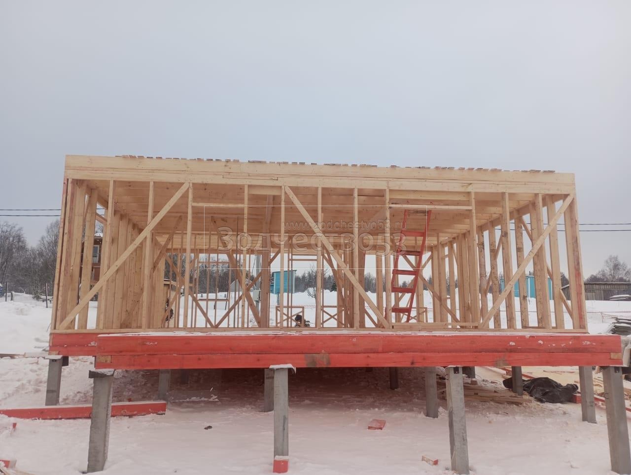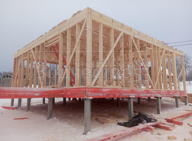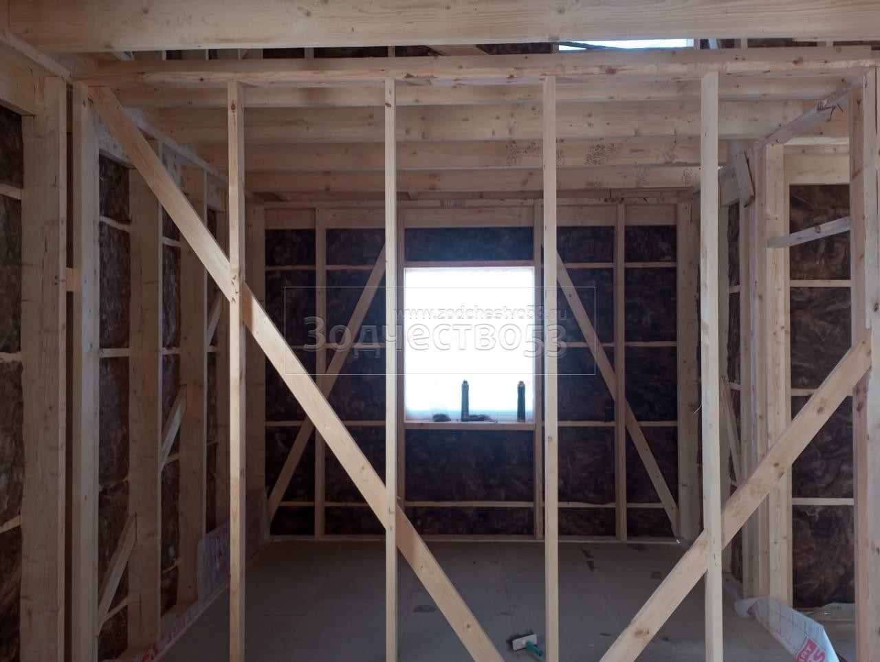 Постройка полутораэтажного дома с крыльцом и открытой террасой общими размерами 9.0×12.0 ( 9.0×9.0 дом с крыльцом ) каркасно-щитовой Камерной сушки с утеплением в 200 мм (стены) под общей двускатной крышей и ( 6.0×3.0 открытая терраса ) под отдельной односкатной крышей .