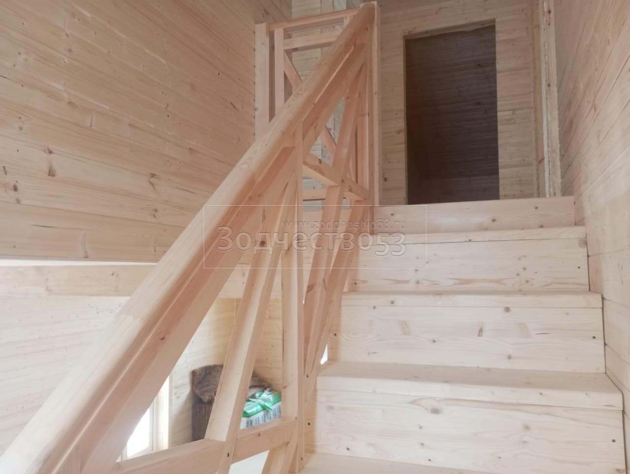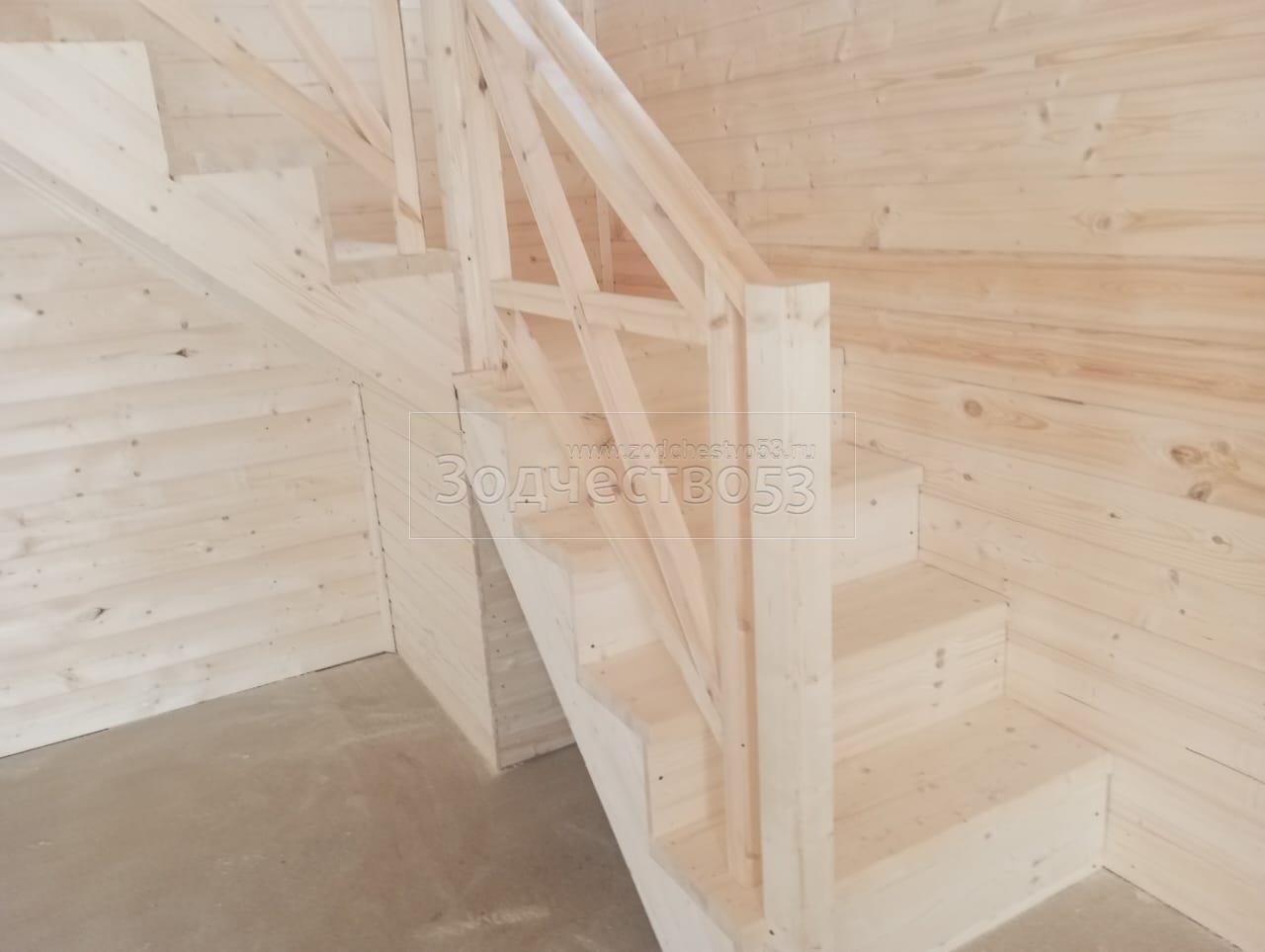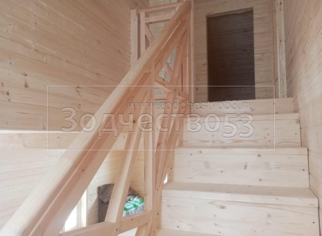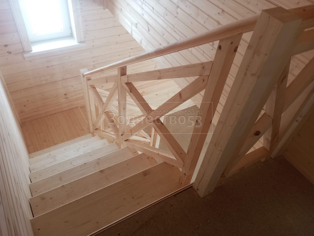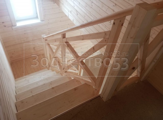 - Лестница : одномаршевая с площадкой, балясинами ( крестом ) , стартовыми столбами ( прямыми ) и перилами .