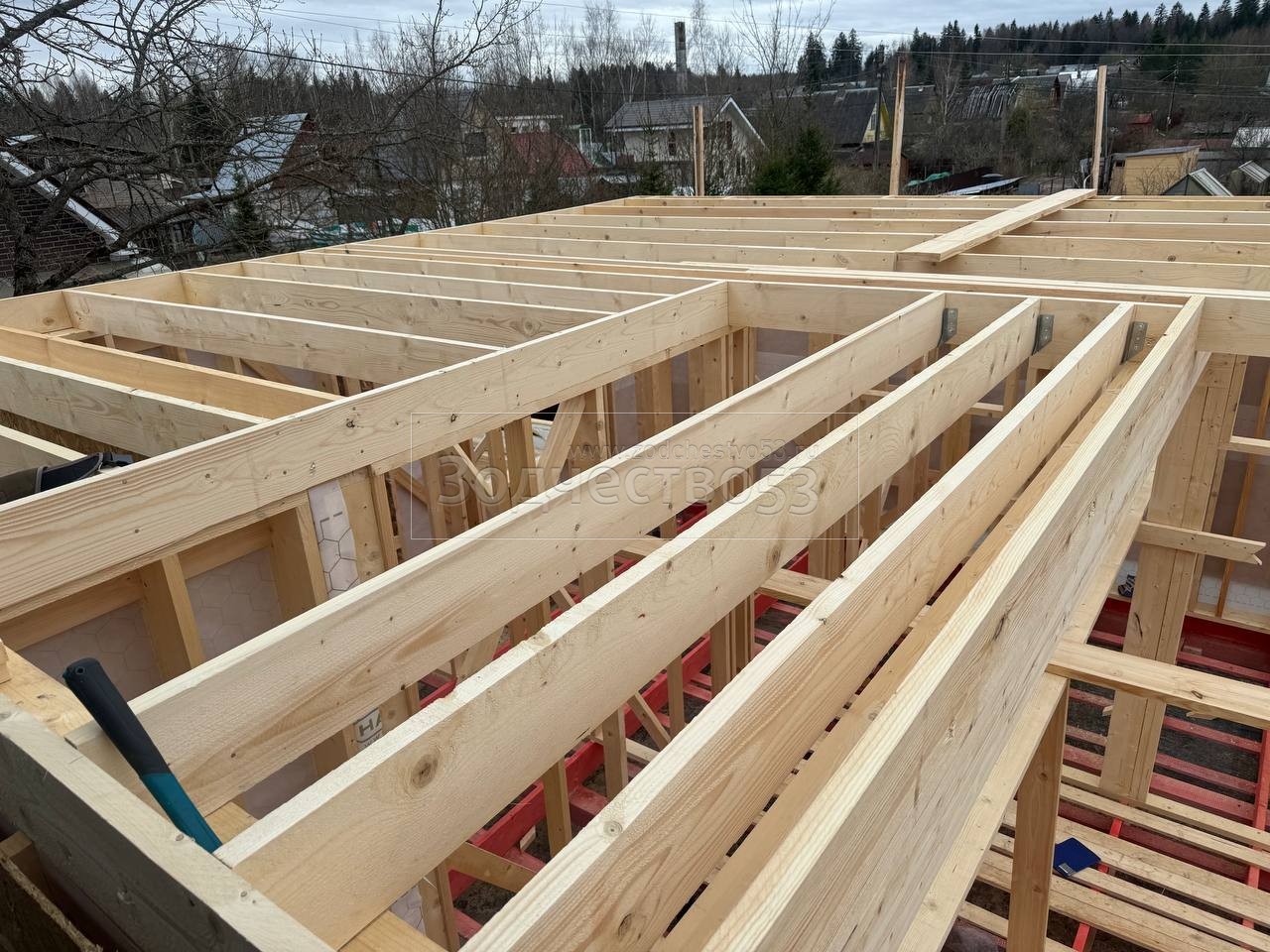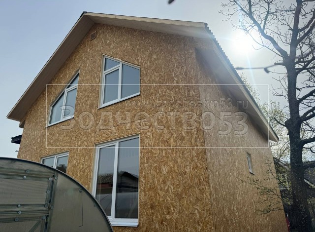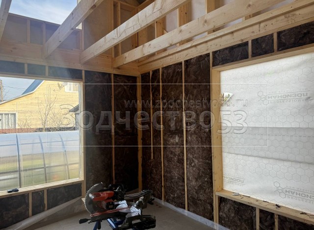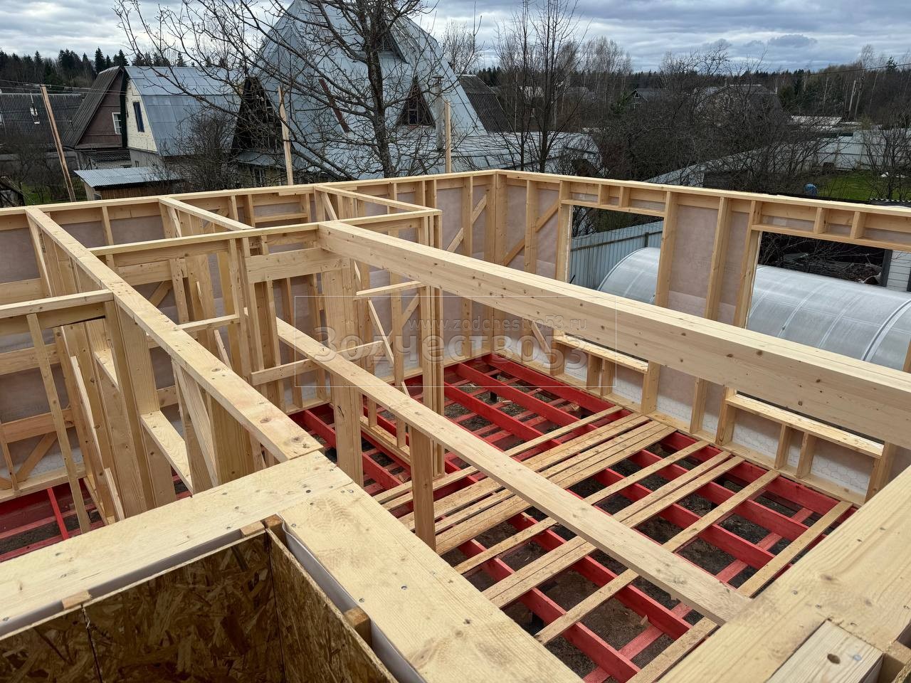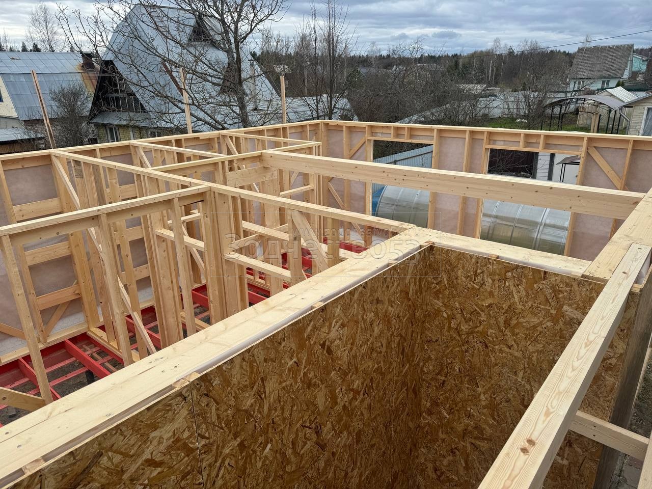 Постройка полутораэтажного дома общими размерами 9.0×7.0 каркасно-щитовой (Камерной сушки) с утеплением в 200мм (стены) под двухскатной крышей по проекту: https://zodchestvo53.ru/elena