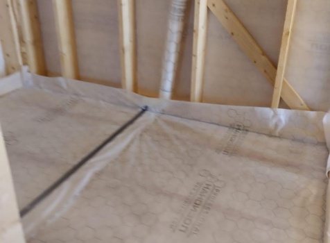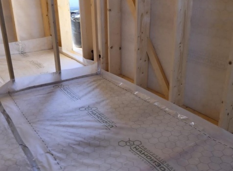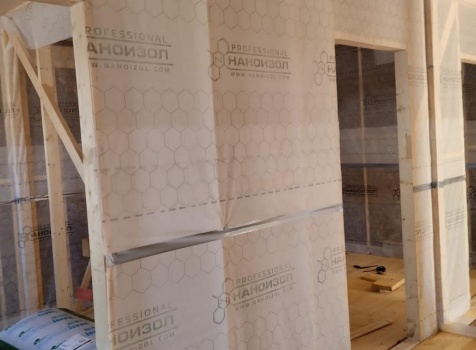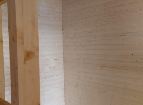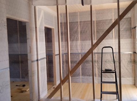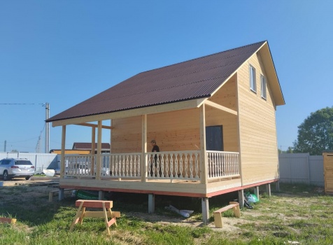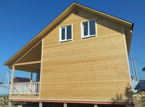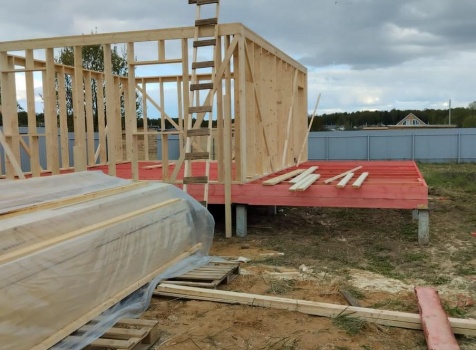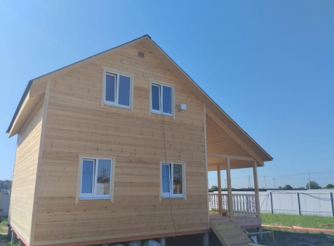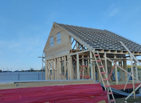 Постройка полутораэтажного дома с открытой террасой , общими размерами 9.0×7.0 ( 6.0×7.0 дом ) каркасно — щитовой Камерной сушки с утеплением в 200 мм (стены) и ( 3.0×7.0 открытая терраса ) под общей двухскатной крышей с одним скатом длинней по проекту: https://zodchestvo53.ru/aleksandra