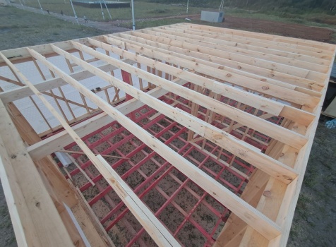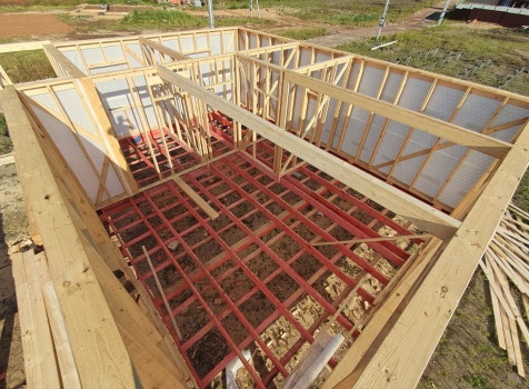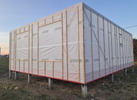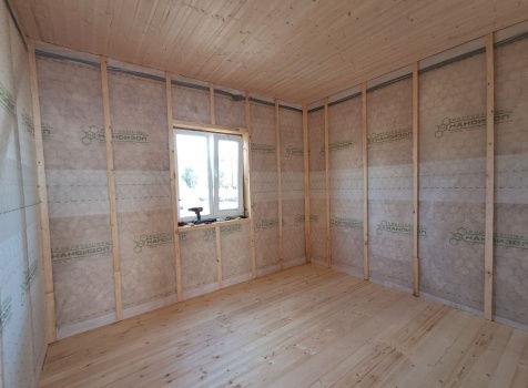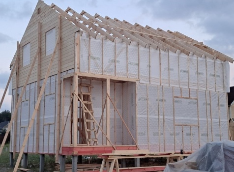 Постройка полутораэтажного дома общими размерами 9.0×7.0 каркасно-щитовой (Камерной сушки) с утеплением в 200 мм (стены) под двухскатной крышей: https://zodchestvo53.ru/bogdana