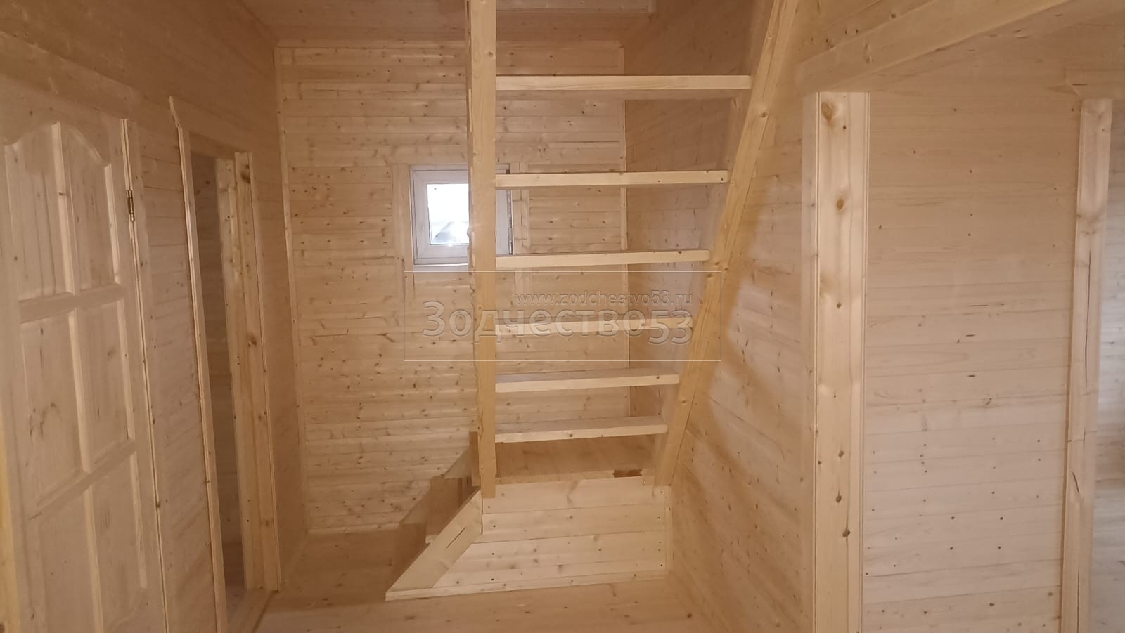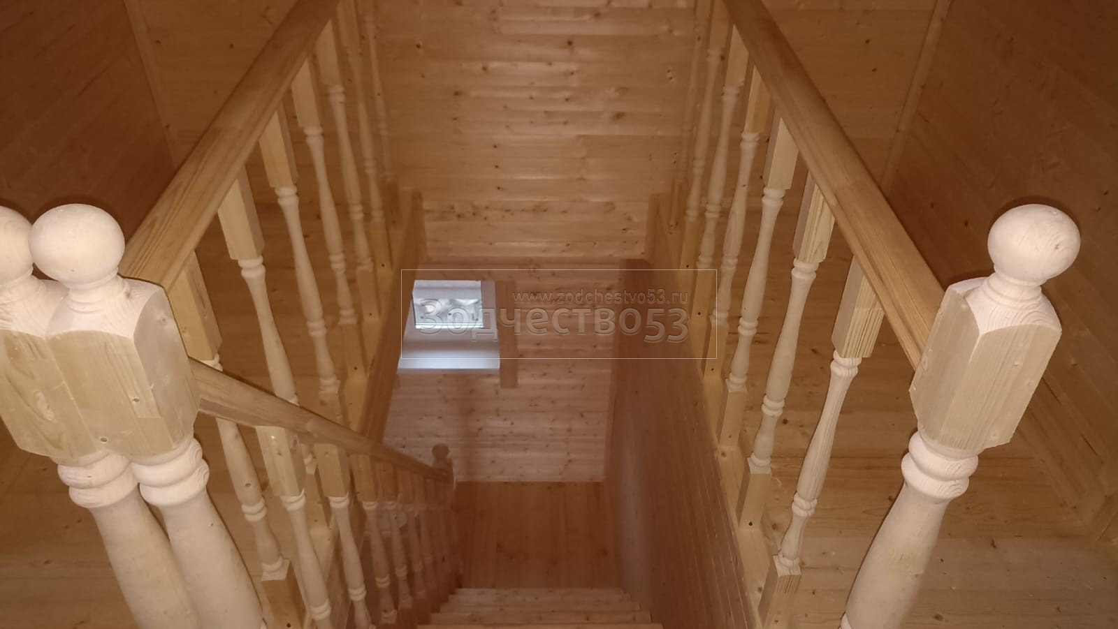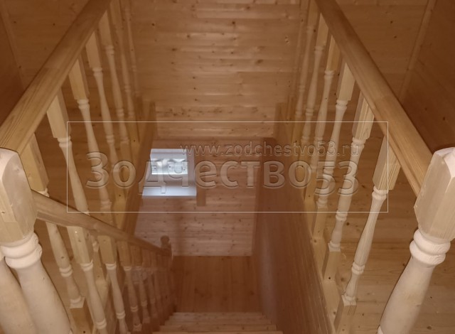 - Лестница: двухмаршевая с подиумом , с точеными балясинами, стартовыми столбами и перилами.
