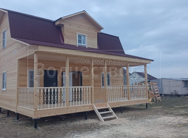 - Терраса: 9.0×2.50 открытая с перилами из строганной обрезной доски 100×40 и резными балясинами . Полы шпунтованная доска 36 мм