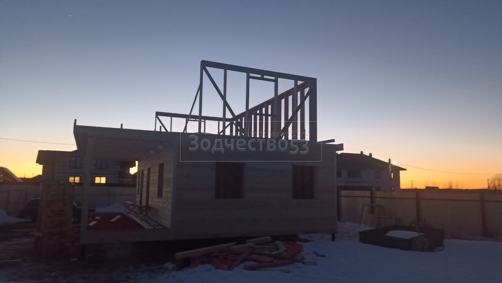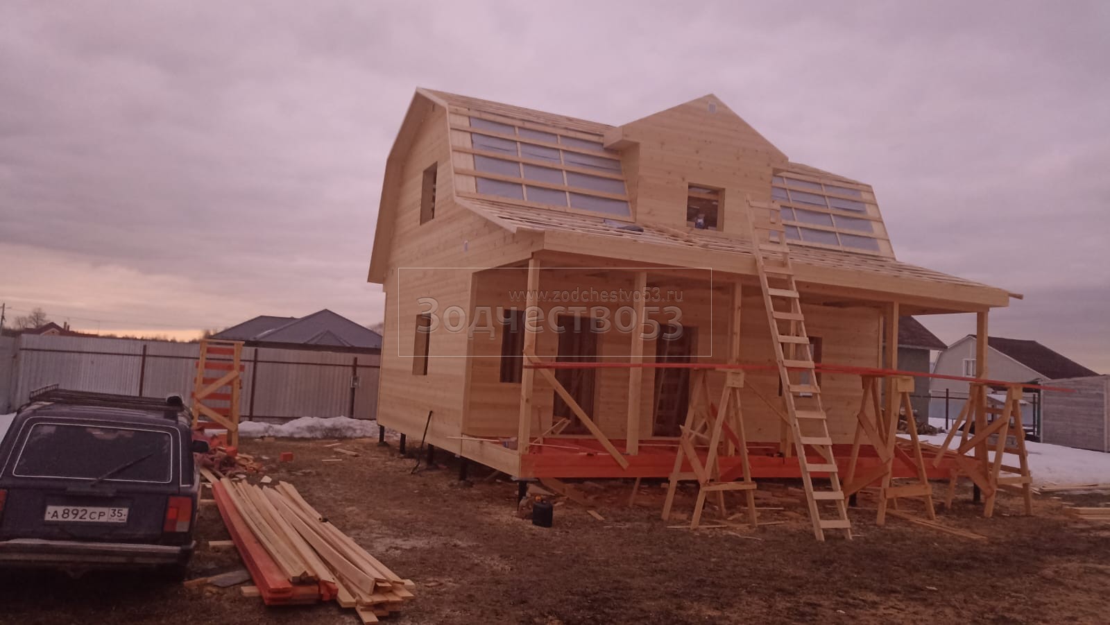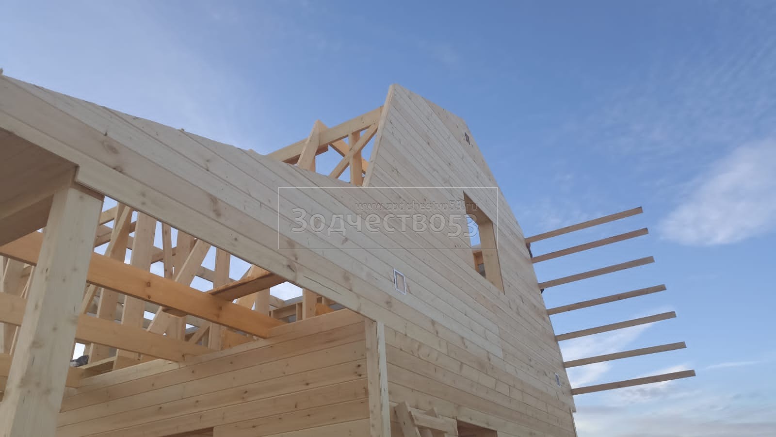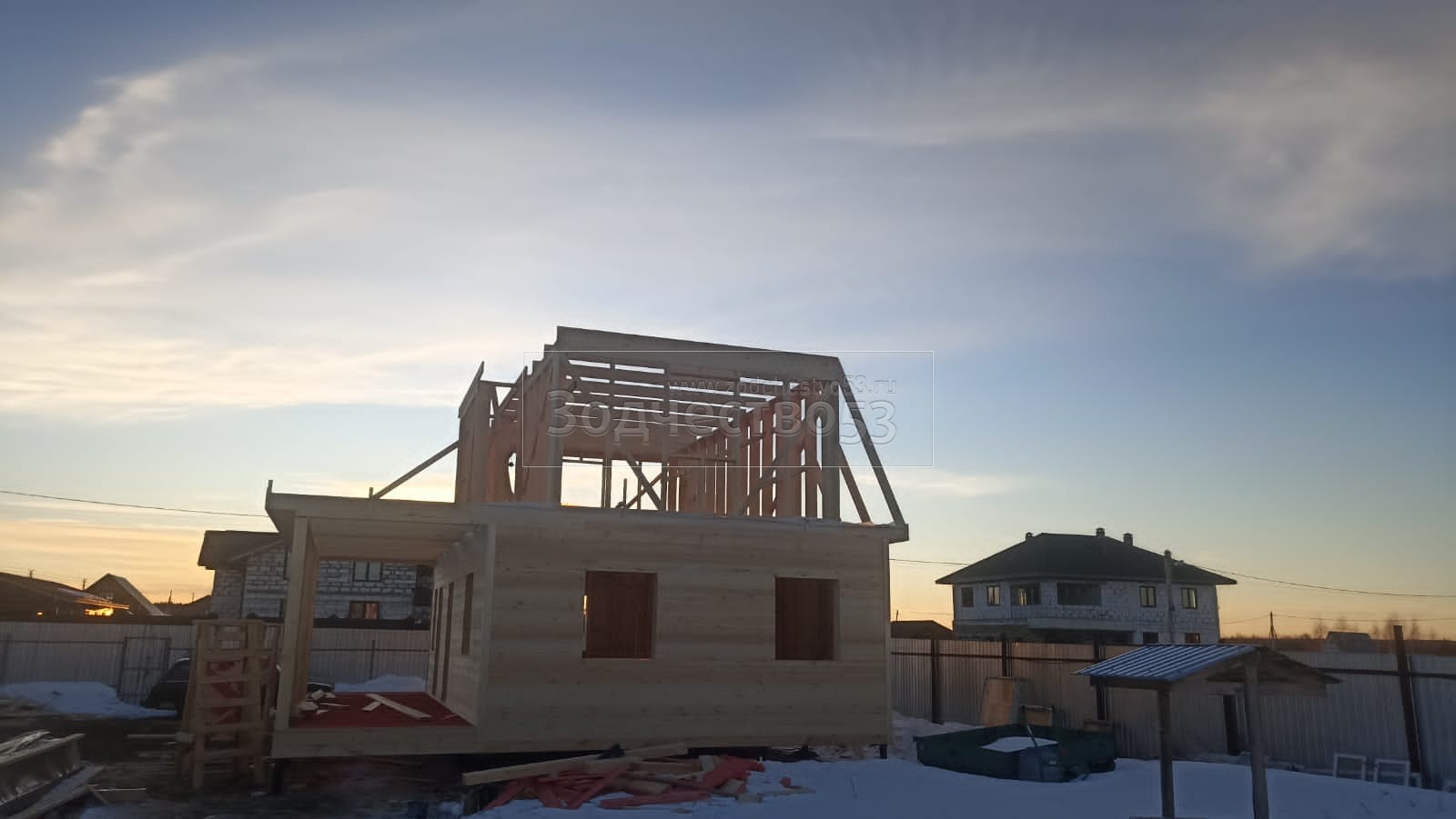 Постройка двухэтажного дома по проекту «Анна», с кукушкой общими размерами 9.0×8.50 ( 9.0×6.0 дом ) под ломаной крышей и ( кукушкой 3.0×0.75 ) под отдельной двухскатной крышей каркасно-щитовой Камерной сушки с утеплением в 200 мм (стены) и ( 9.0×2.50 открытая терраса ) под отдельной односкатной крышей .