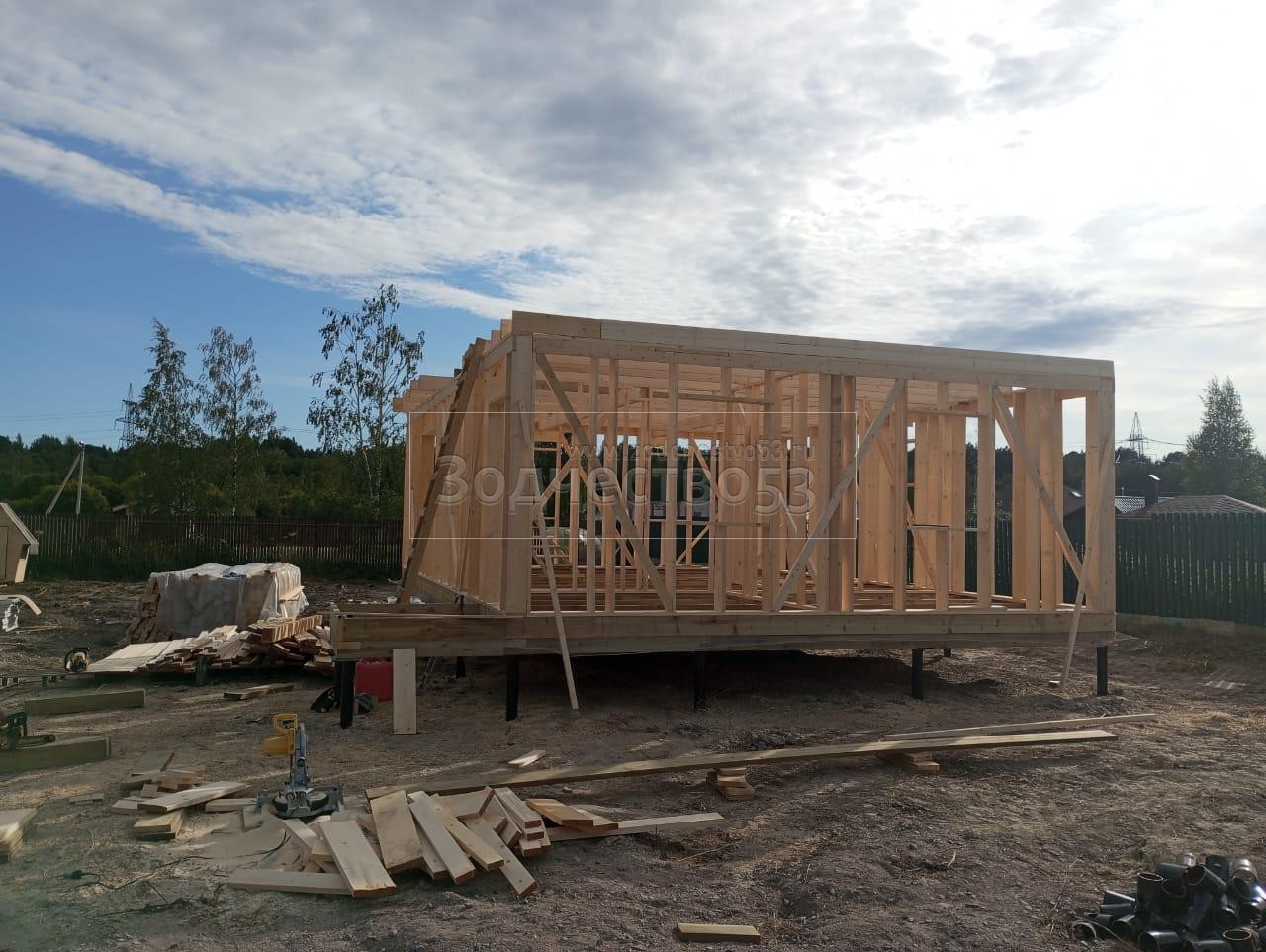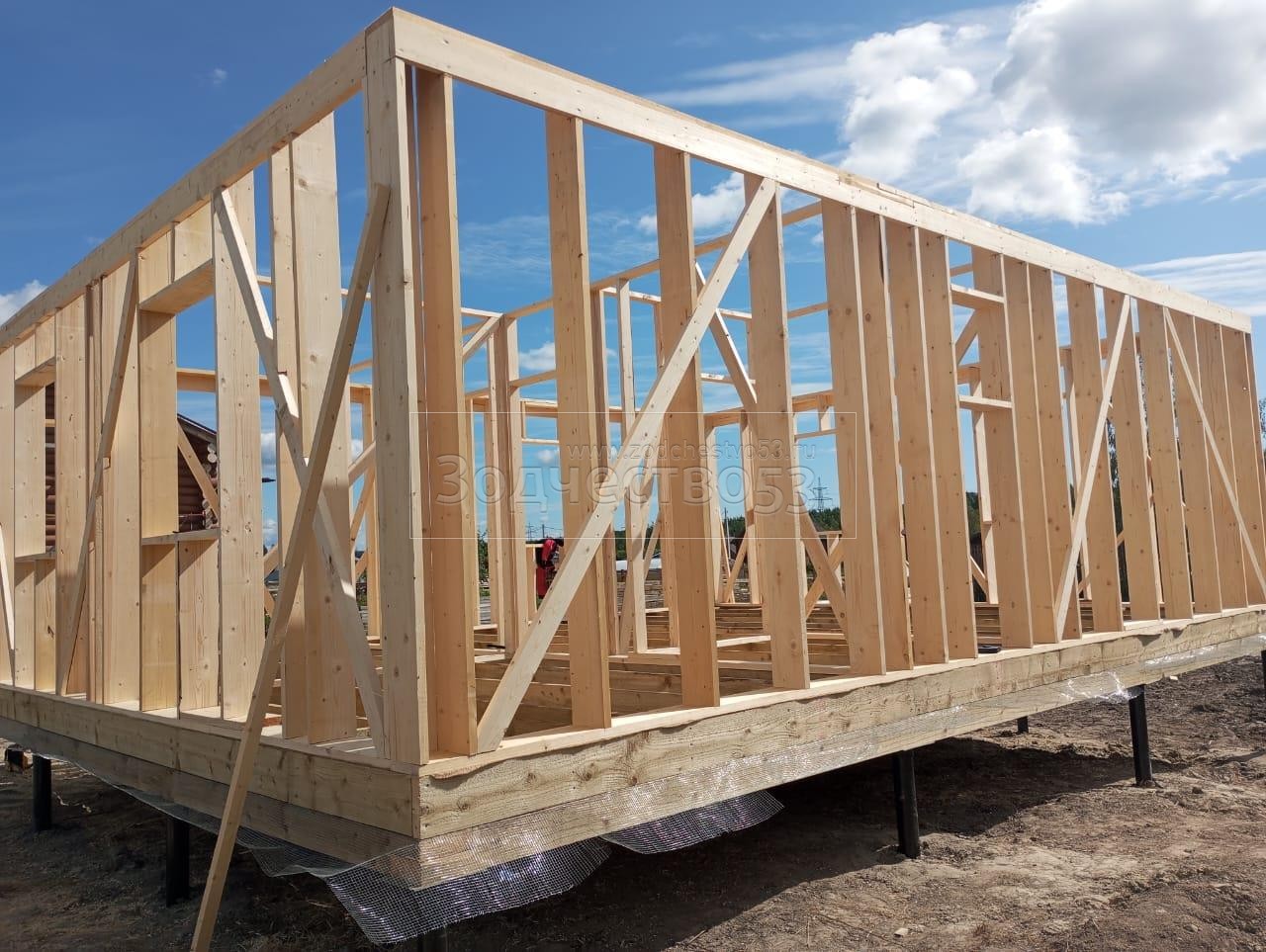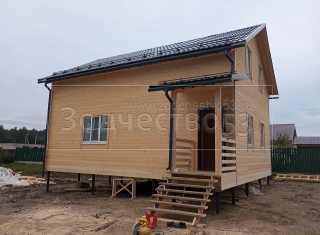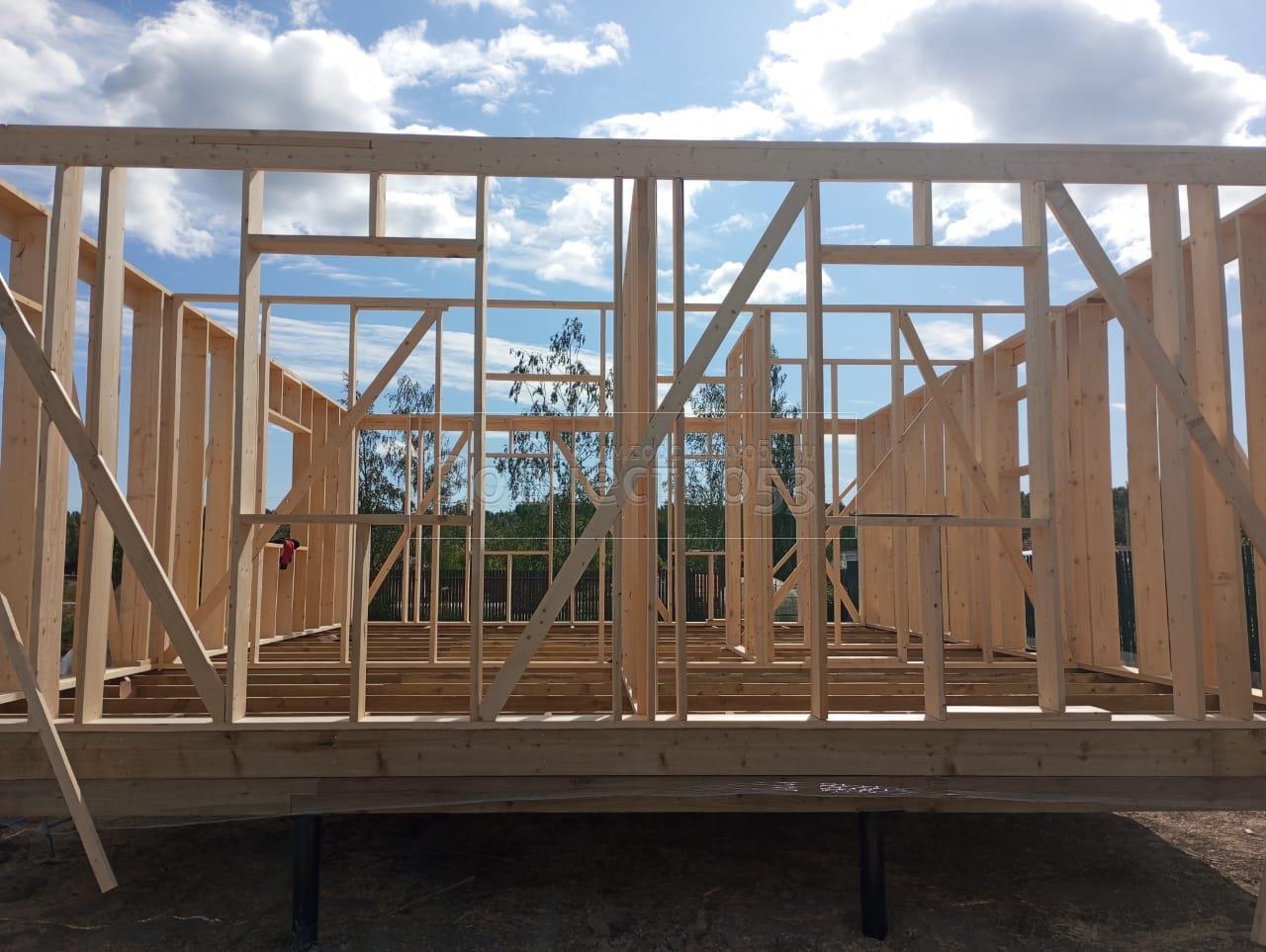 Постройка полутораэтажного дома с открытым крыльцом, общими размерами 9.0×8.50 (9.0×7.0 Дом) каркасно-щитовой (Камерной сушки) с утеплением в 200 мм (стены) под двухскатной крышей и ( 1.50×1.50 открытое крыльцо ) под отдельной односкатной крышей.