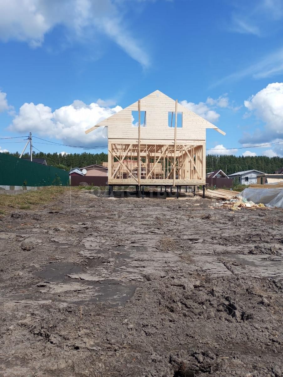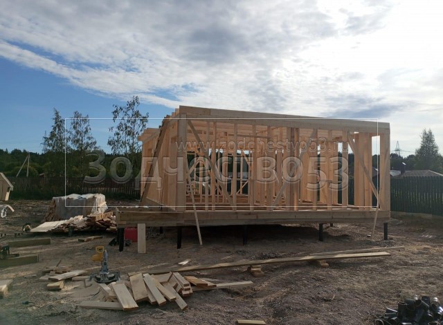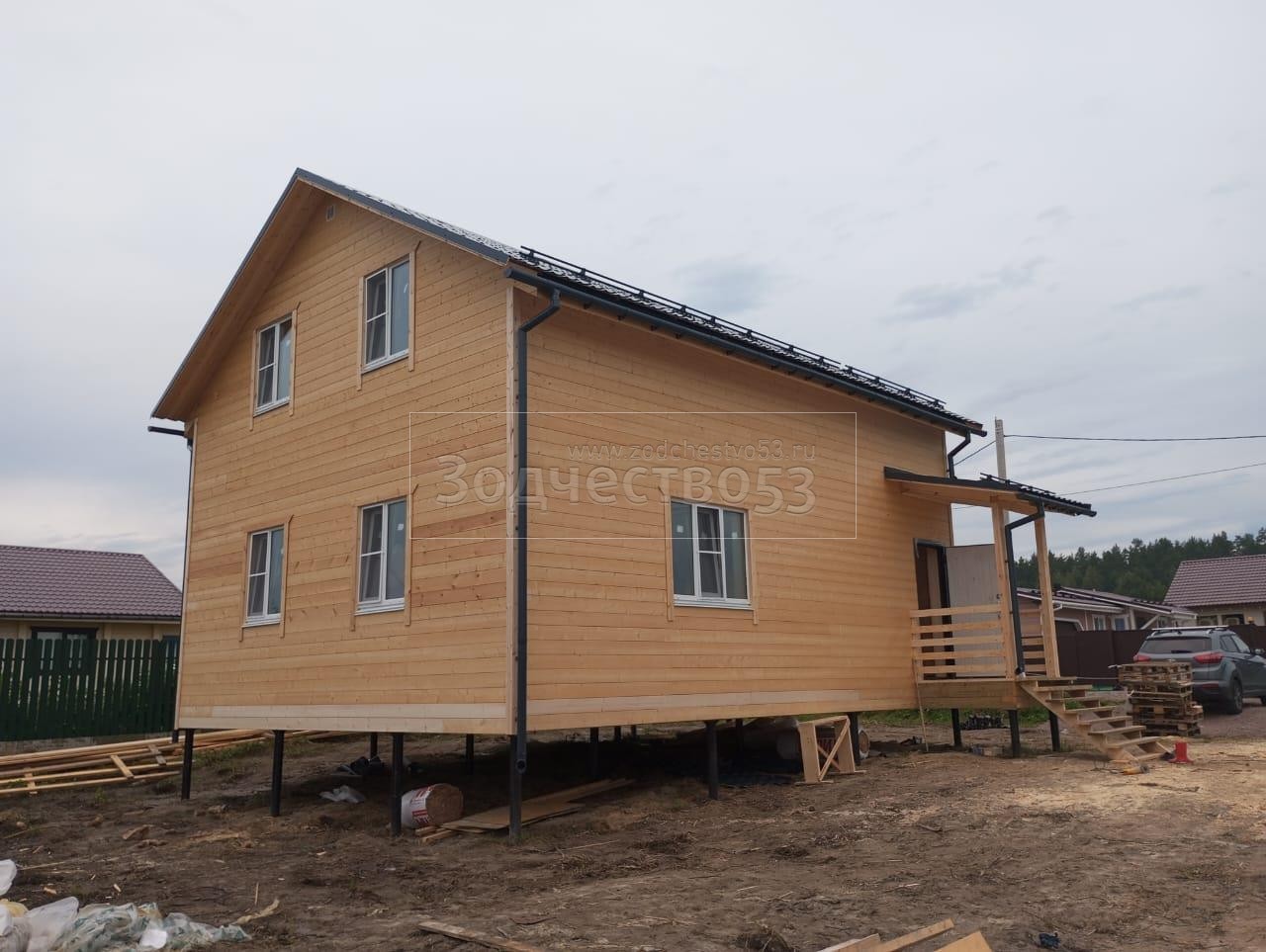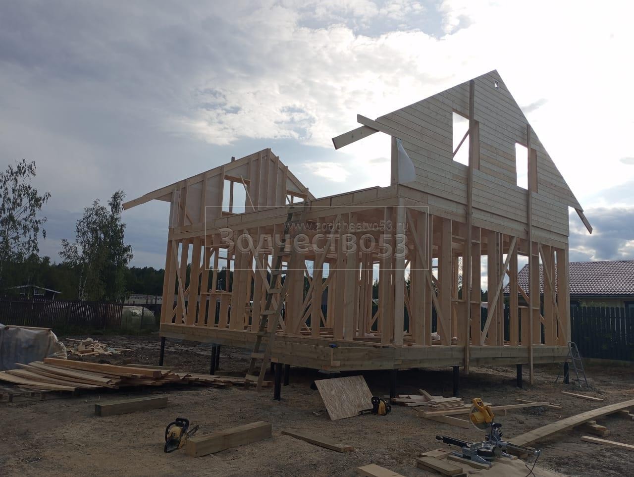 Постройка полутораэтажного дома с открытым крыльцом, общими размерами 9.0×8.50 (9.0×7.0 Дом) каркасно-щитовой (Камерной сушки) с утеплением в 200 мм (стены) под двухскатной крышей и ( 1.50×1.50 открытое крыльцо ) под отдельной односкатной крышей.