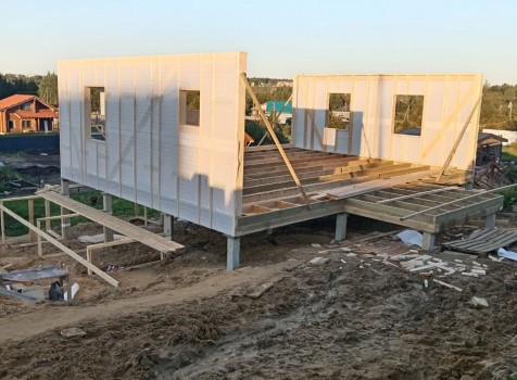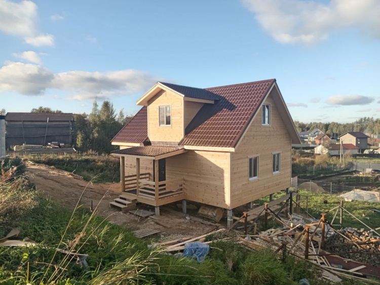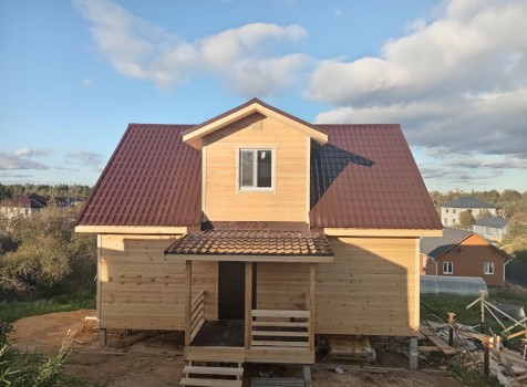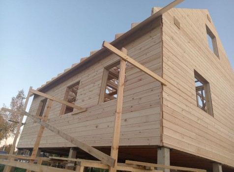 Постройка двухэтажного дома с открытой террасой, общими размерами 9.0×9.0 ( 7.0×9.0 дом ) под двухскатной крышей и ( 1.0×3.0 кукушка ) под отдельной двухскатной крышей каркасно—щитовой с утеплением в 150 мм Камерной сушки (стены) и ( 2.0×3.0 открытая терраса ) под отдельной односкатной крышей по пректу: Алина