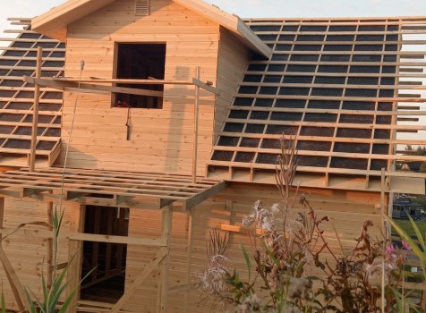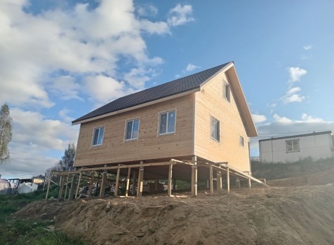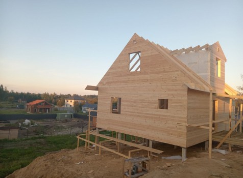 Постройка двухэтажного дома с открытой террасой, общими размерами 9.0×9.0 ( 7.0×9.0 дом ) под двухскатной крышей и ( 1.0×3.0 кукушка ) под отдельной двухскатной крышей каркасно—щитовой с утеплением в 150 мм Камерной сушки (стены) и ( 2.0×3.0 открытая терраса ) под отдельной односкатной крышей по пректу: Алина