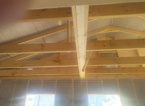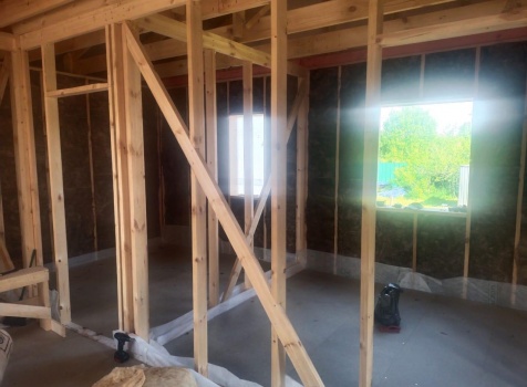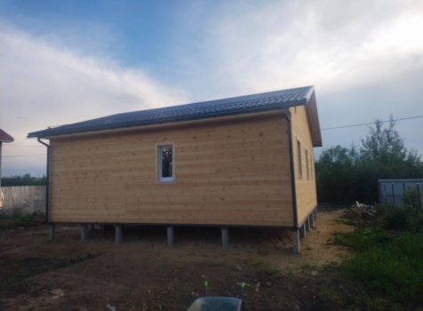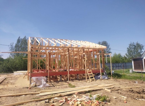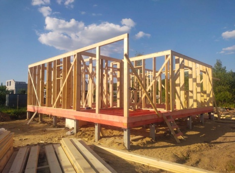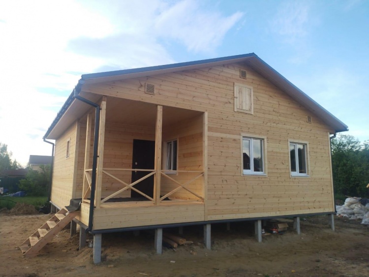 Постройка одноэтажного дома с открытой террасой общими размерами ( 9.0×9.0 каркасно-щитовой Камерной сушки с утеплением в 200 мм (стены) под двухскатной крышей по проекту : https://zodchestvo53.ru/evgeniya