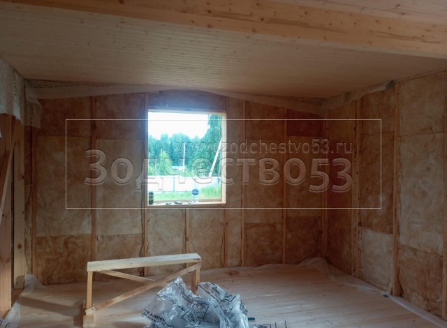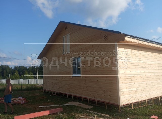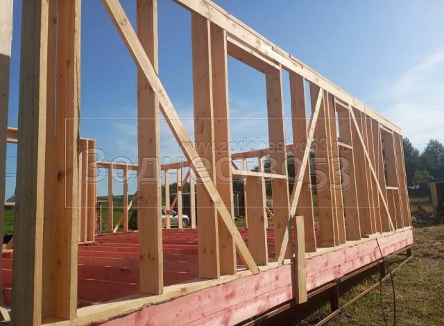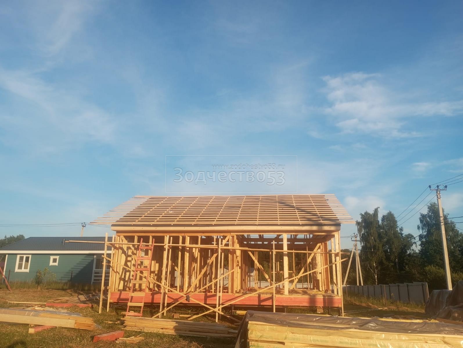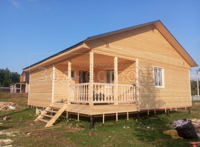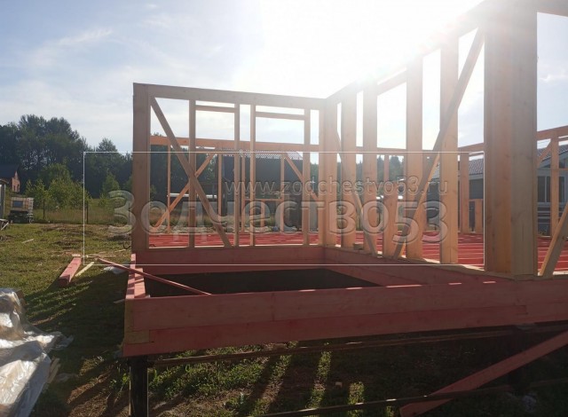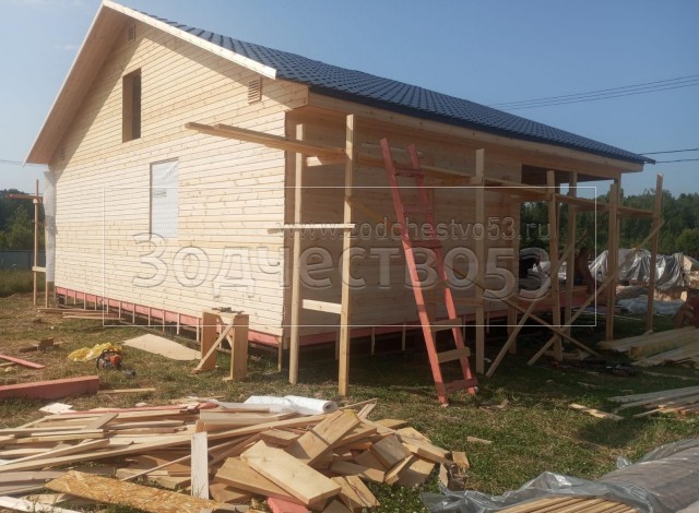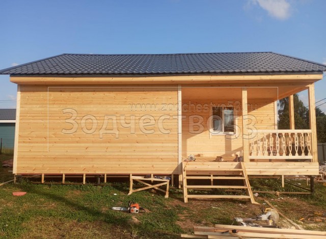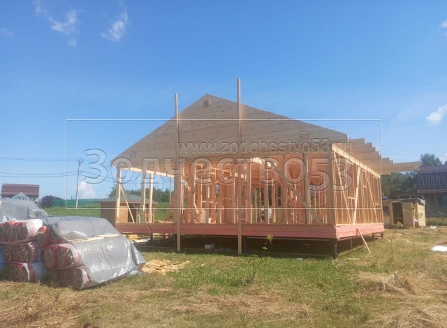 Постройка одноэтажного дома с открытой террасой общими размерами ( 9.0×9.0 каркасно-щитовой (Камерной сушки) с утеплением в 200 мм (стены) под общей двухскатной крышей по проекту : https://zodchestvo53.ru/korneliy