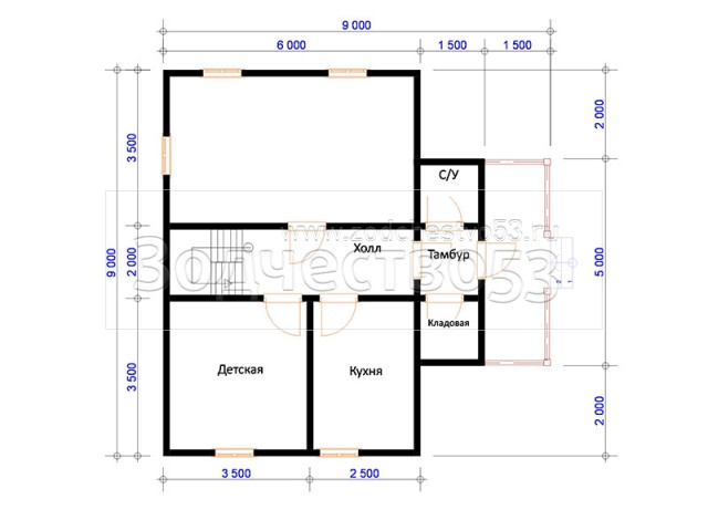 Первый этаж: гостиная 30,95 м²,  кухня 7,96 м², детская 11,32 м², санузел 1,86 м², доп. помещение 1,86 м², прихожая 2,55 м², крыльцо 7,5 м².