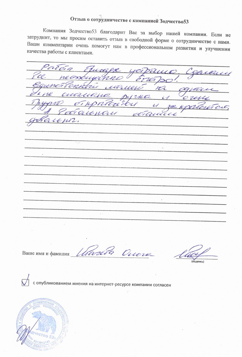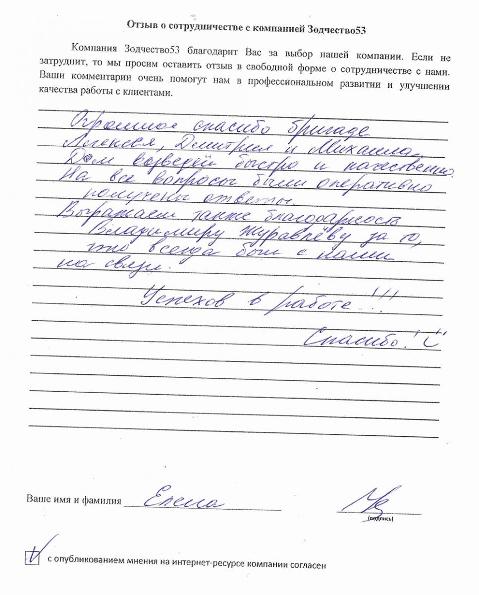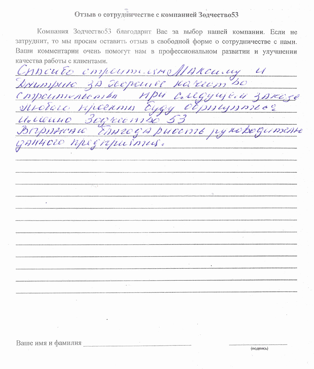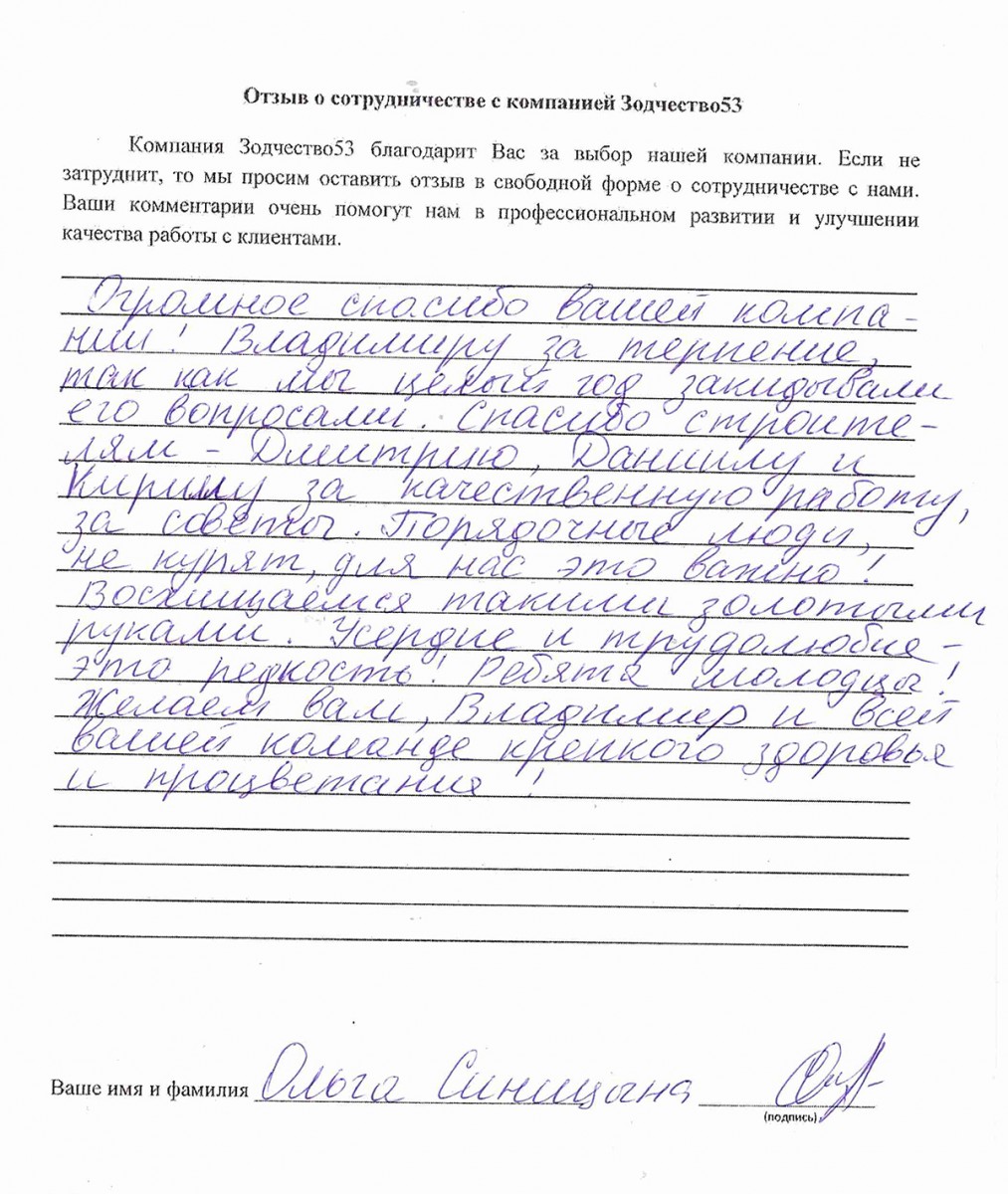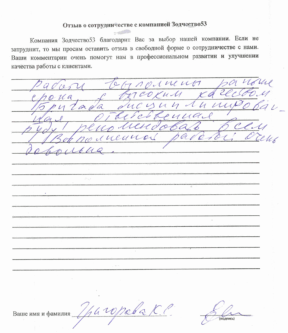 Отзыв о работе СК "Зодчество53" - 21.05.2021