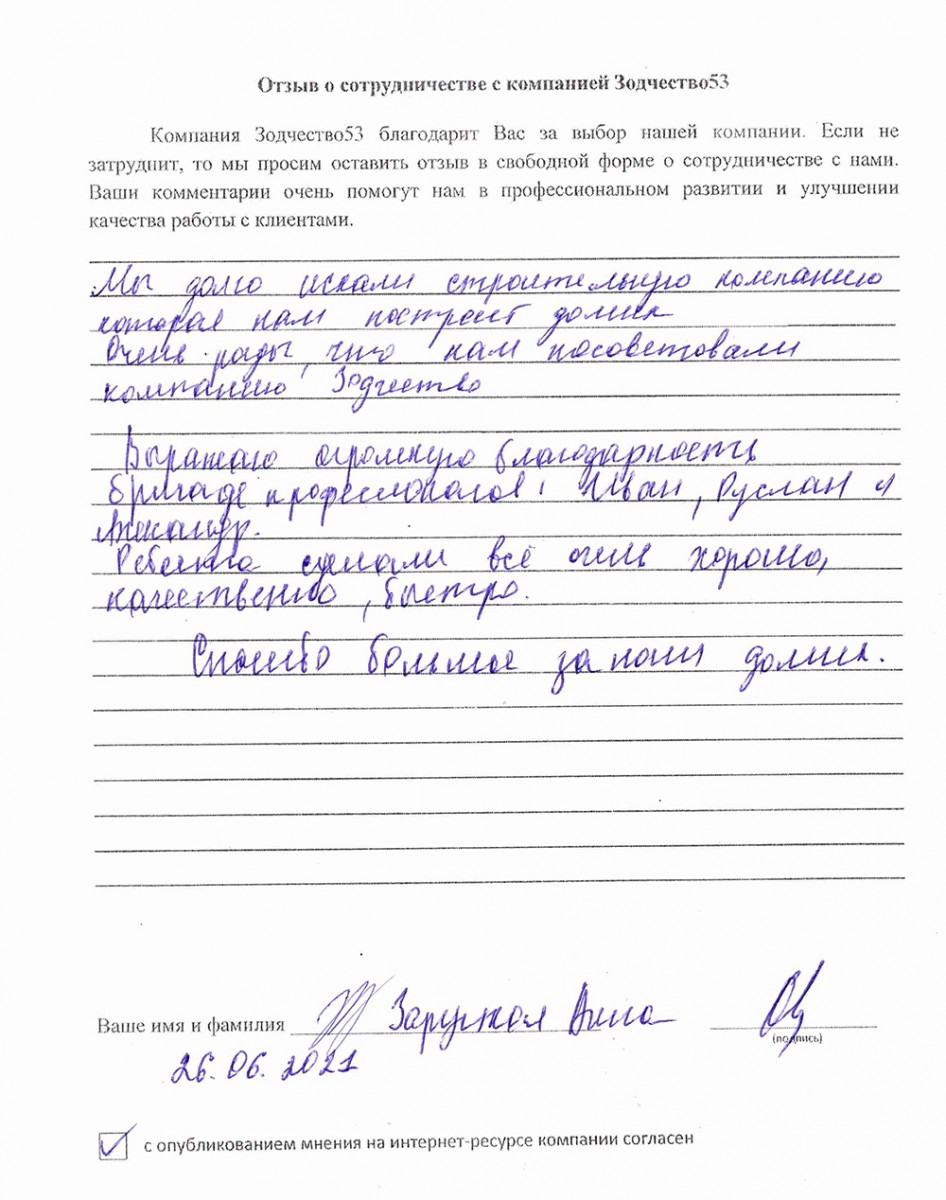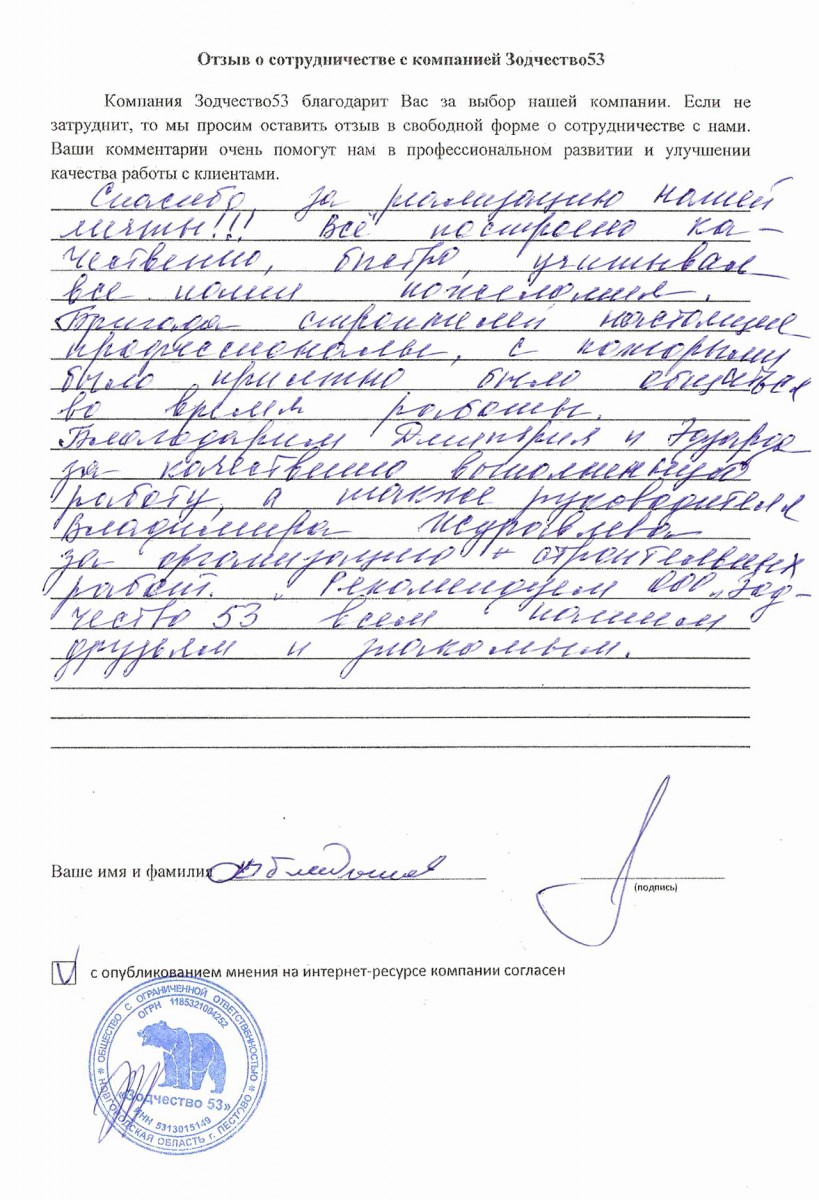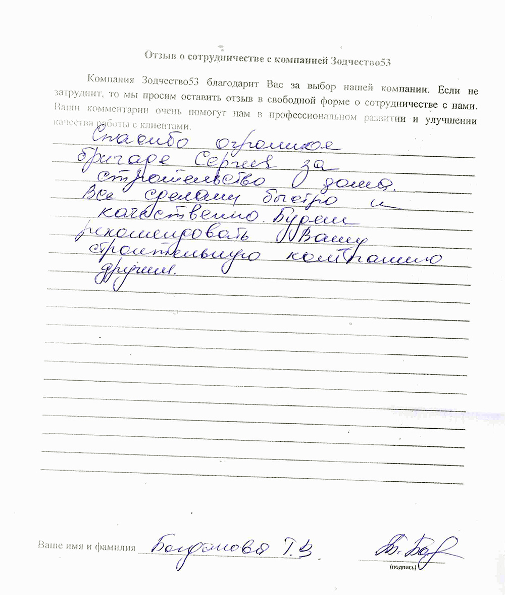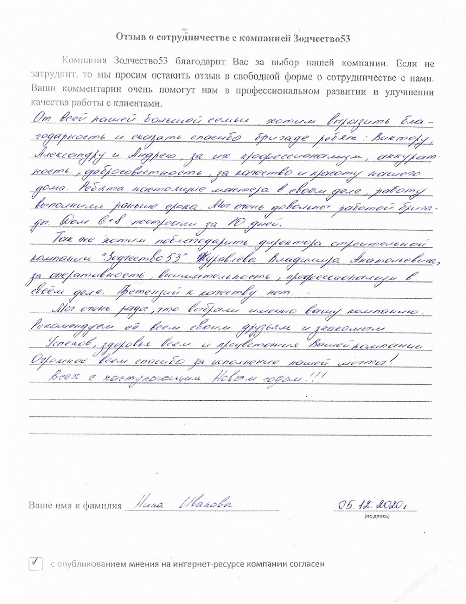 Отзыв о работе СК "Зодчество53" - 21.05.2021
