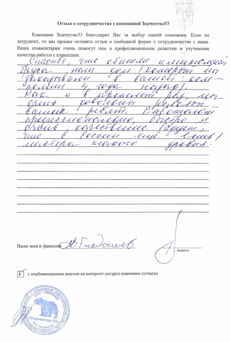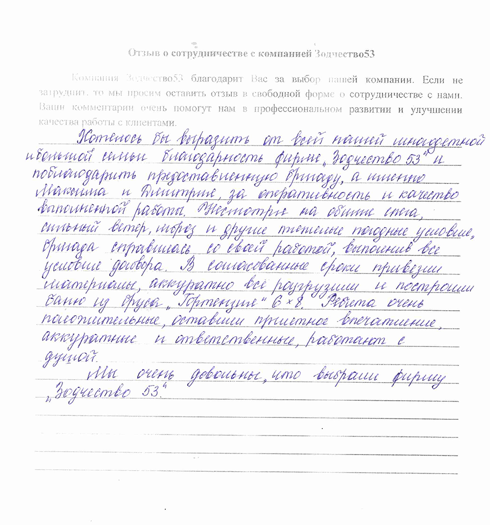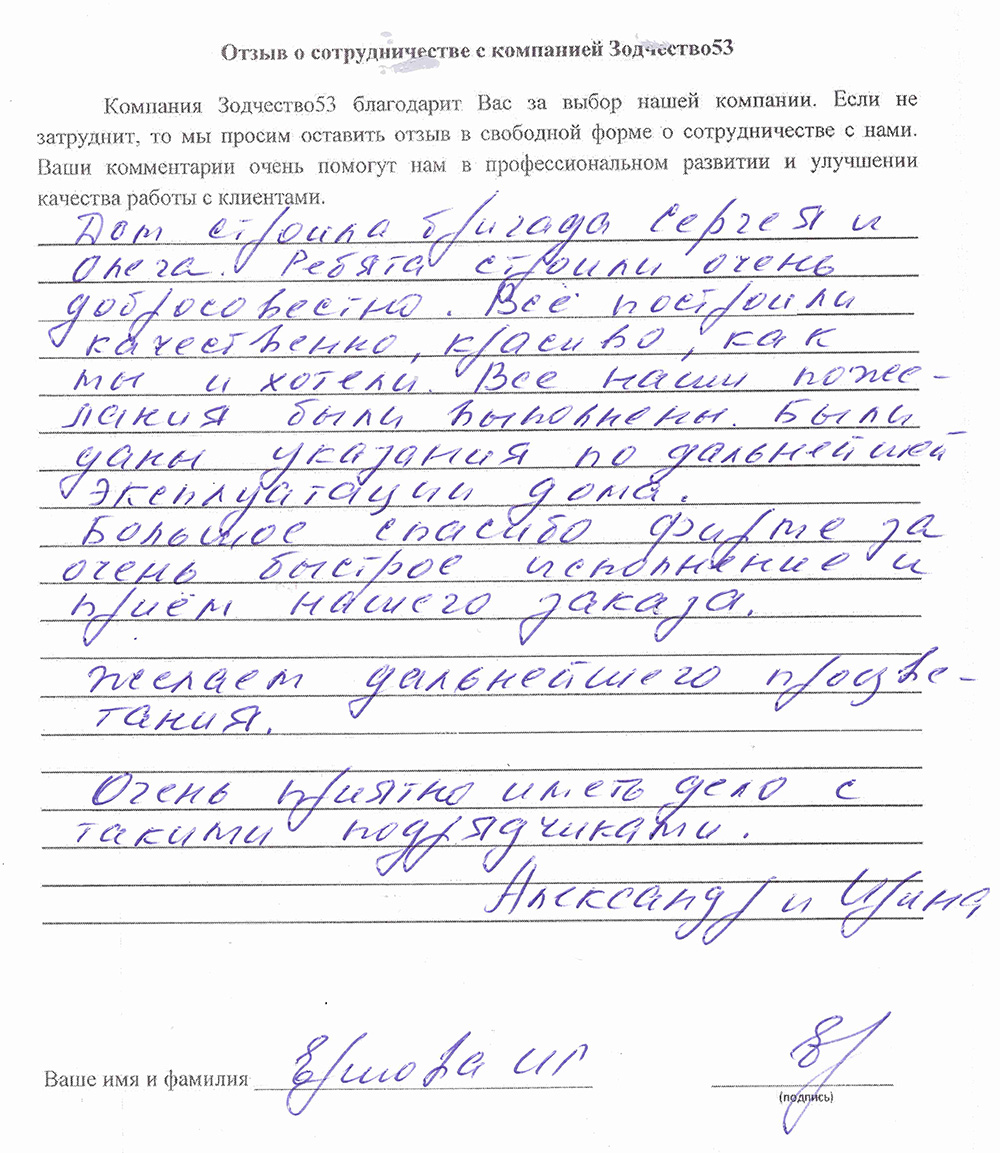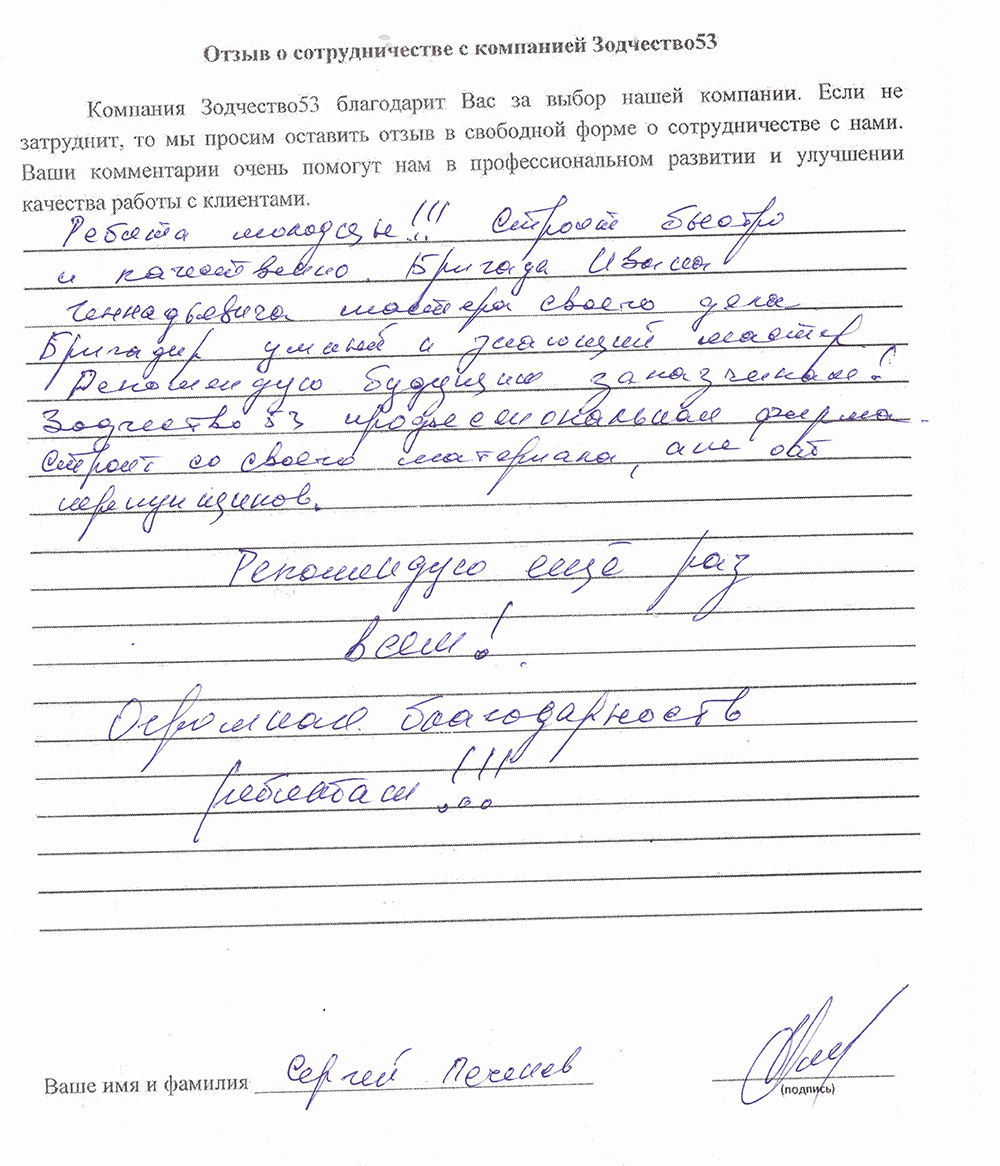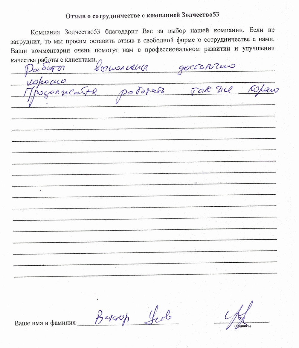 Отзыв о работе СК "Зодчество53" - 21.05.2021