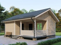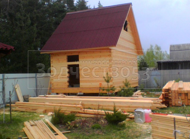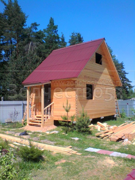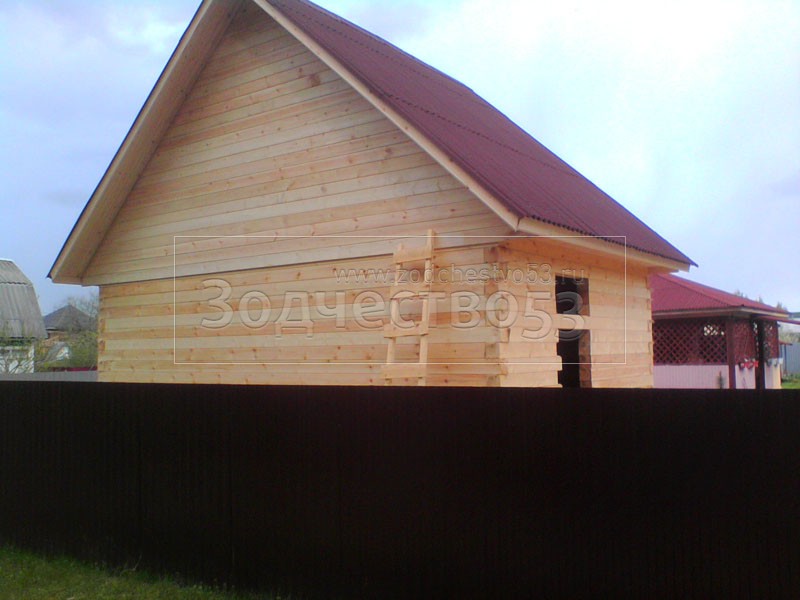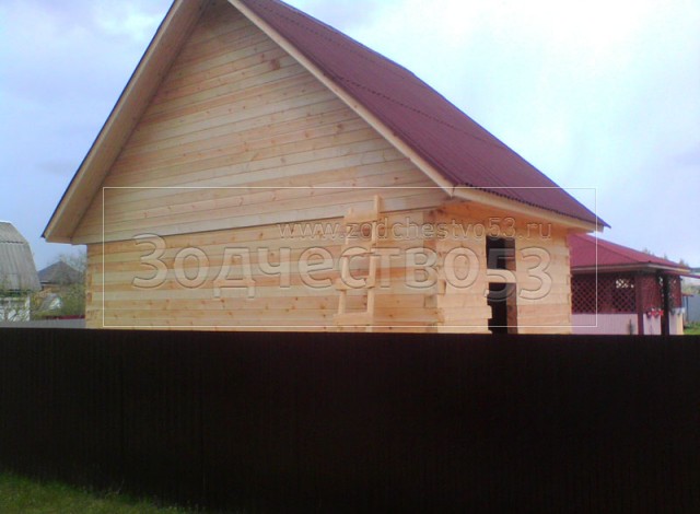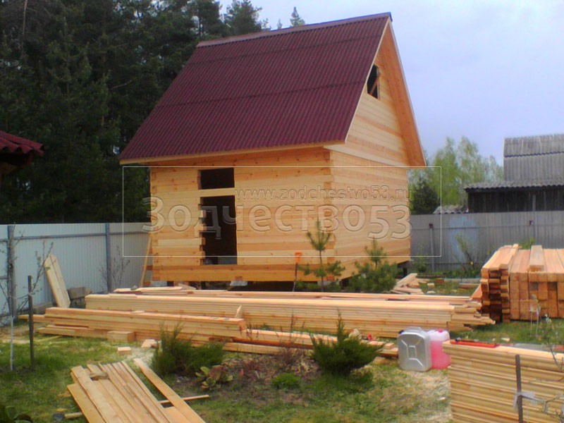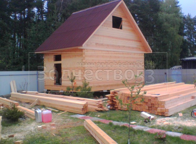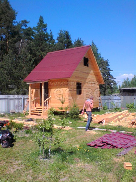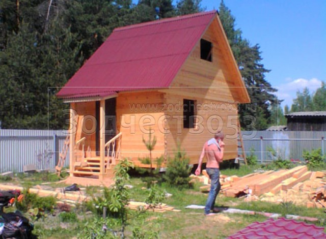 Баня по проекту Жасмин 6×4 из профилированного бруса 150×150. Фронтон по длинной стороне. Построена в апреле 2014 года в Московской области Егорьевском районе СТ Дубрава-2.