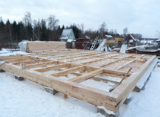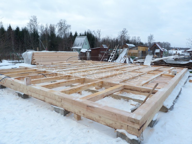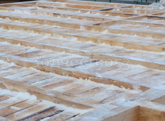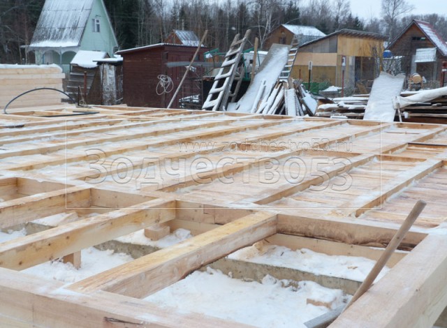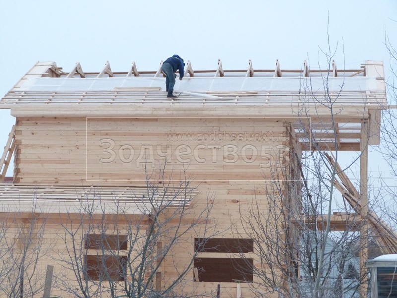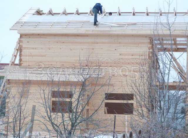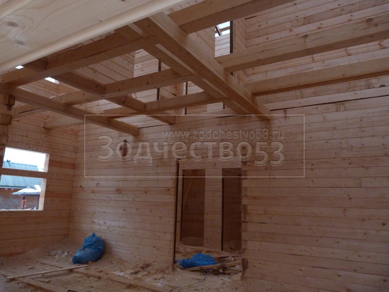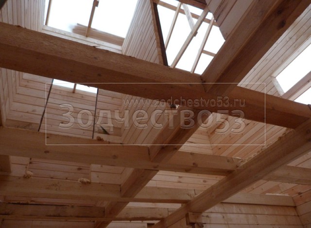 2.55-2.60, сборка на нагеля в тёплый угол. - Стропильная конструкция: межэтажные перекрытия 40×150 через 90 см, стропила 40×150 через 90 см.