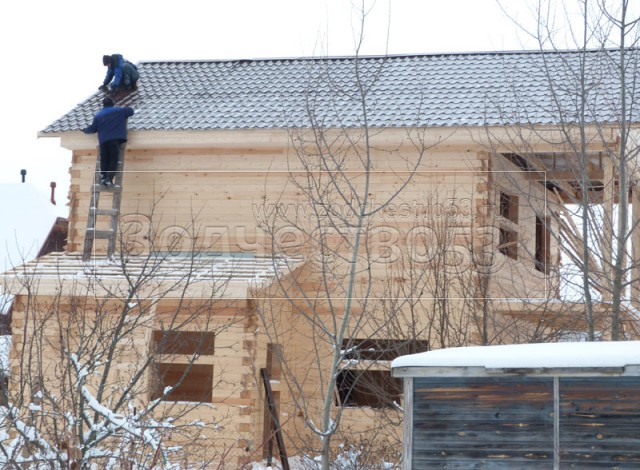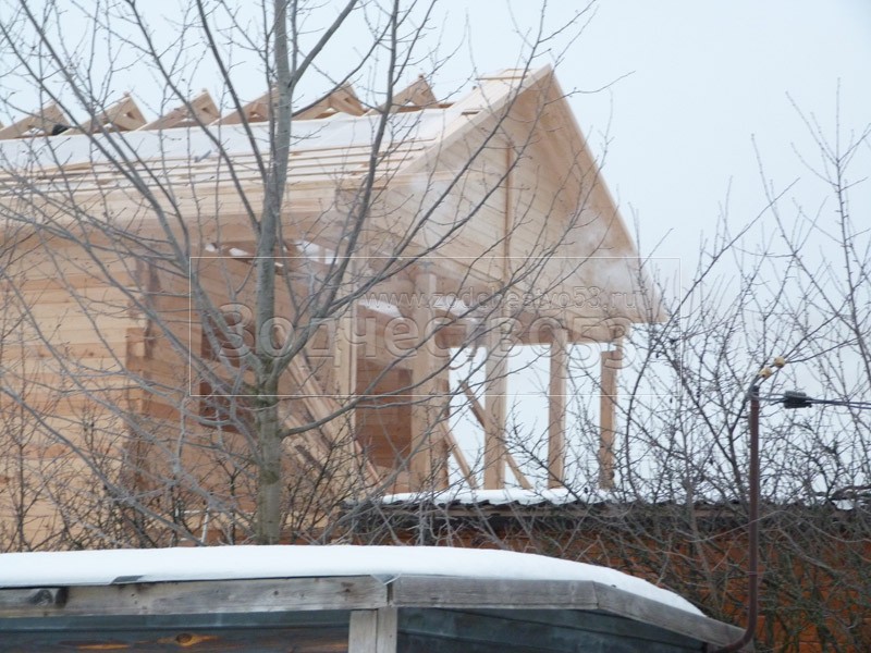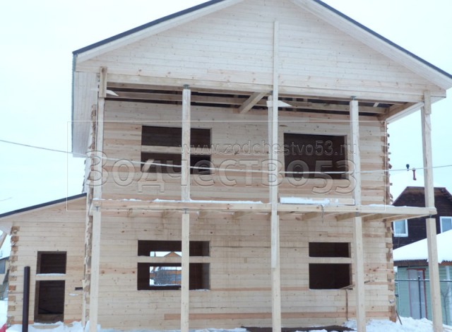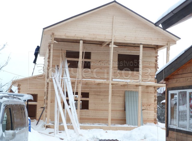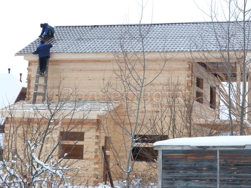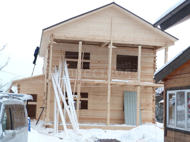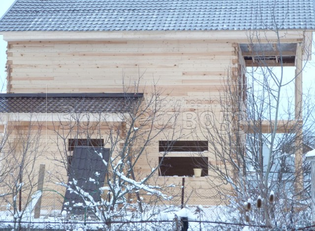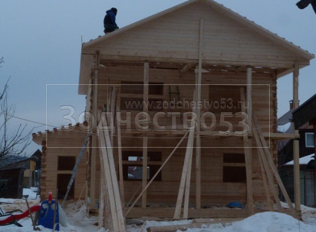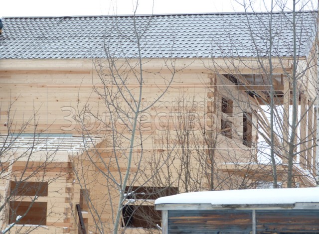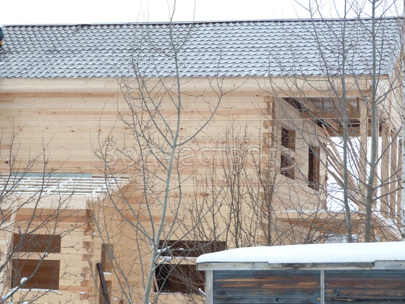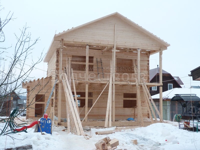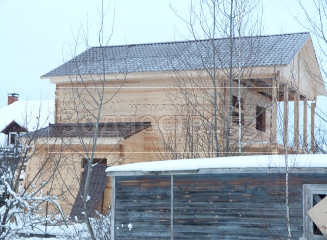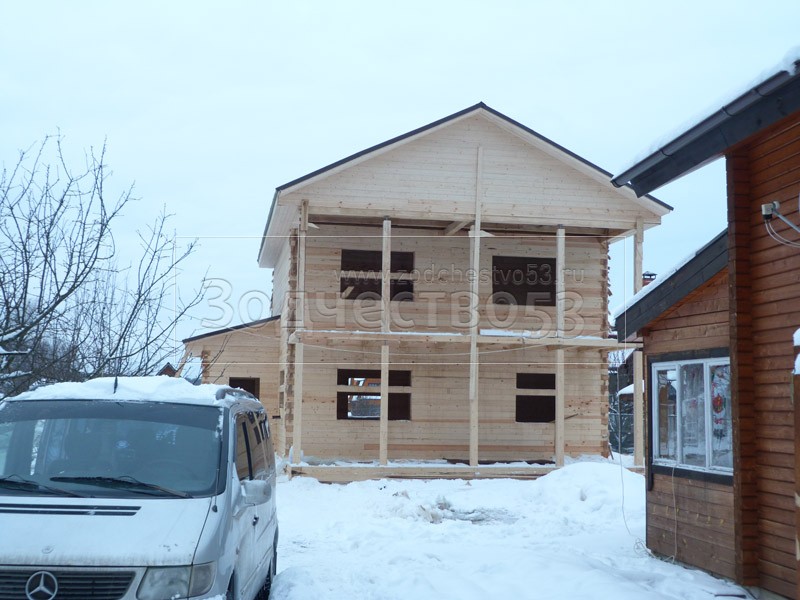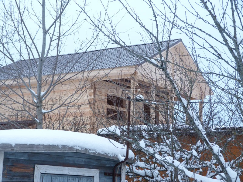 Сруб дома по проекту Д-71, общими размерами 10.0×10.2 из профилированного бруса 150×200 (Дом 8×8 в два этажа + пристройка 2.0×4.5 на 1 этаже под отдельной крышей и терраса с балконом 2.2×8.0 открытые под общей двухскатной крышей). Построен с 20 декабря 2014 по 05 февраля 2015 в Московской области, Подольском районе, Кленовский с.о
