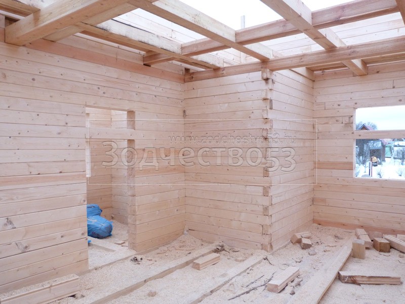 - Перегородки из профилированного бруса 100×150 (прямой), с проложкой льнополотна, в 21 венец врезались межэтажные перекрытия из бруса 150×150.
