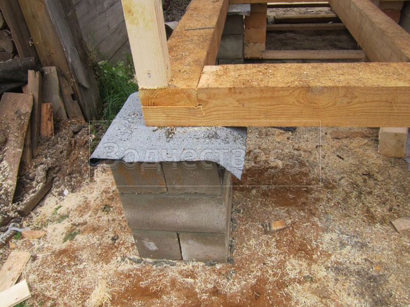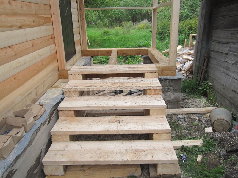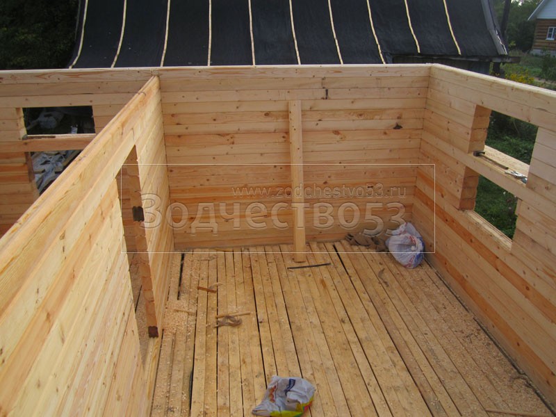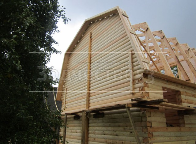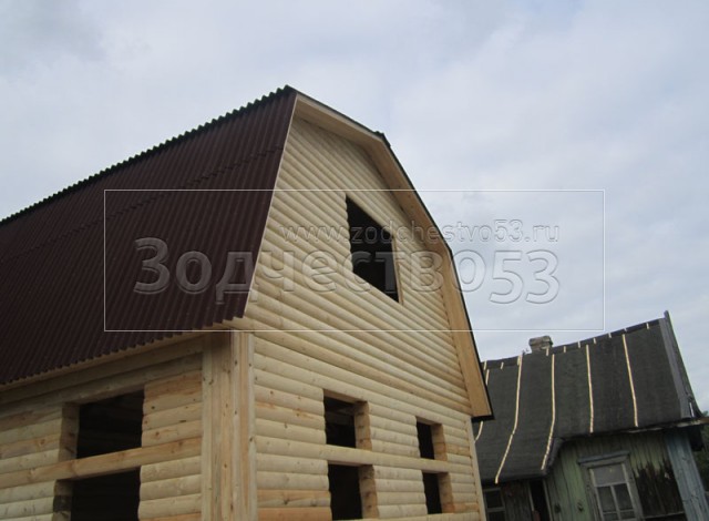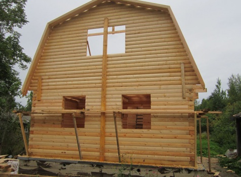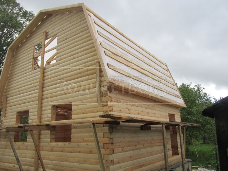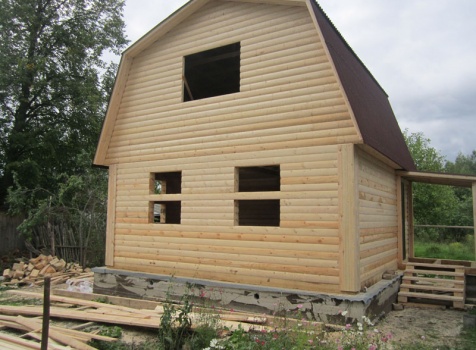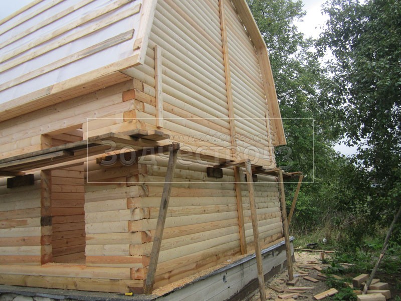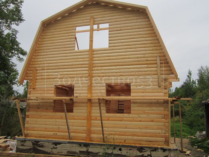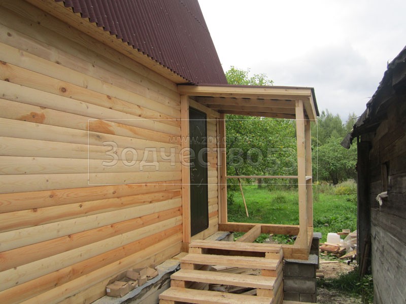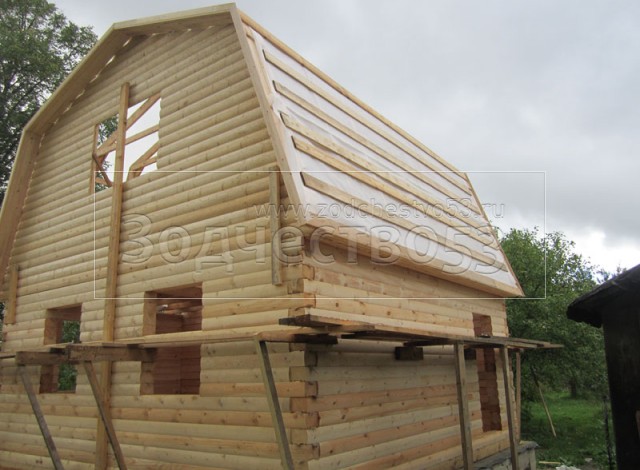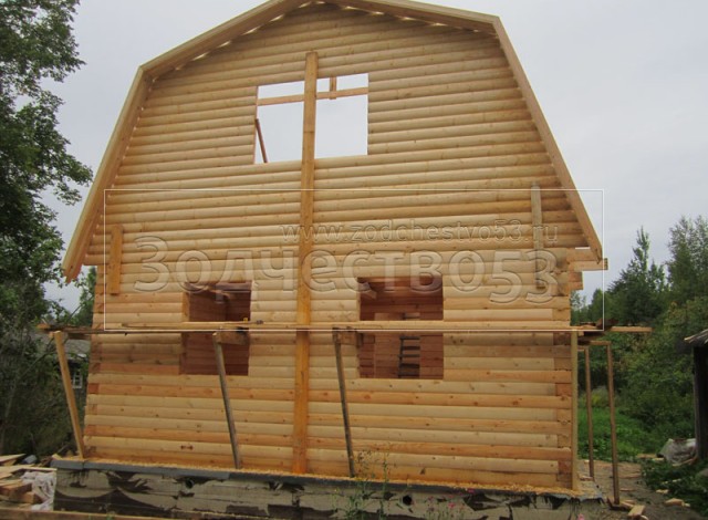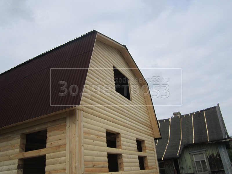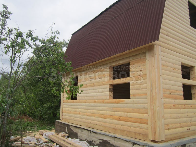 Сруб дома 6×6 м. из профилированного бруса 200×150 (овал) под ломанной крышей и открытым крыльцом 2*2 с резными балясинами под отдельной крышей. Построен в Тверской области, Калининском районе, д. Клеопино