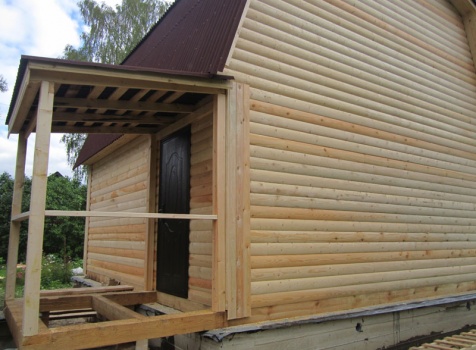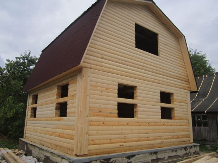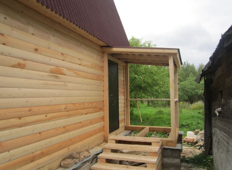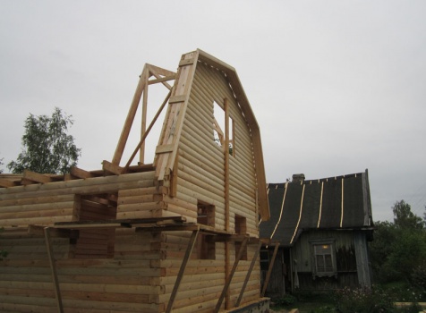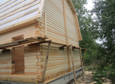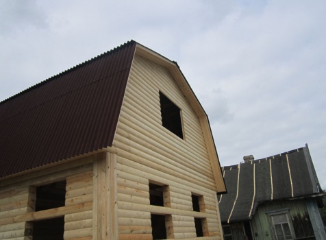 Сруб дома 6×6 м. из профилированного бруса 200×150 (овал) под ломанной крышей и открытым крыльцом 2*2 с резными балясинами под отдельной крышей. Построен в Тверской области, Калининском районе, д. Клеопино