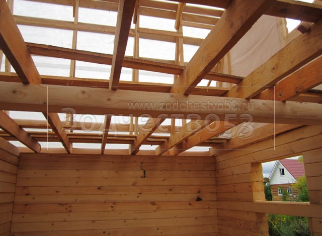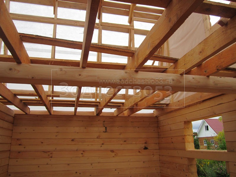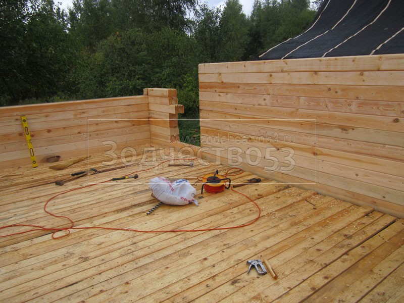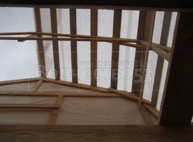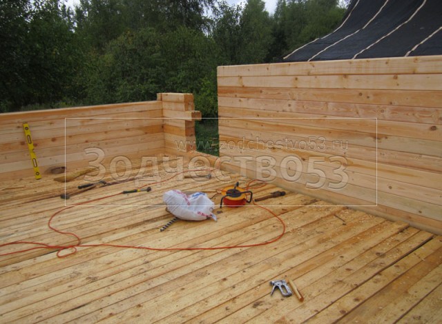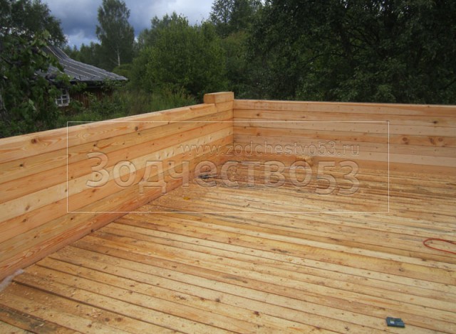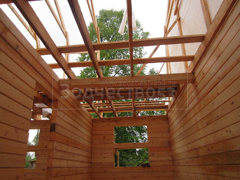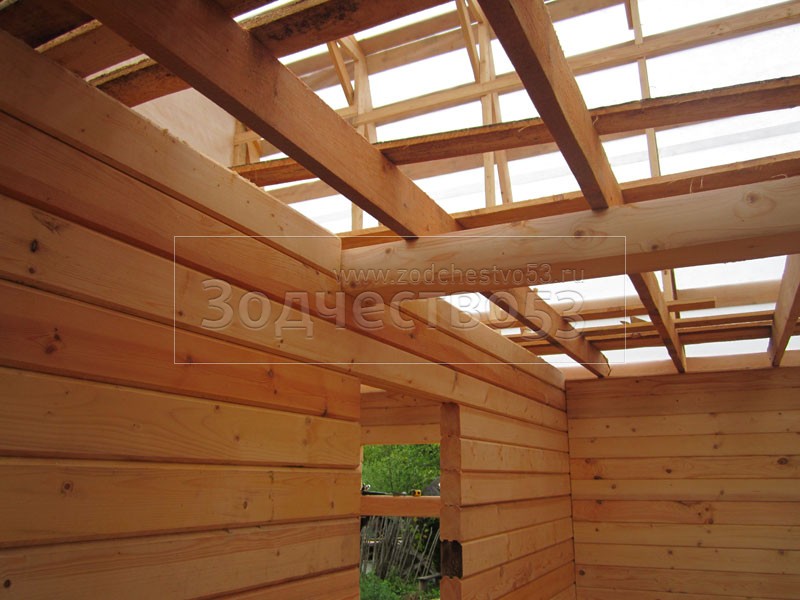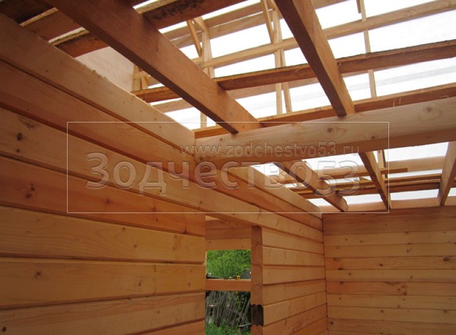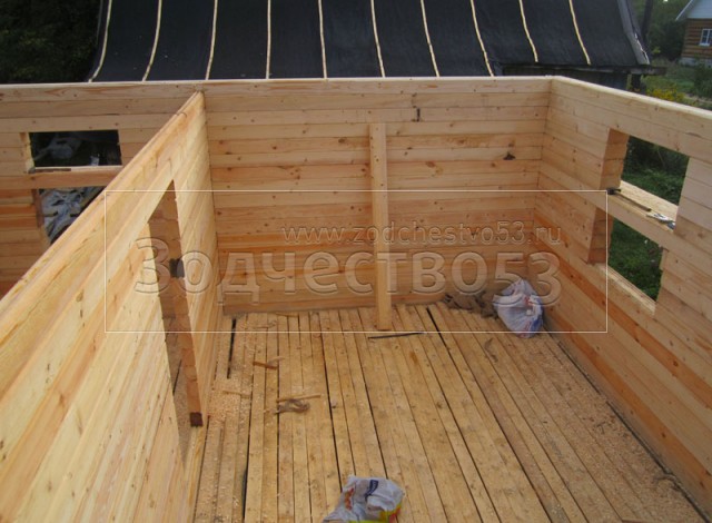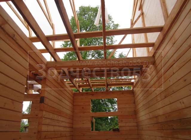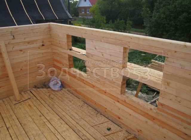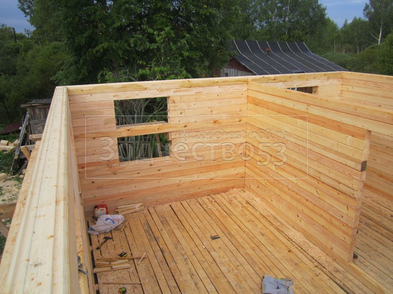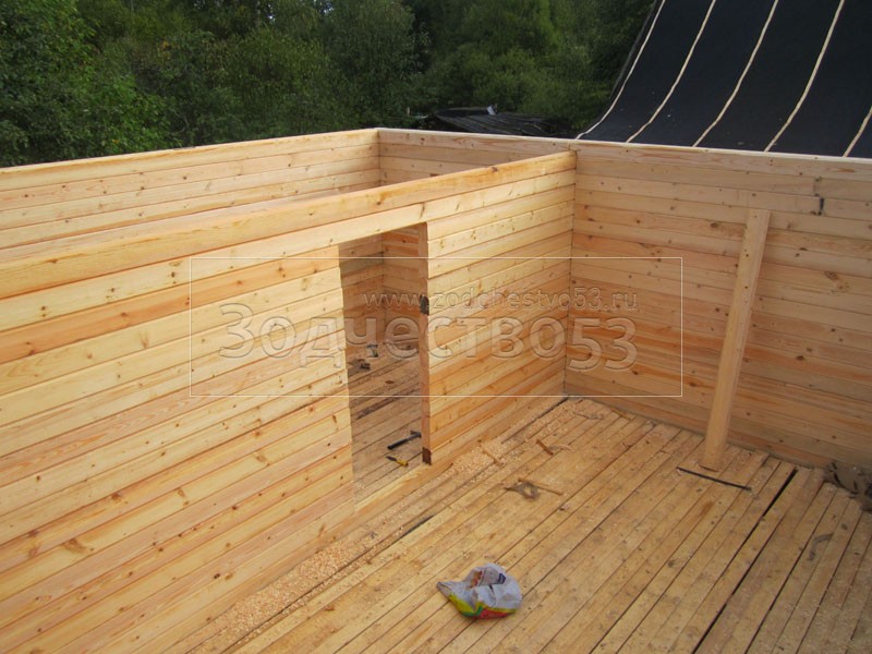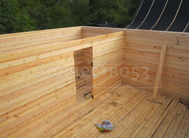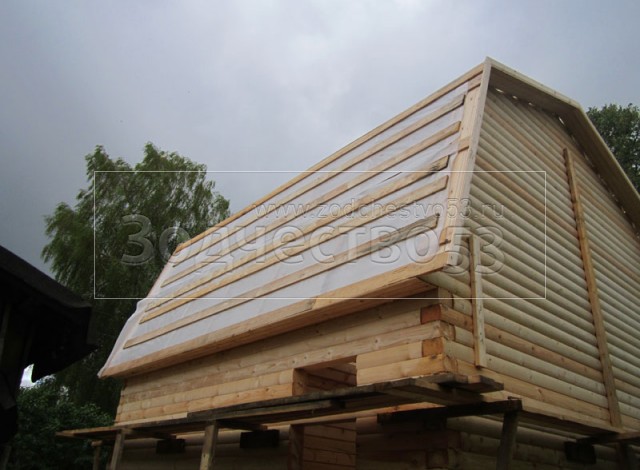 - Фронтоны — каркасно-щитовые, обшитые блок-хаусом.
