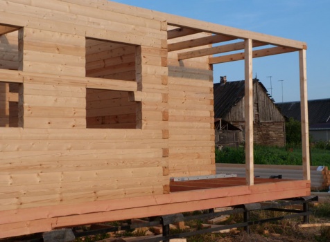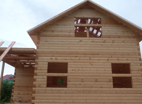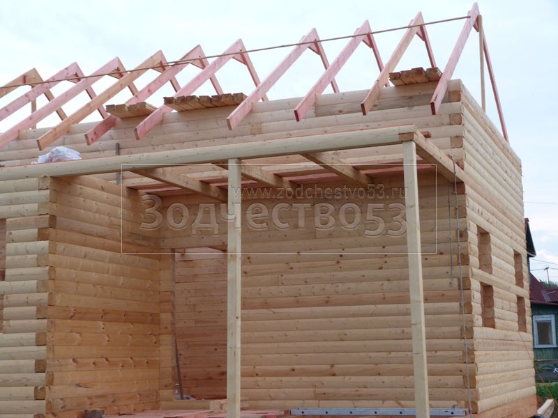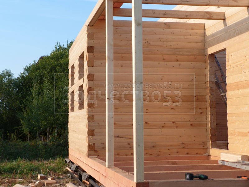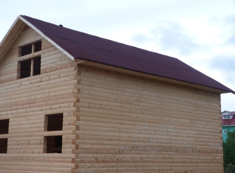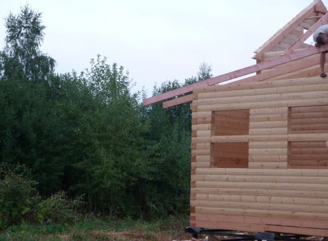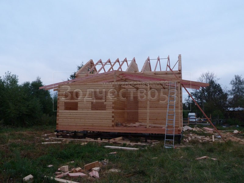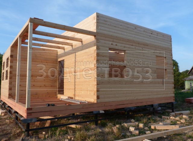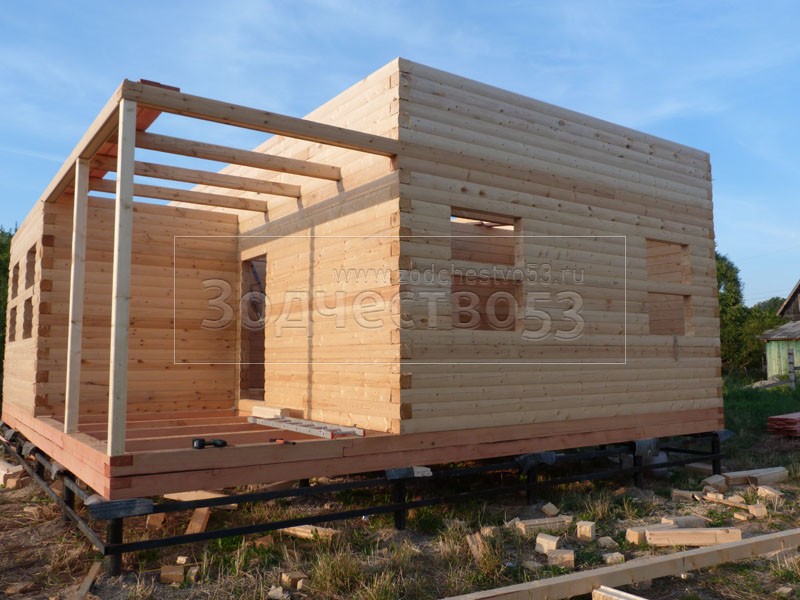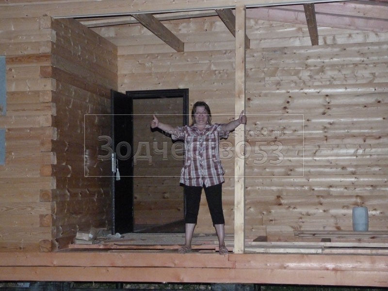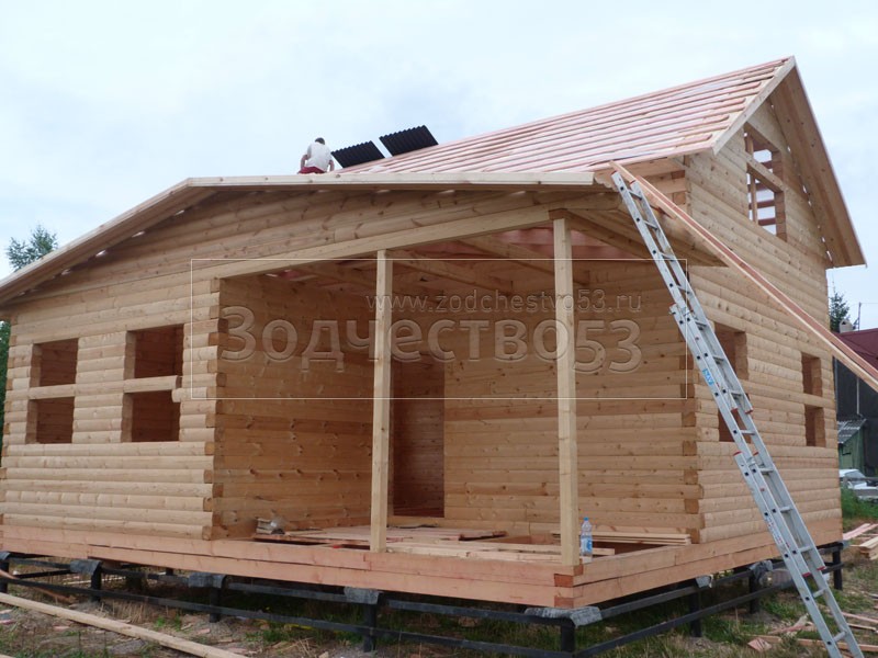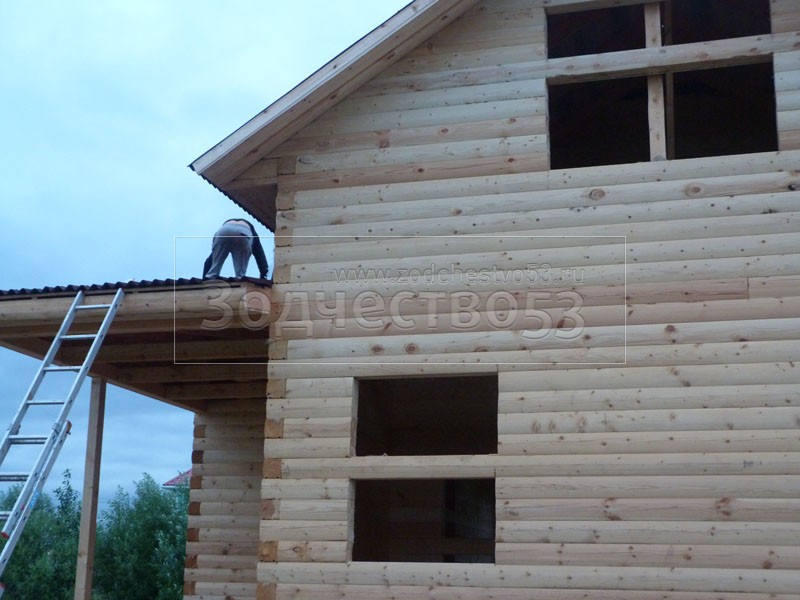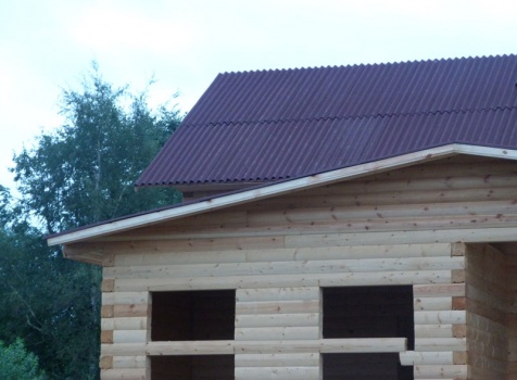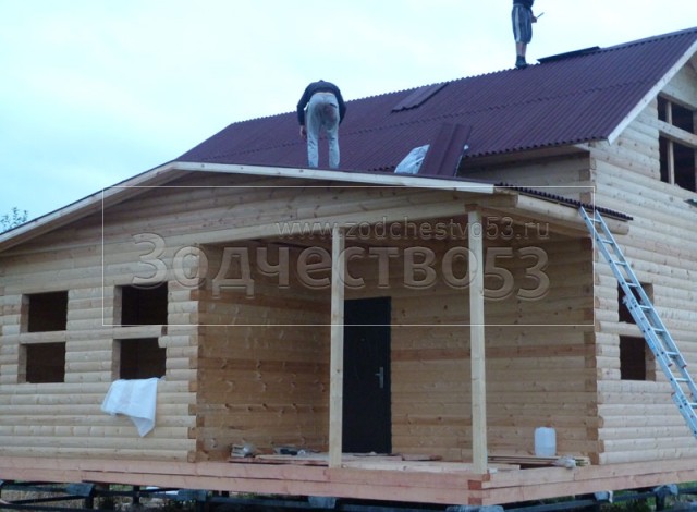 Cруб дома 8×8 по проекту Д-48 из профилированного бруса 150×150 с брусовыми фронтонами (5,5×8 дом с полуторным этажом под двухскатной крышей и веранда 2.5×8). Построен в августе 2014 г. в Ленинградской области, Ломоносовском районе, д. Верхняя Колония.