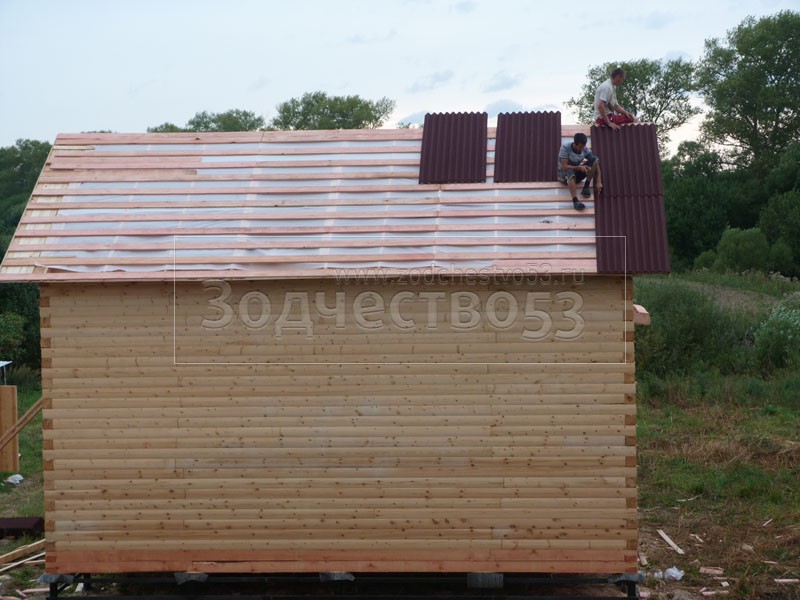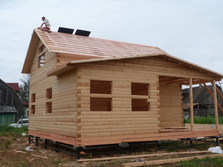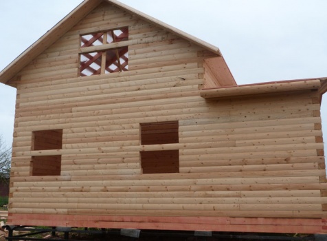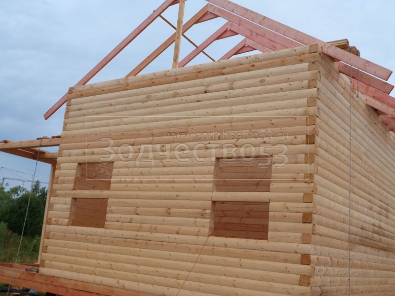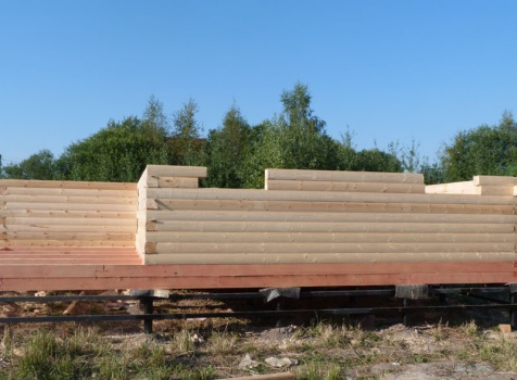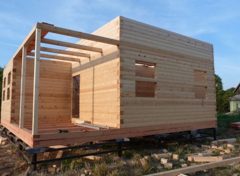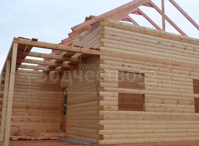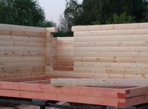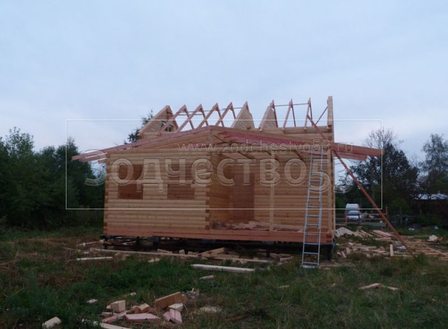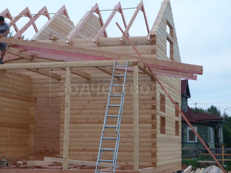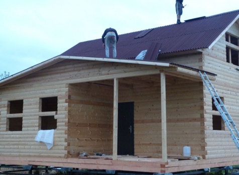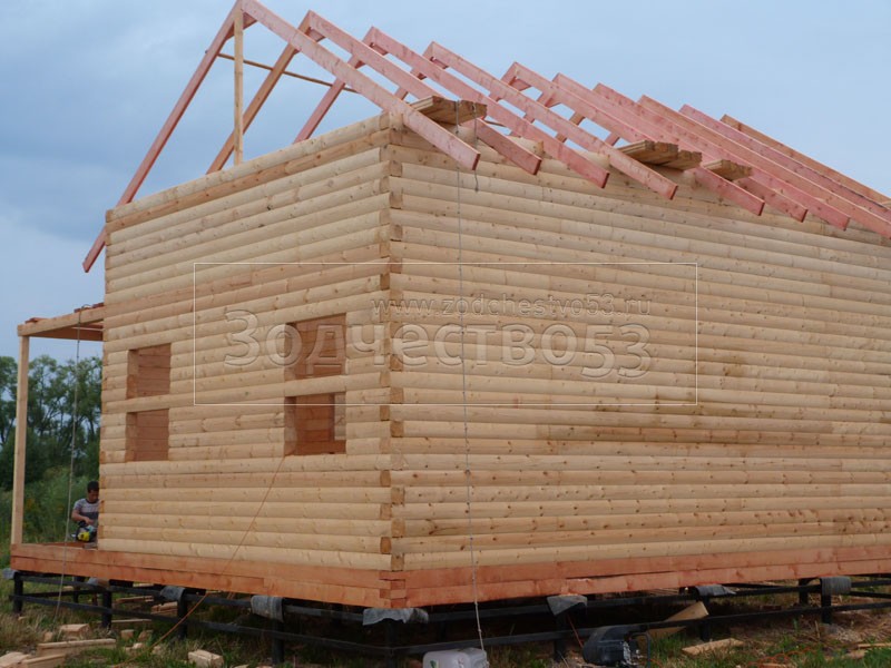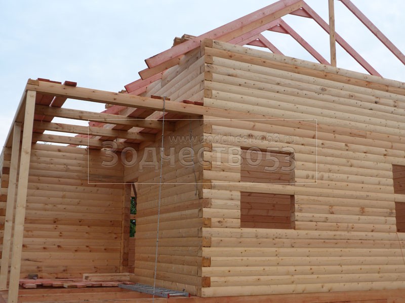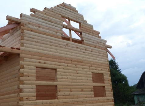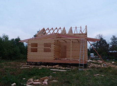 Cруб дома 8×8 по проекту Д-48 из профилированного бруса 150×150 с брусовыми фронтонами (5,5×8 дом с полуторным этажом под двухскатной крышей и веранда 2.5×8). Построен в августе 2014 г. в Ленинградской области, Ломоносовском районе, д. Верхняя Колония.