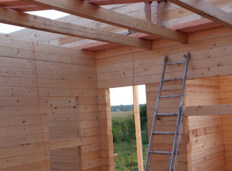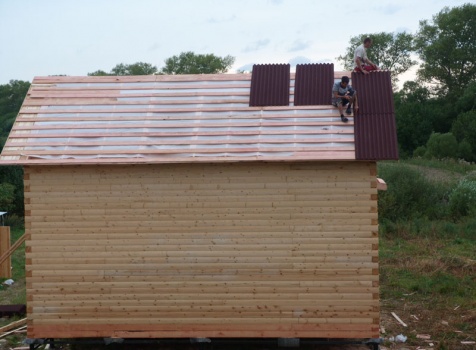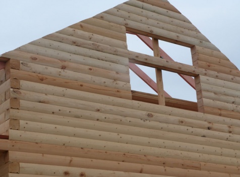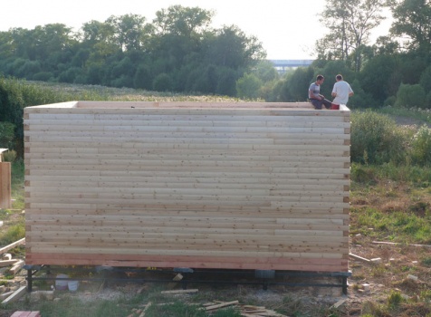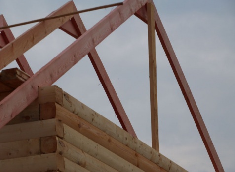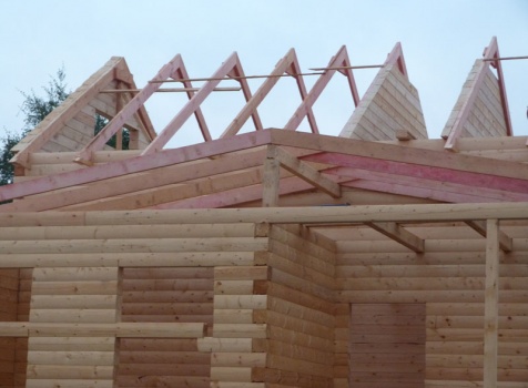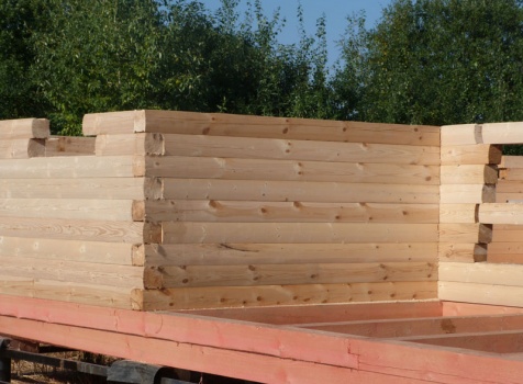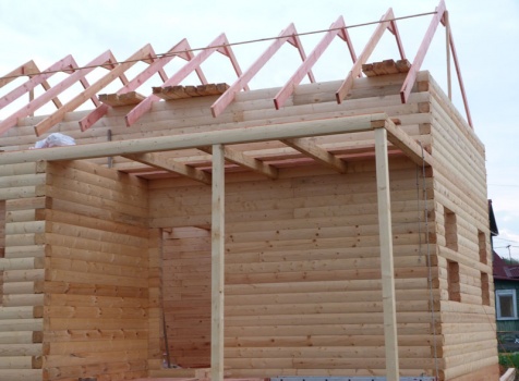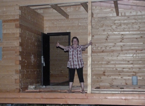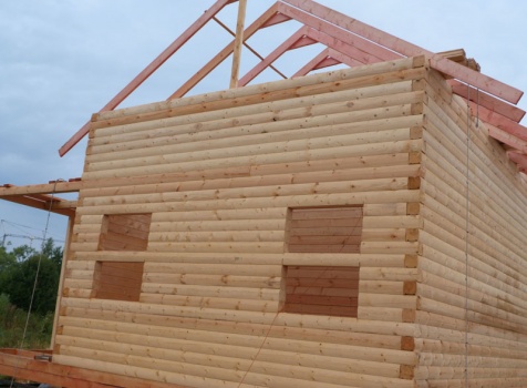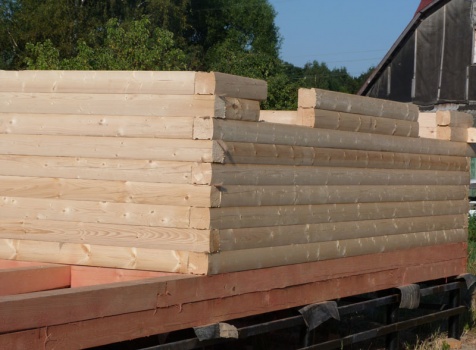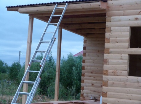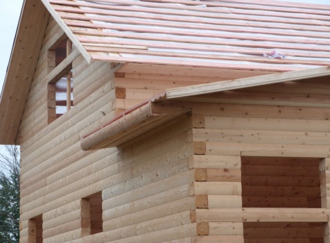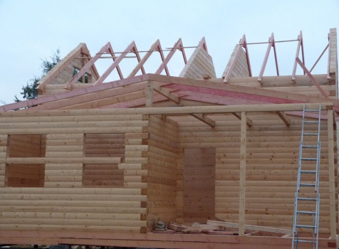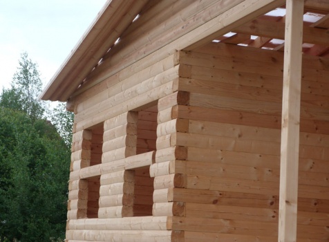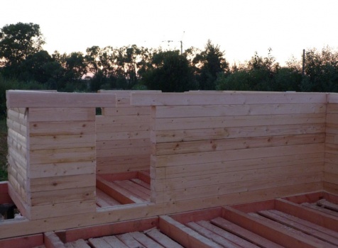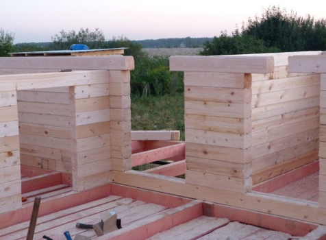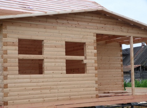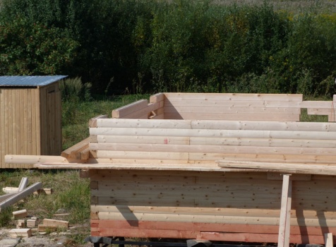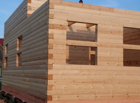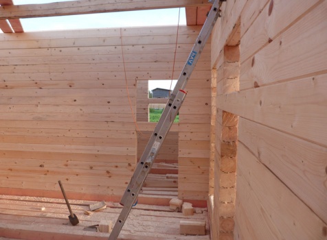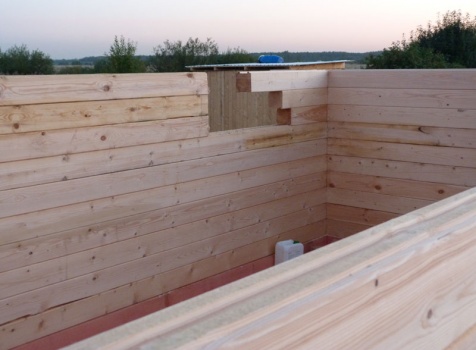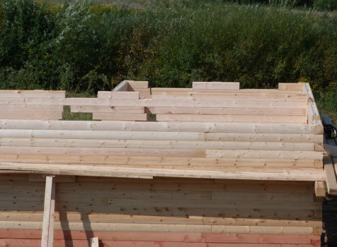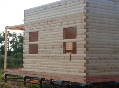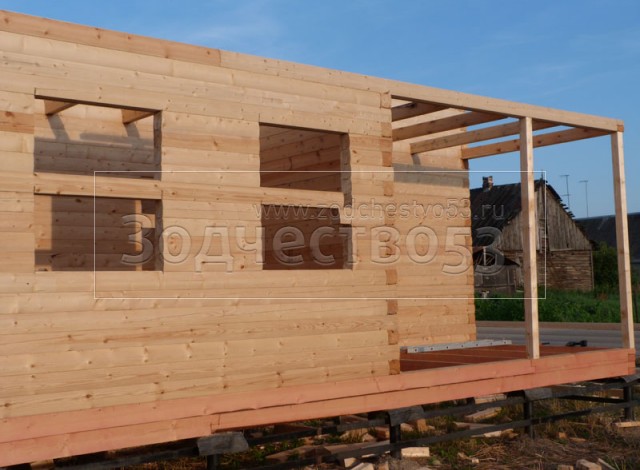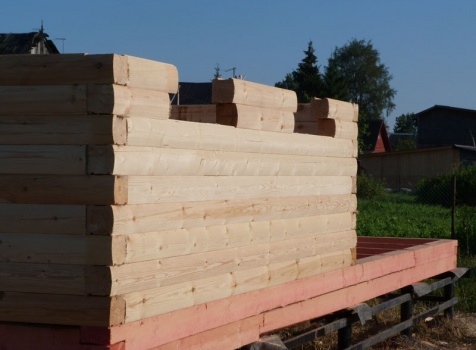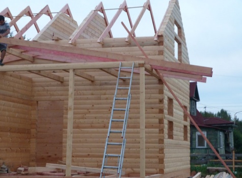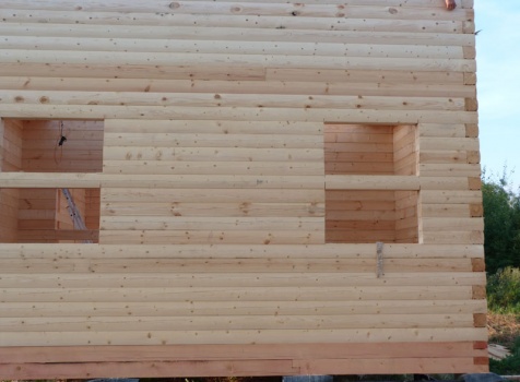 Cруб дома 8×8 по проекту Д-48 из профилированного бруса 150×150 с брусовыми фронтонами (5,5×8 дом с полуторным этажом под двухскатной крышей и веранда 2.5×8). Построен в августе 2014 г. в Ленинградской области, Ломоносовском районе, д. Верхняя Колония.