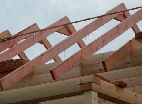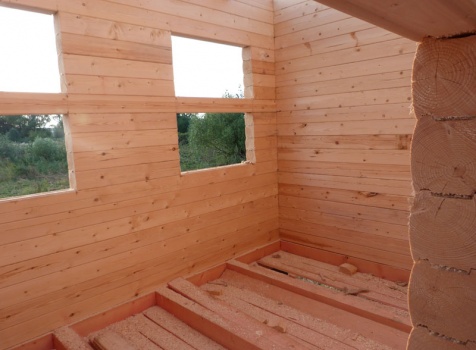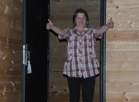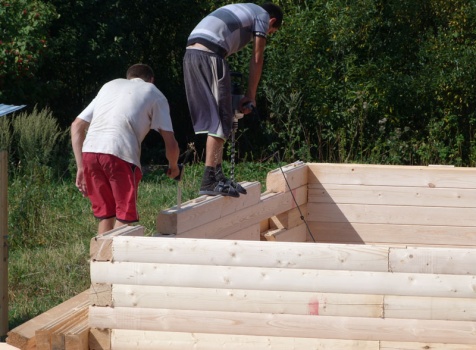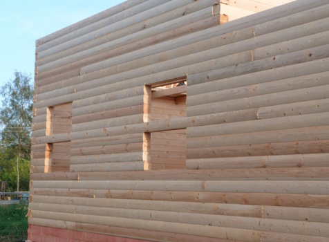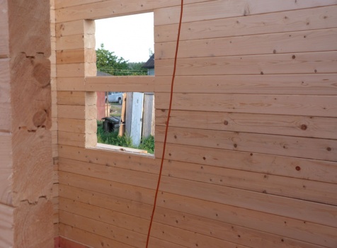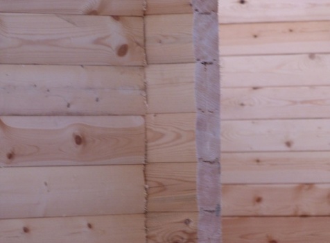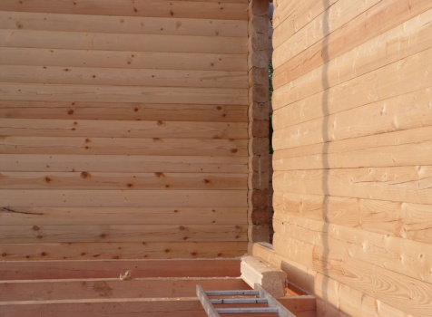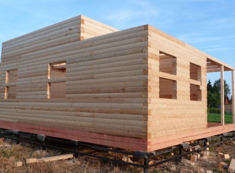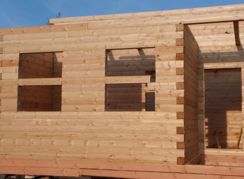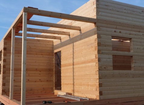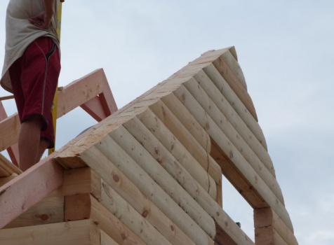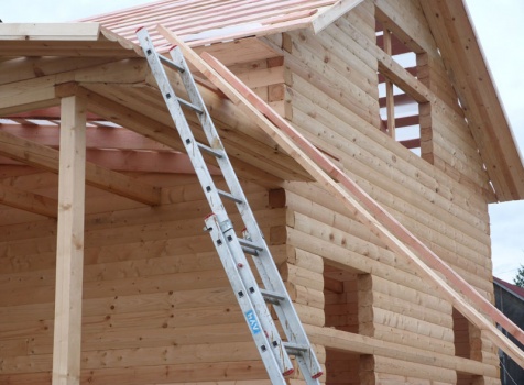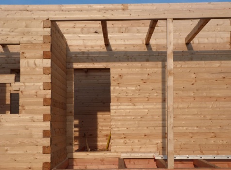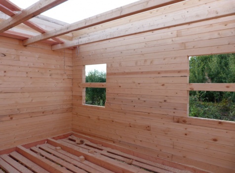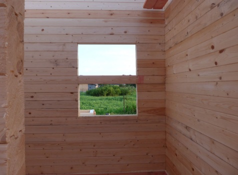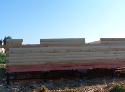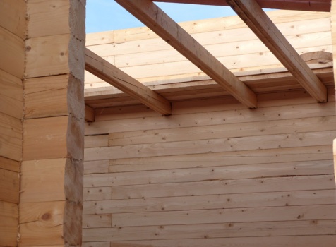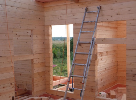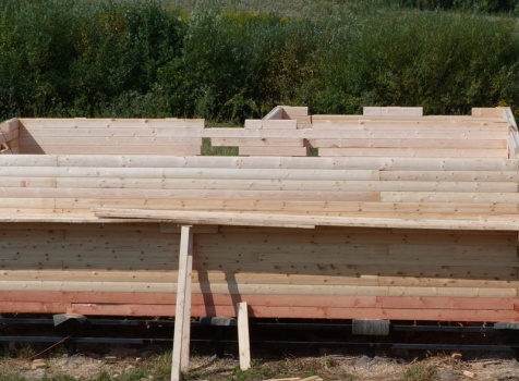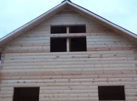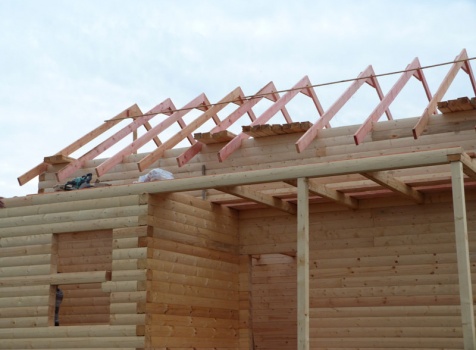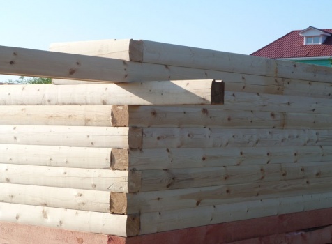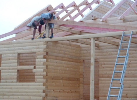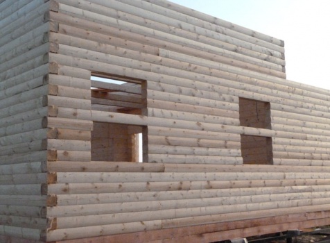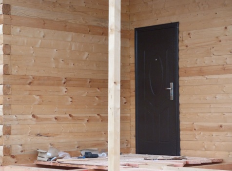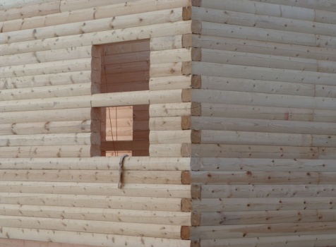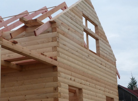 Cруб дома 8×8 по проекту Д-48 из профилированного бруса 150×150 с брусовыми фронтонами (5,5×8 дом с полуторным этажом под двухскатной крышей и веранда 2.5×8). Построен в августе 2014 г. в Ленинградской области, Ломоносовском районе, д. Верхняя Колония.