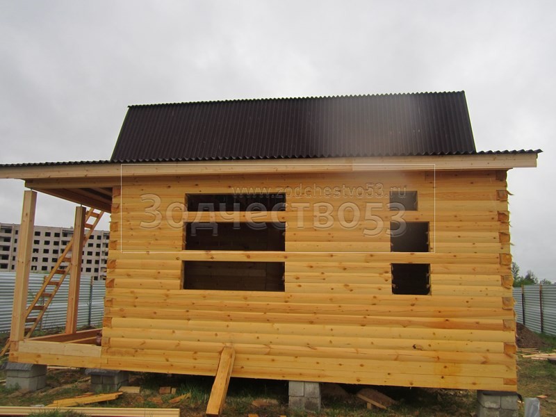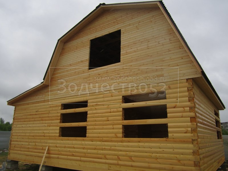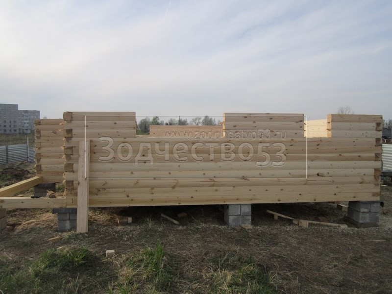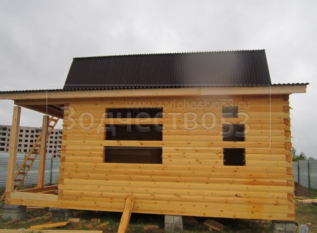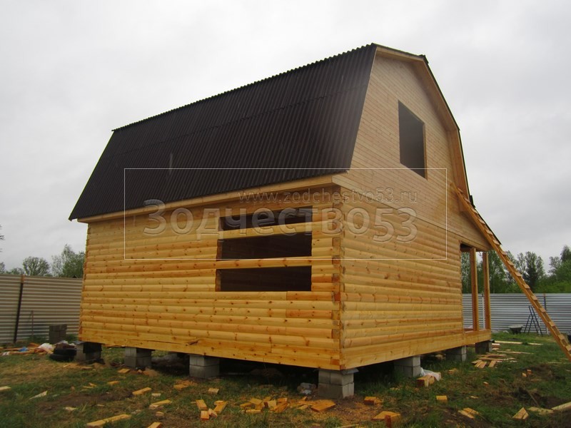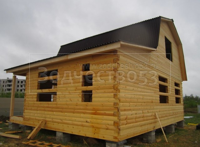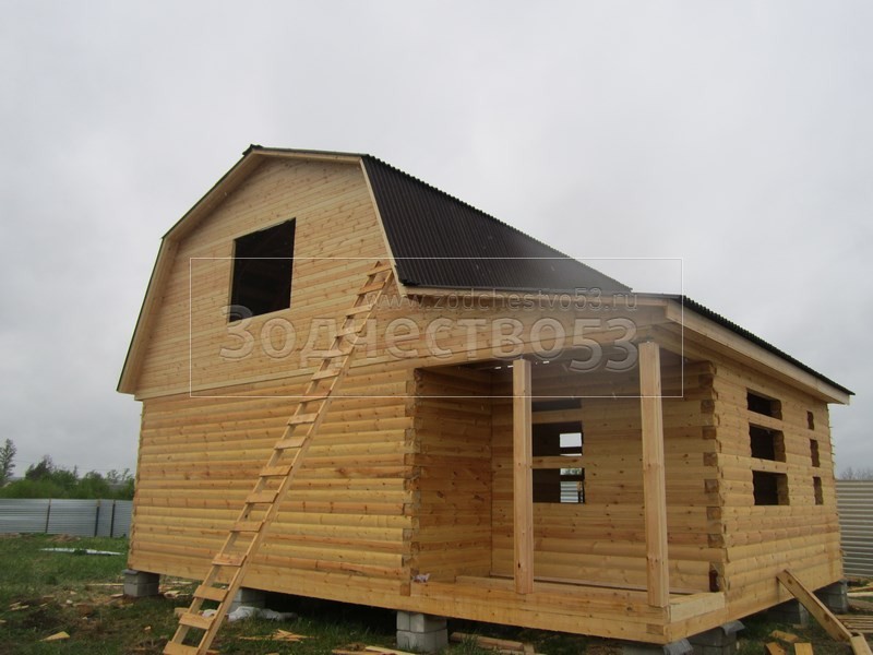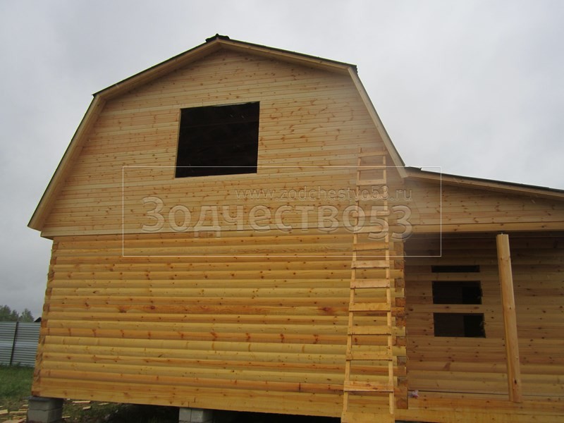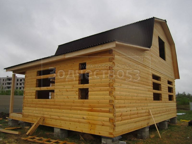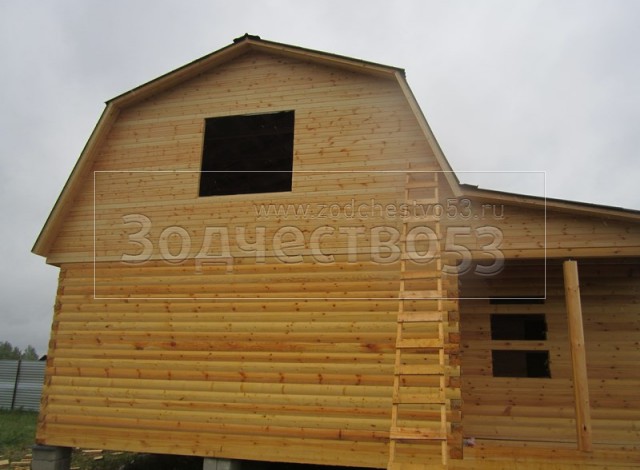 Cруб дома размерами 9×7 из профилированного бруса 150×150 (овал) (6×7 под ломанной крышей и террасой 3×7 под отдельной односкатной крышей ) по проекту Д-42. Построен: Новгородская область, г. Боровичи