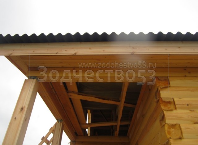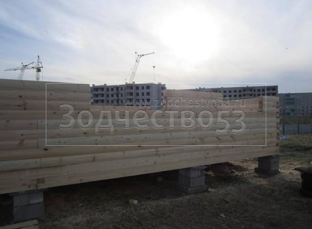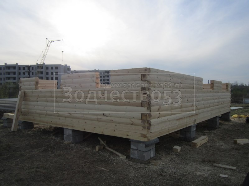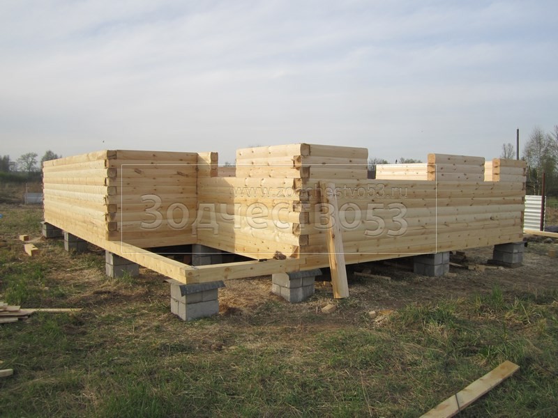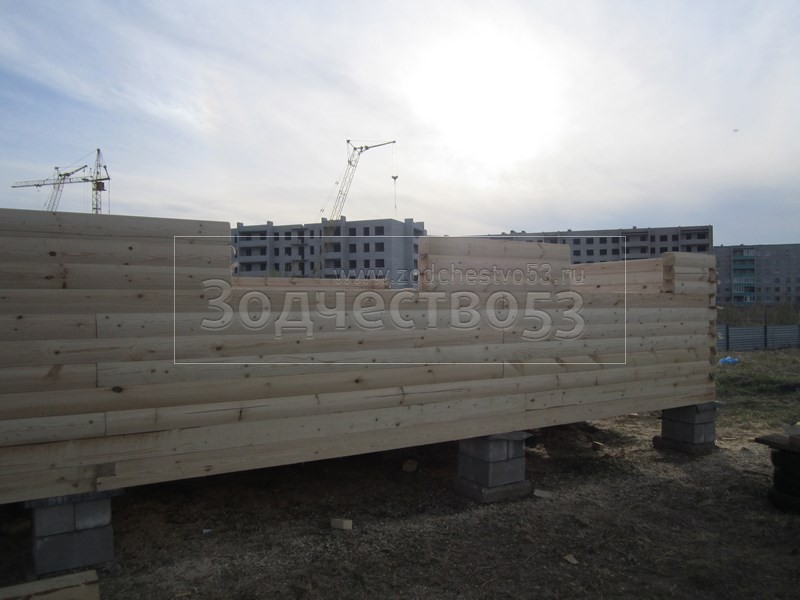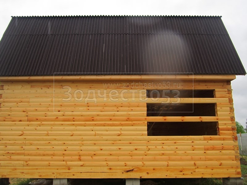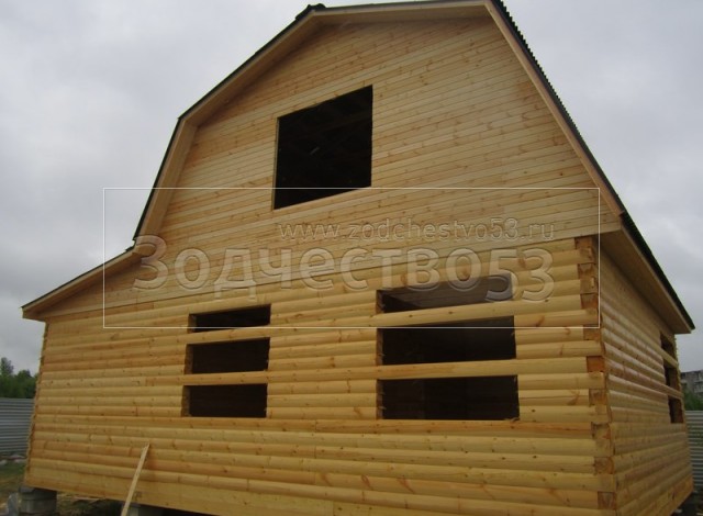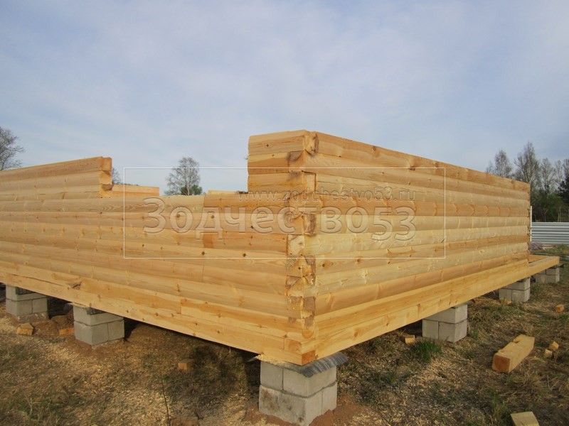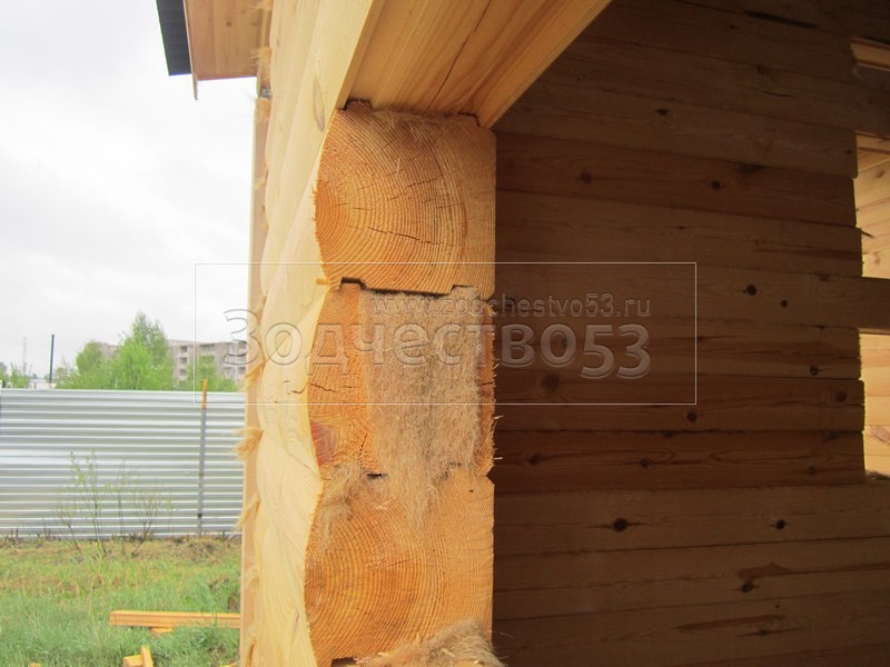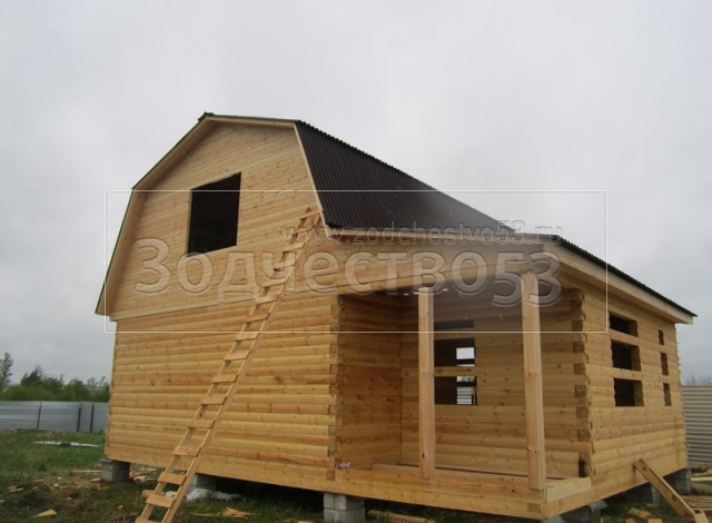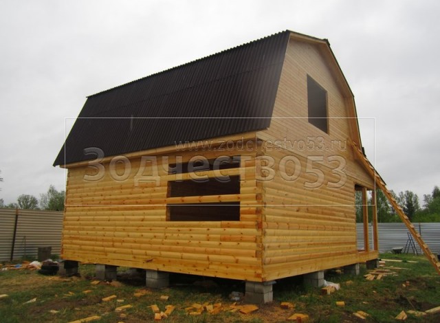 Cруб дома размерами 9×7 из профилированного бруса 150×150 (овал) (6×7 под ломанной крышей и террасой 3×7 под отдельной односкатной крышей ) по проекту Д-42. Построен: Новгородская область, г. Боровичи